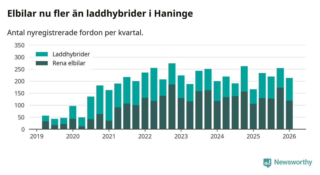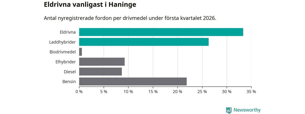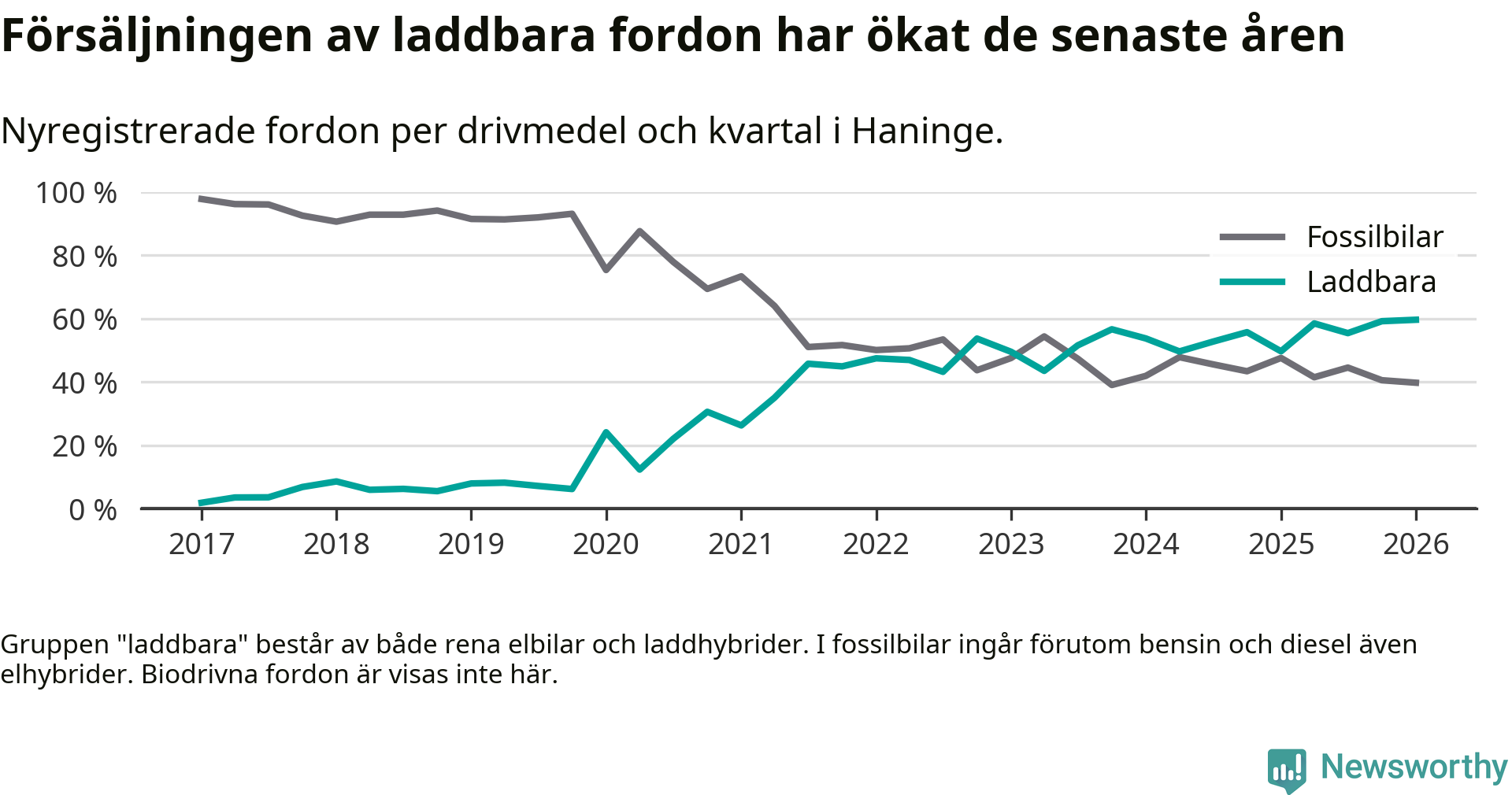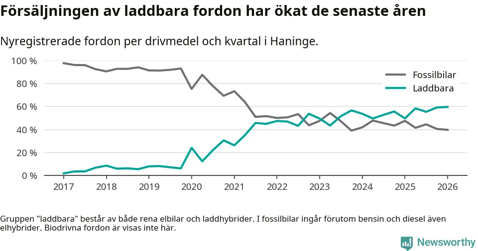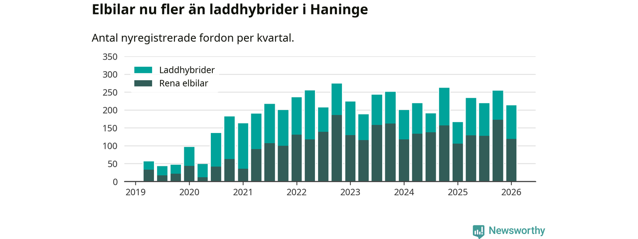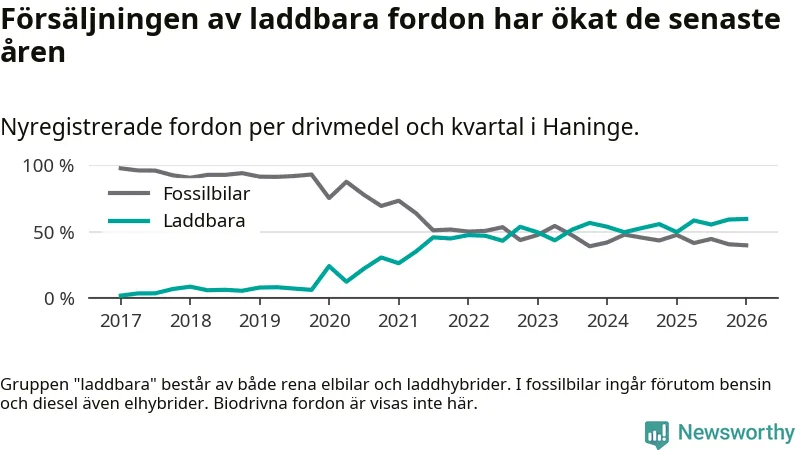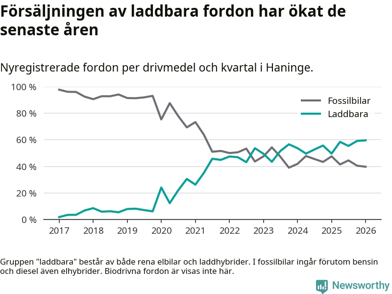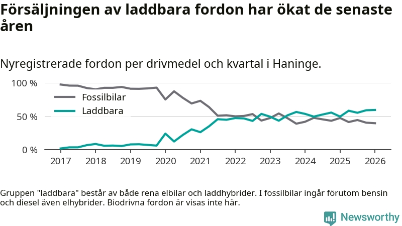 Under första kvartalet 2026 var 60 procent av alla nyregistrerade personbilar i Haninge laddbara (sammanlagt registrerades 357 nya bilar). Merparten av de laddbara bilarna var rena elbilar (33 procent av alla).