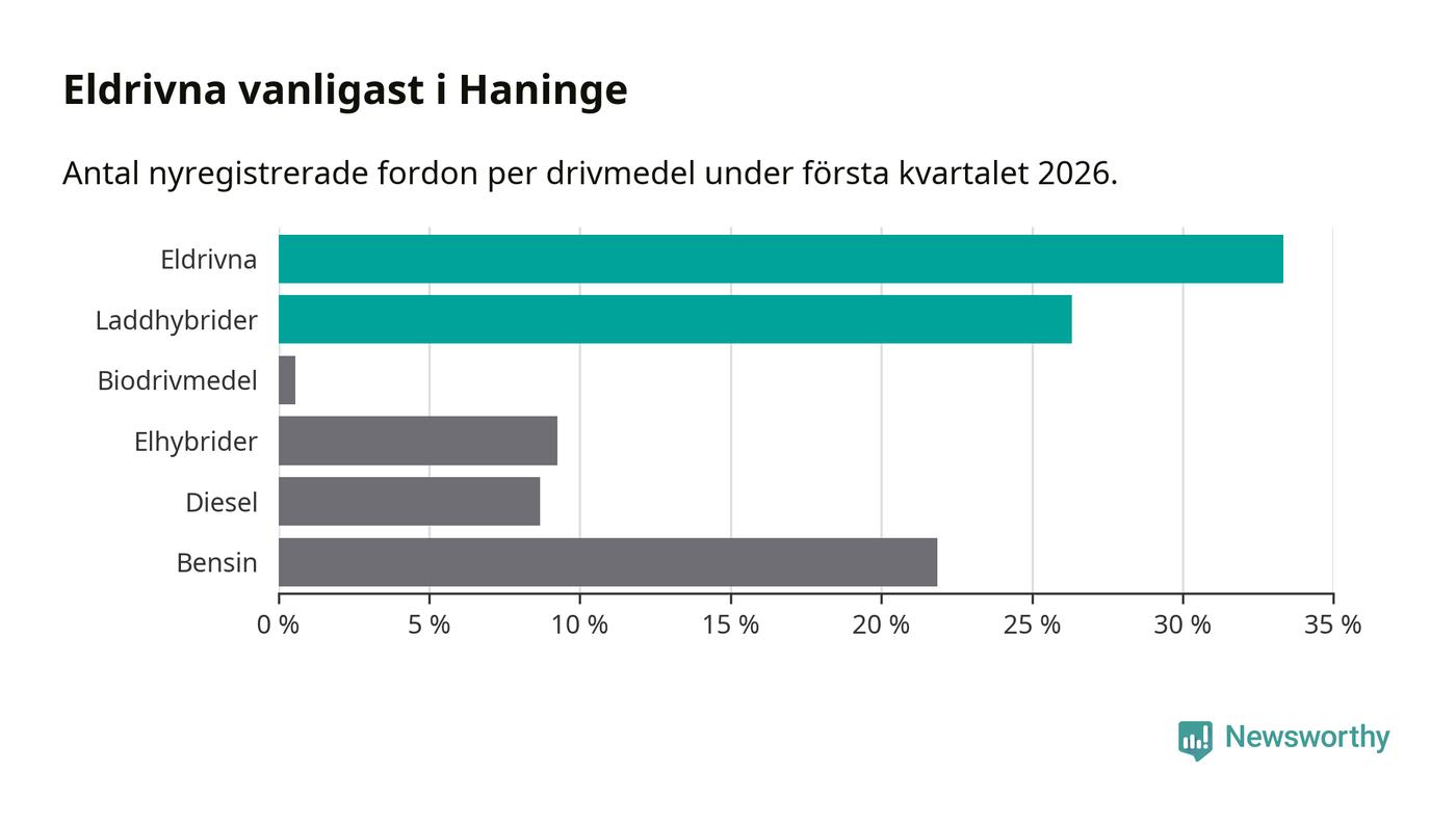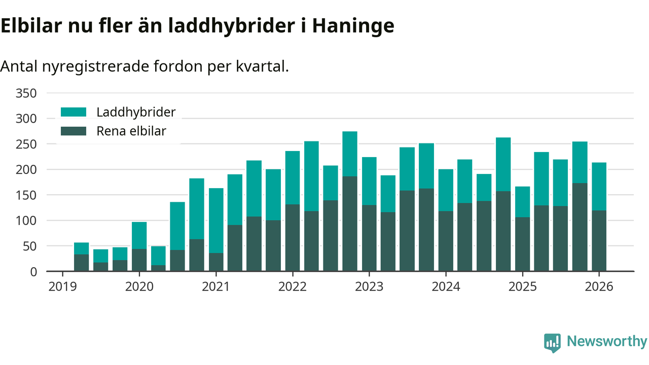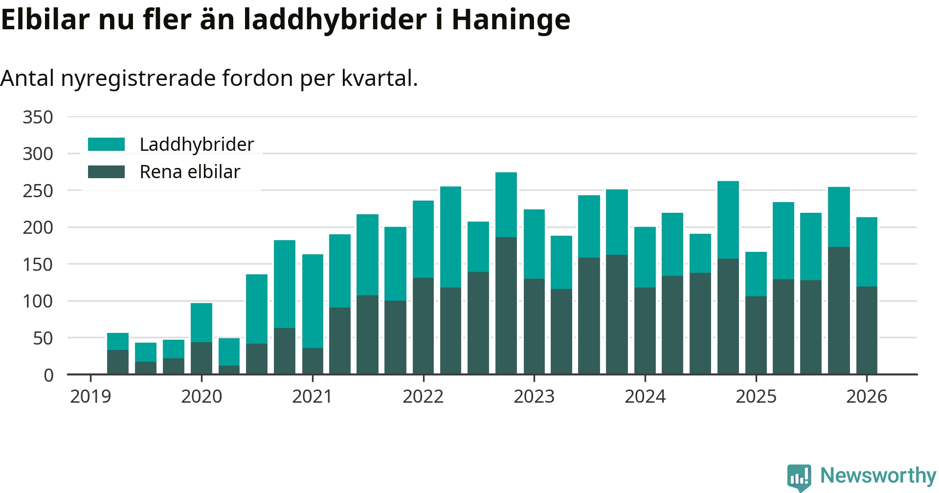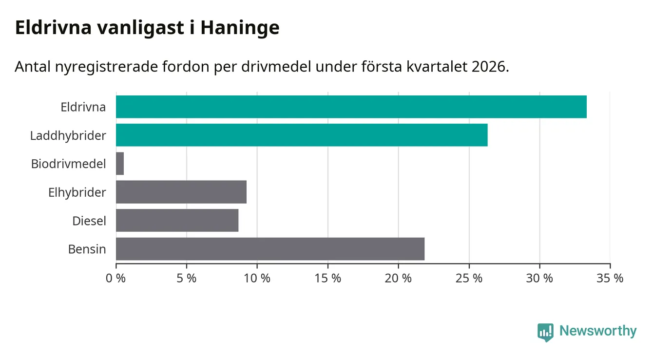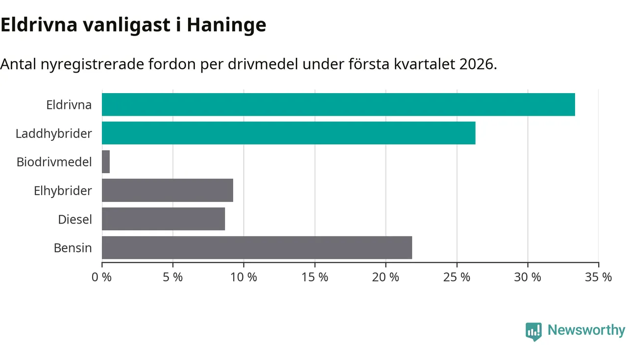 Under första kvartalet 2026 var 60 procent av alla nyregistrerade personbilar i Haninge laddbara (sammanlagt registrerades 357 nya bilar). Merparten av de laddbara bilarna var rena elbilar (33 procent av alla).