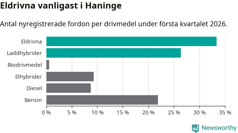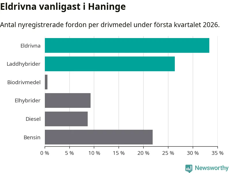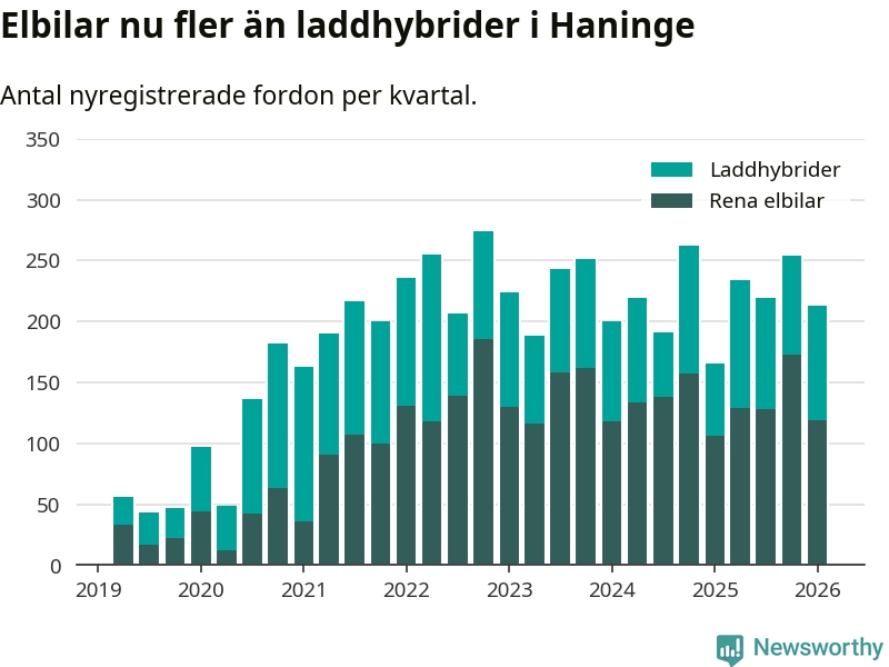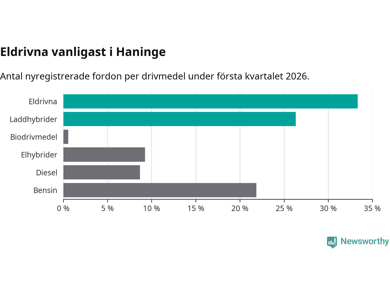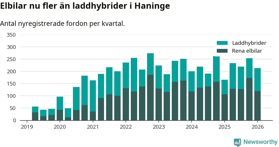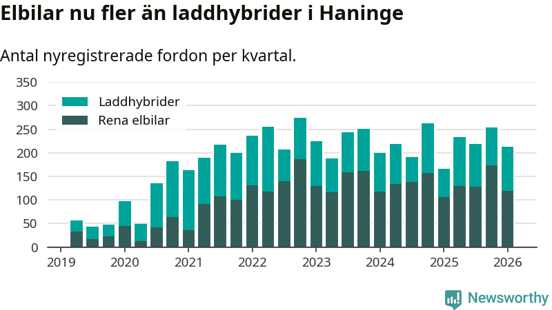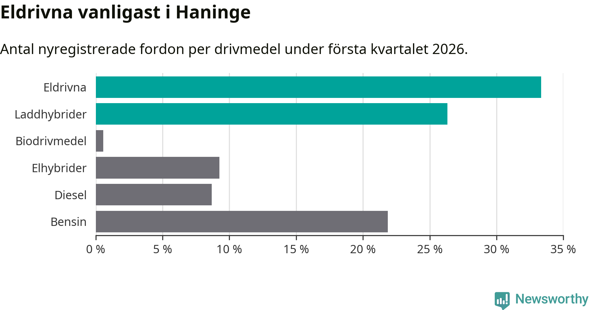 Under första kvartalet 2026 var 60 procent av alla nyregistrerade personbilar i Haninge laddbara (sammanlagt registrerades 357 nya bilar). Merparten av de laddbara bilarna var rena elbilar (33 procent av alla).