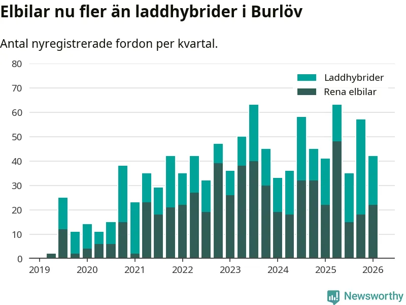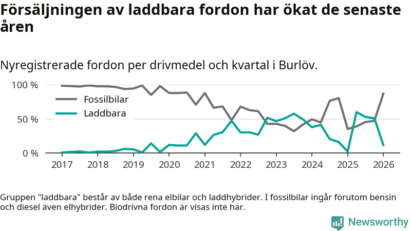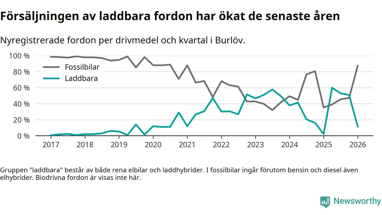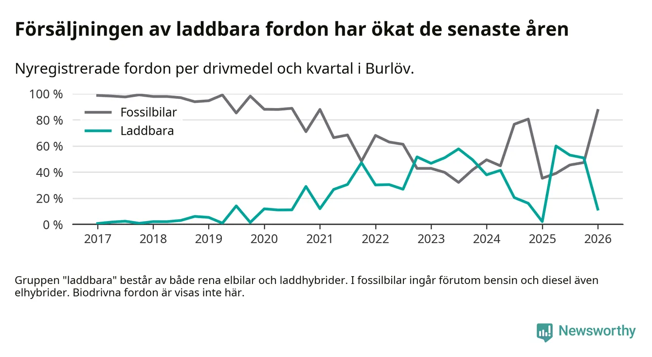 I Burlöv minskade andelen laddbara bilar under första kvartalet jämfört med kvartalet innan (−39,3 procentenheter). Nyregistreringen peakade under andra kvartalet 2025 då 60 procent av de nya bilarna var laddbara.