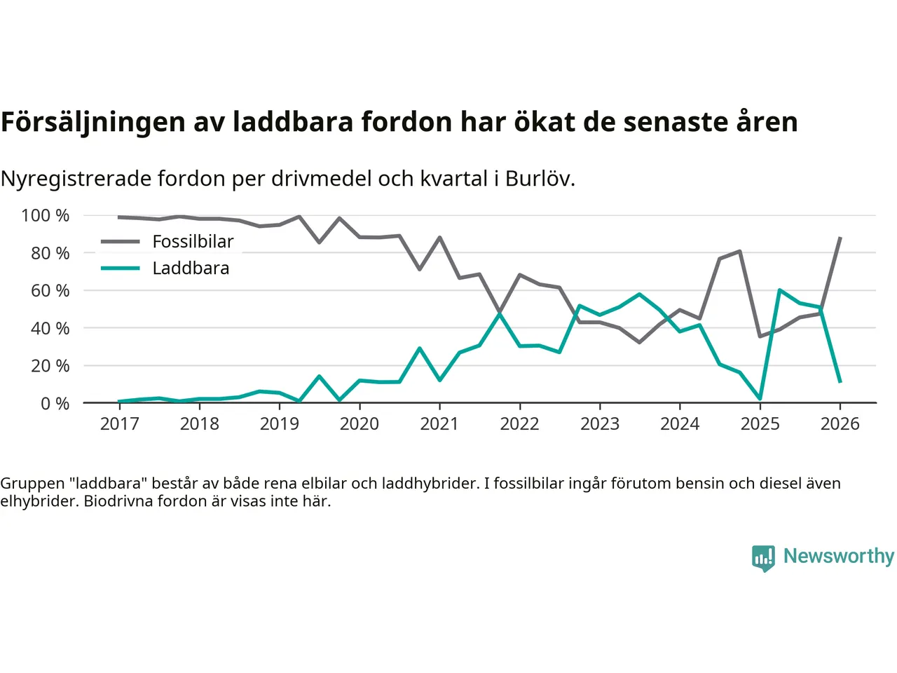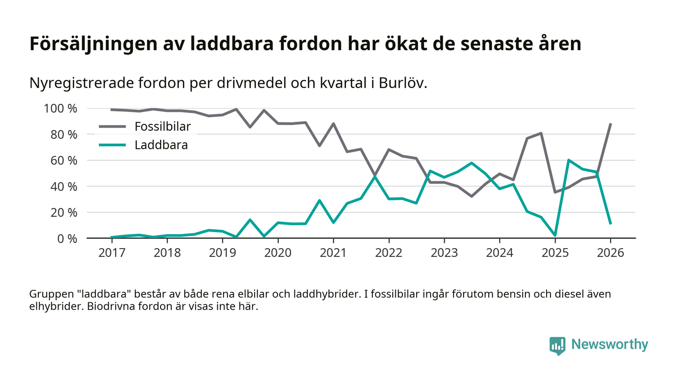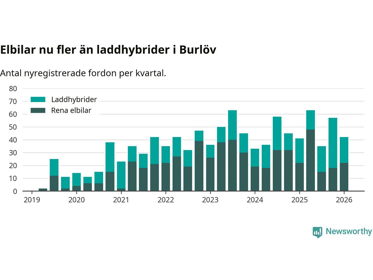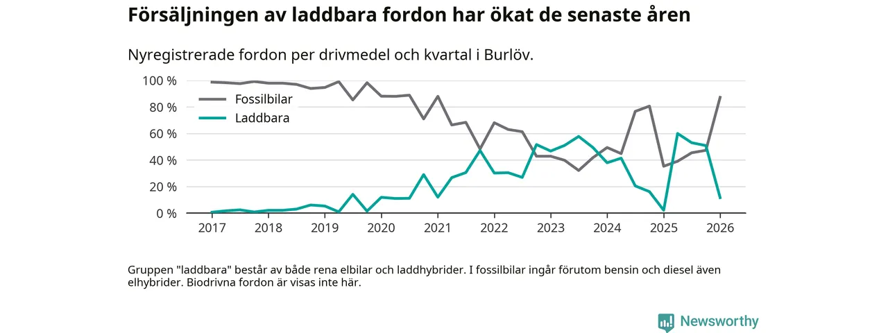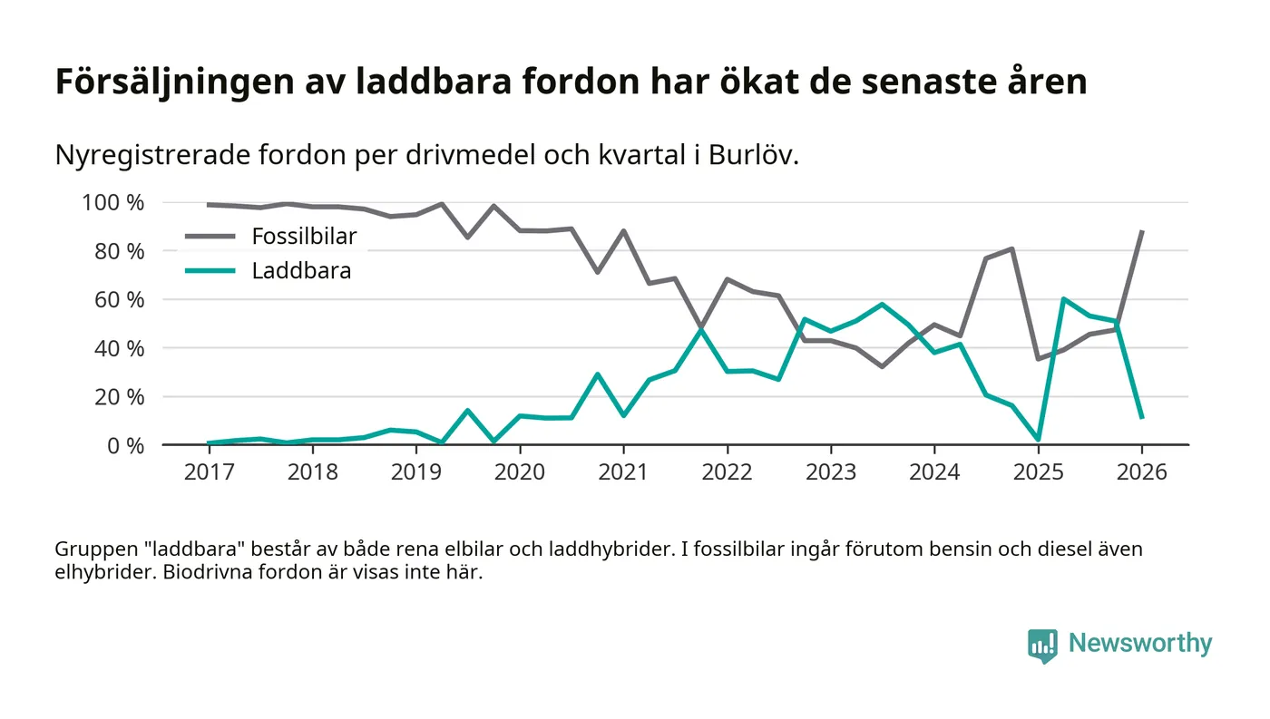 Under första kvartalet 2026 var 12 procent av alla nyregistrerade personbilar i Burlöv laddbara (sammanlagt registrerades 361 nya bilar). Merparten av de laddbara bilarna var rena elbilar (6 procent av alla).