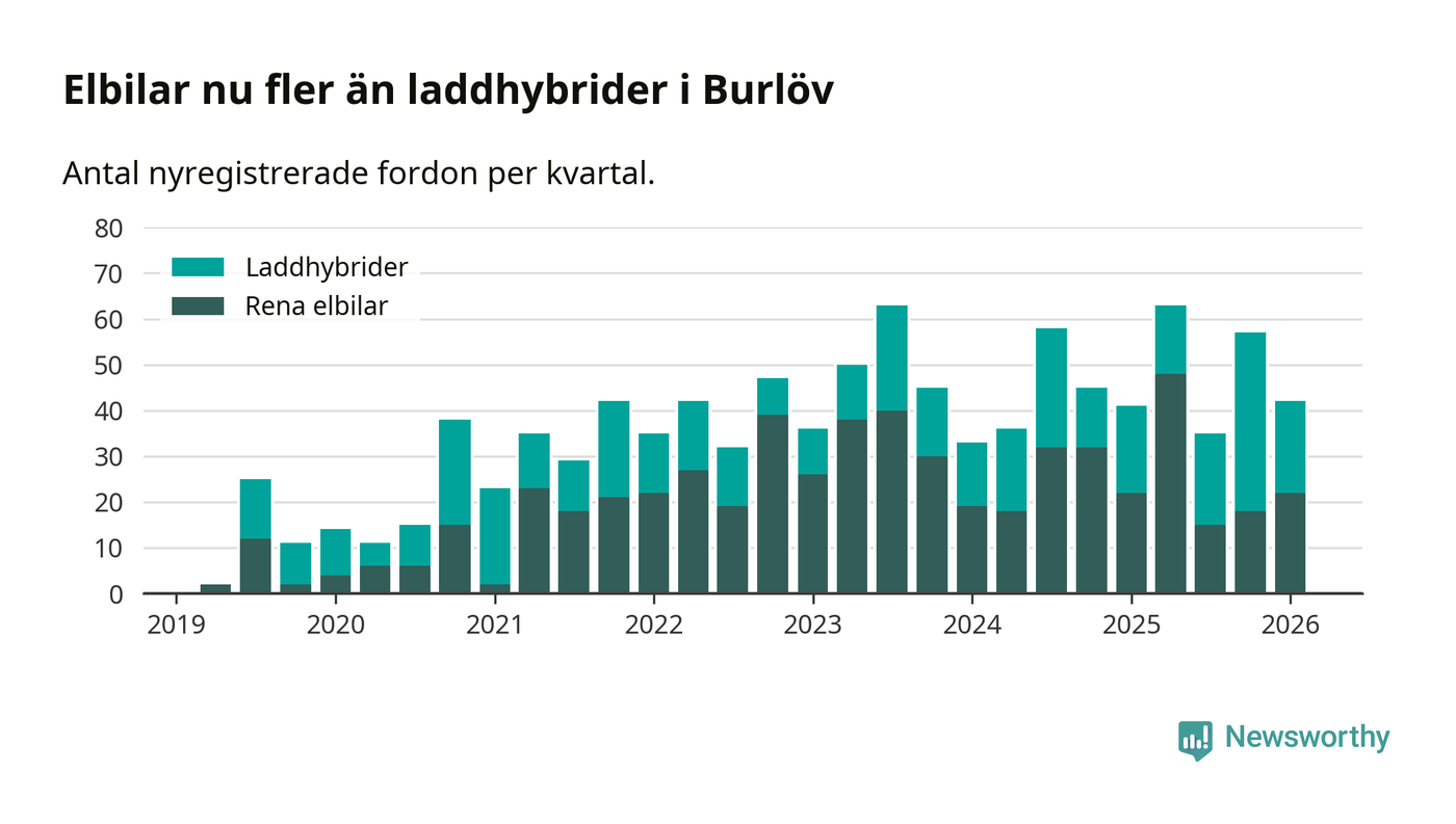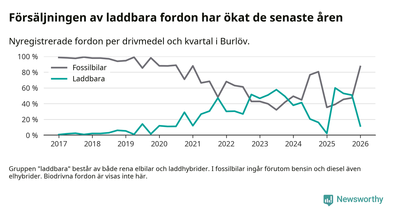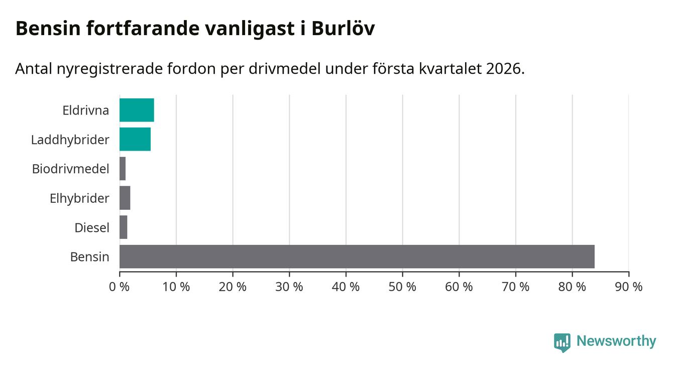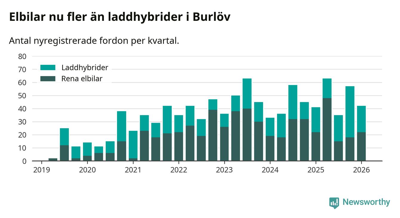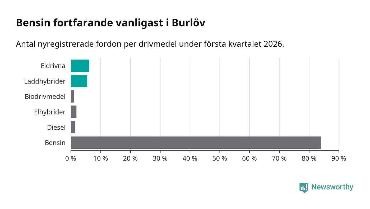 Under första kvartalet 2026 var 12 procent av alla nyregistrerade personbilar i Burlöv laddbara (sammanlagt registrerades 361 nya bilar). Merparten av de laddbara bilarna var rena elbilar (6 procent av alla).