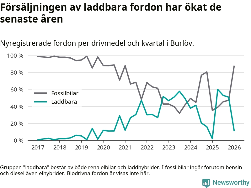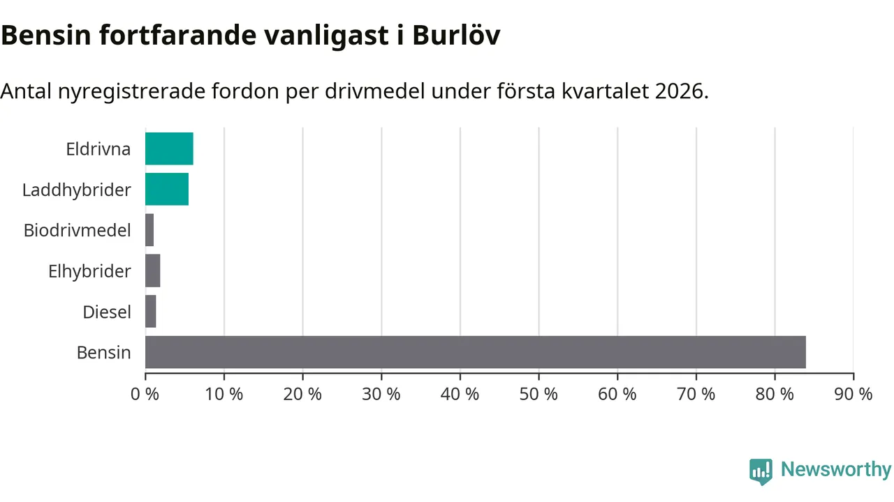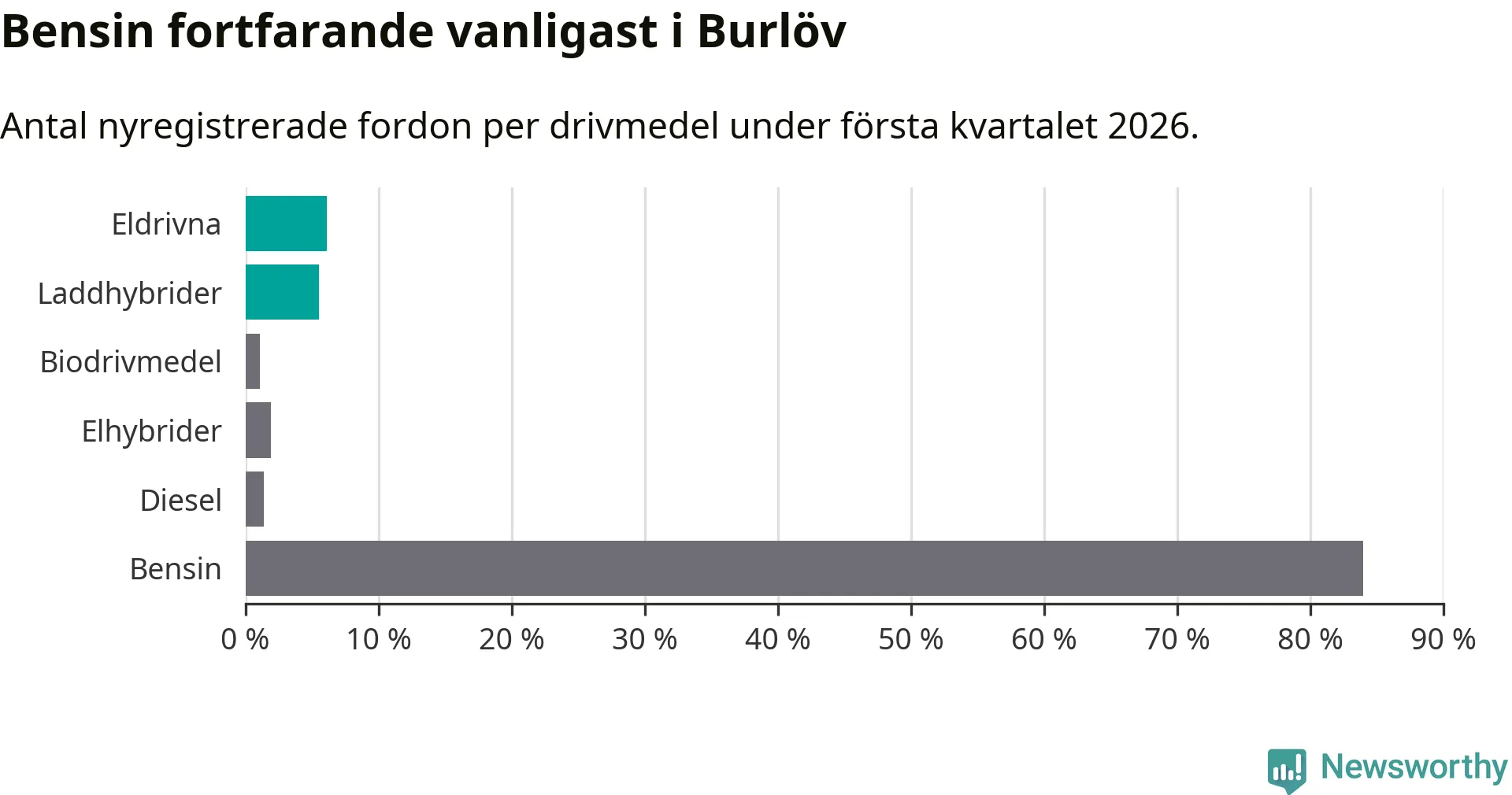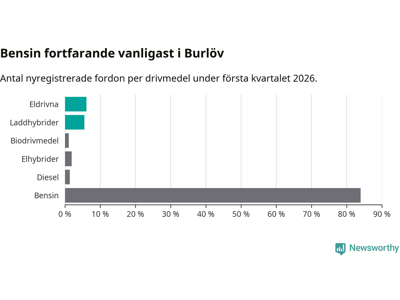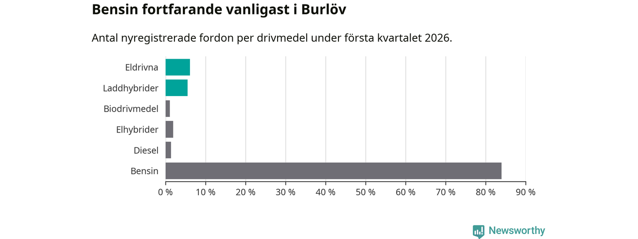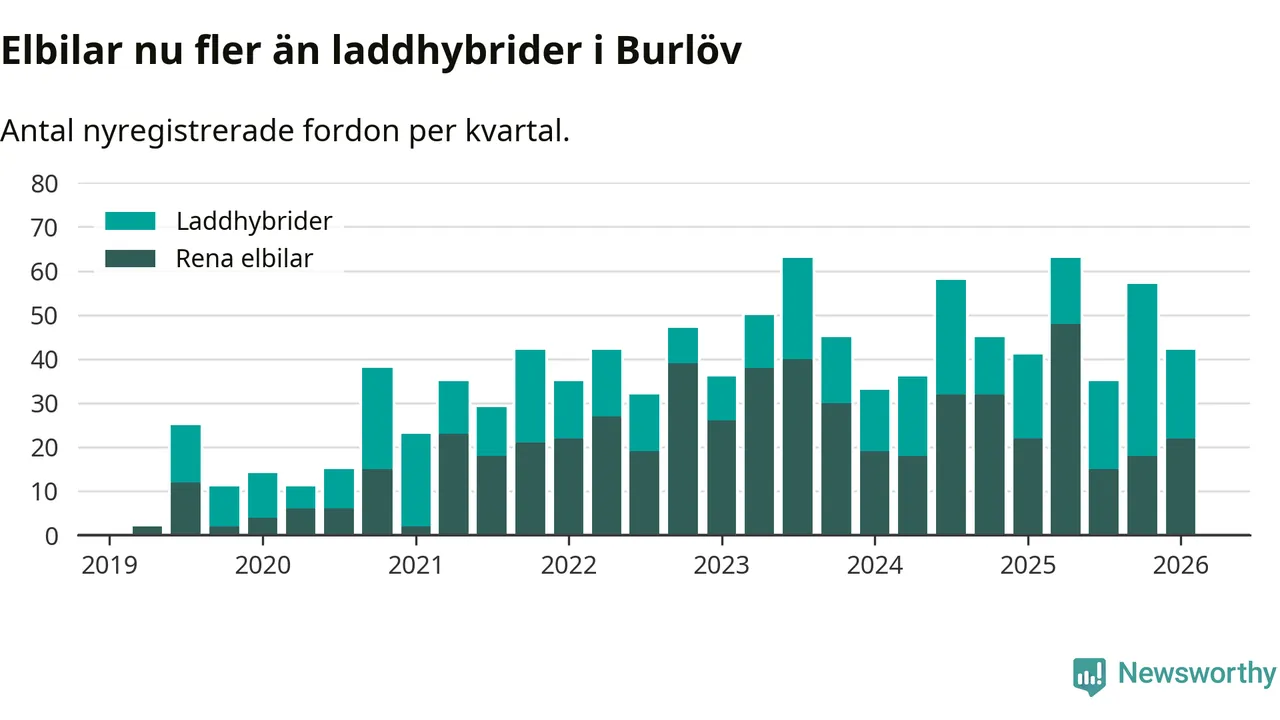 Under första kvartalet 2026 var 12 procent av alla nyregistrerade personbilar i Burlöv laddbara (sammanlagt registrerades 361 nya bilar). Merparten av de laddbara bilarna var rena elbilar (6 procent av alla).