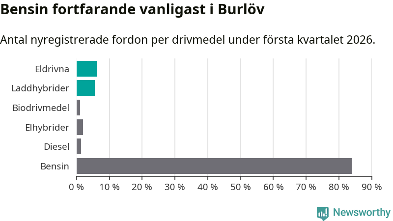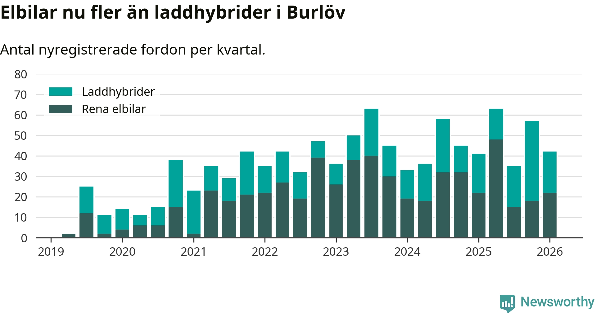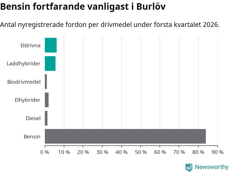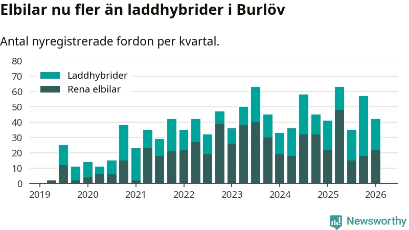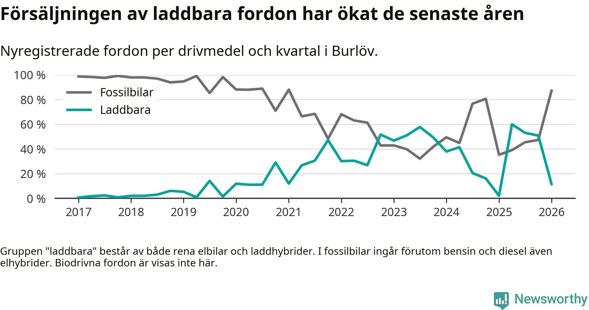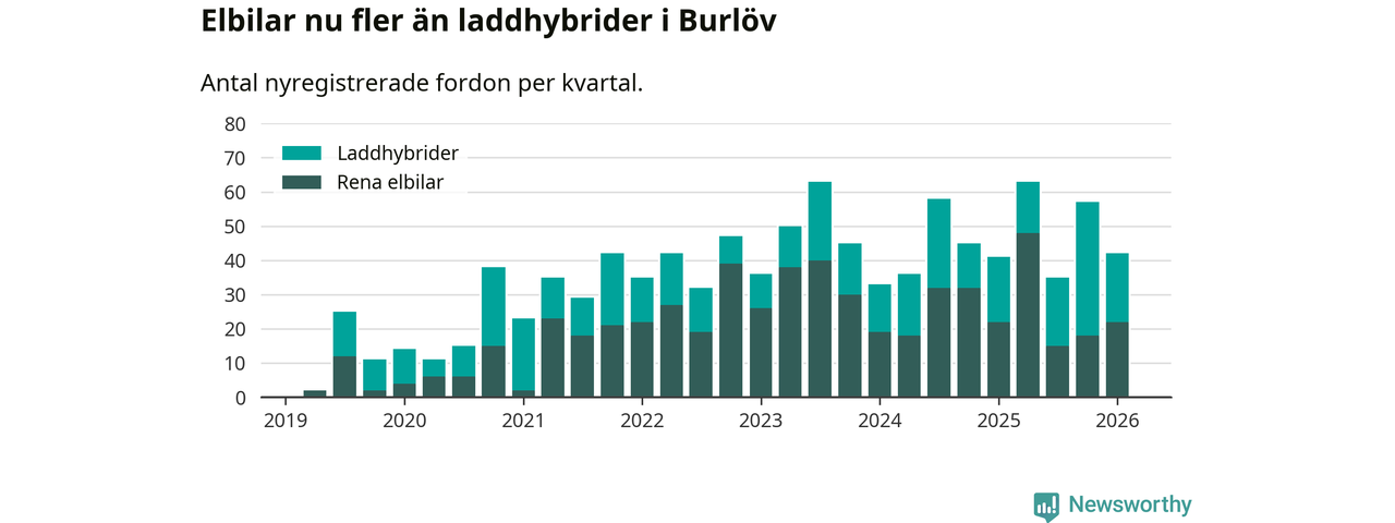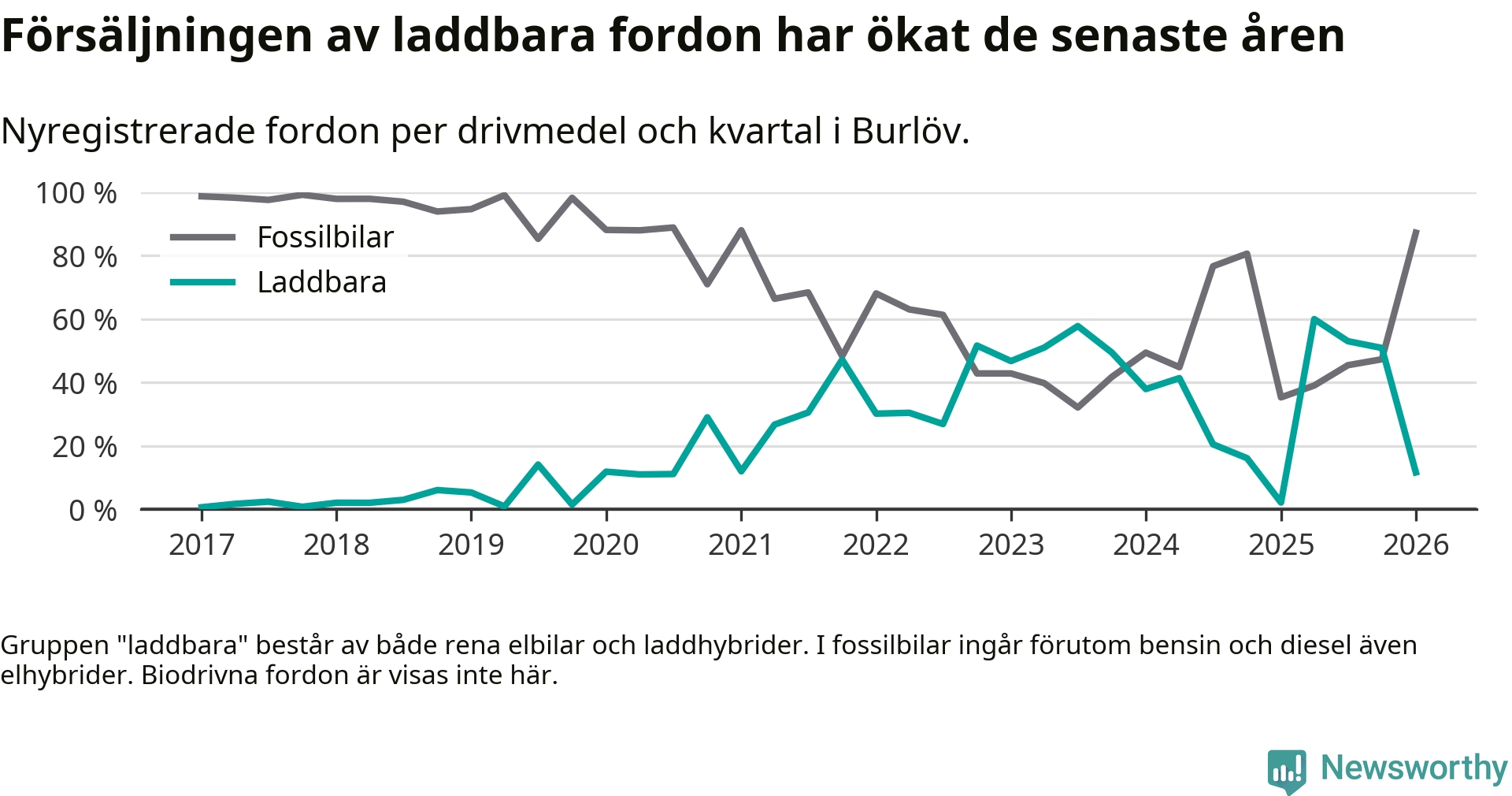 Under första kvartalet 2026 var 12 procent av alla nyregistrerade personbilar i Burlöv laddbara (sammanlagt registrerades 361 nya bilar). Merparten av de laddbara bilarna var rena elbilar (6 procent av alla).