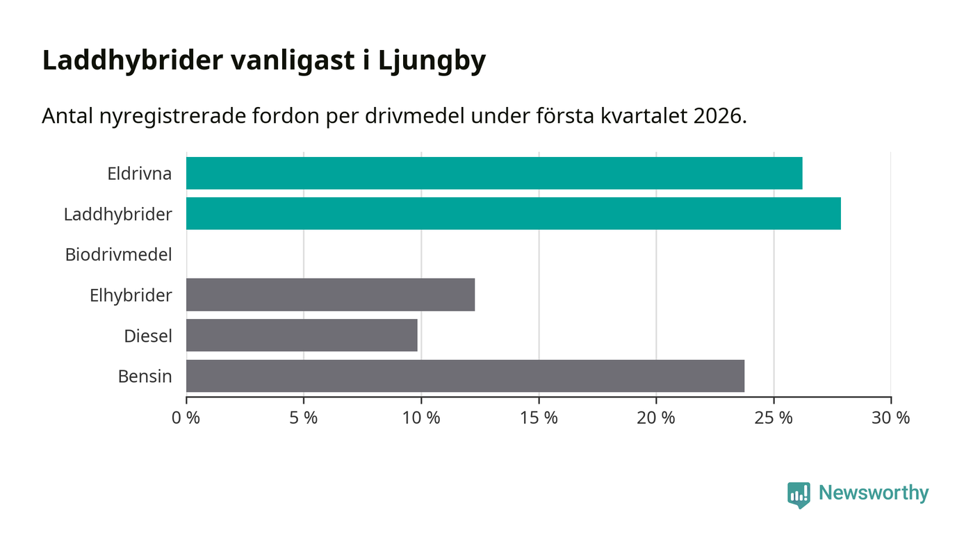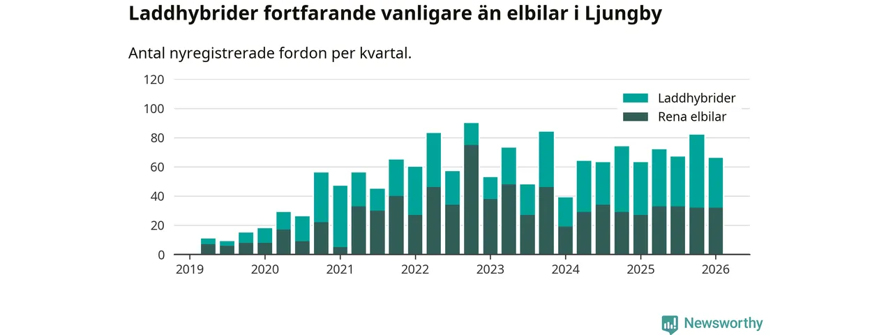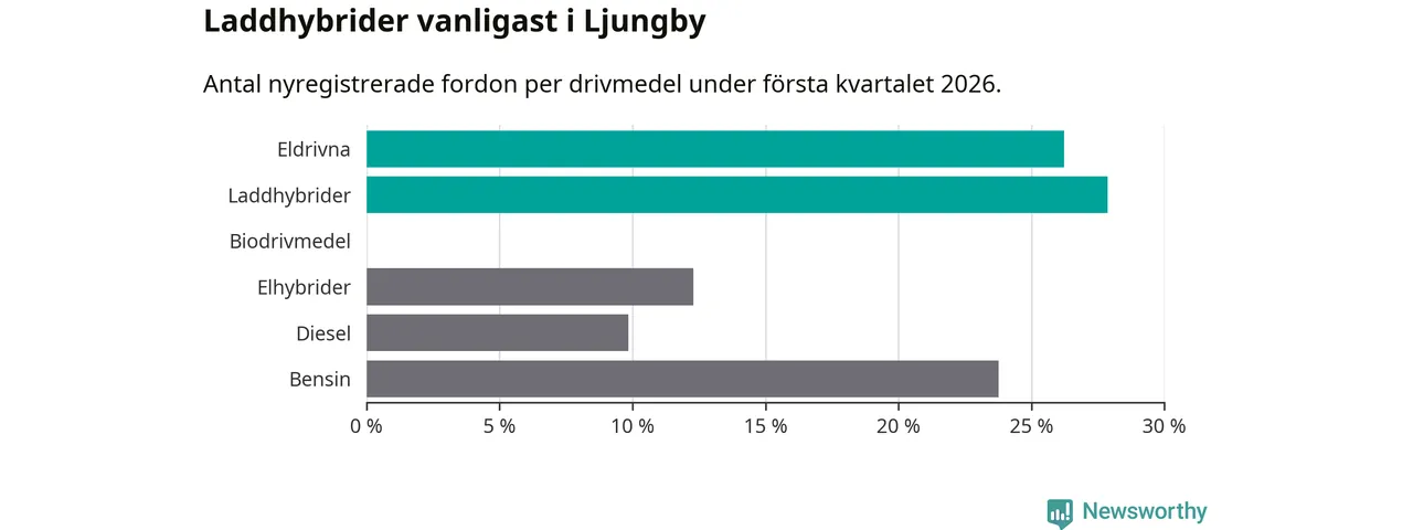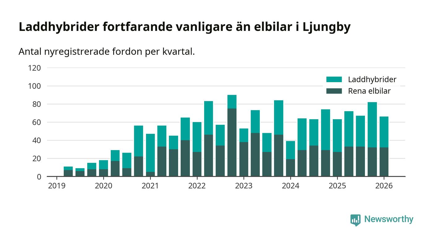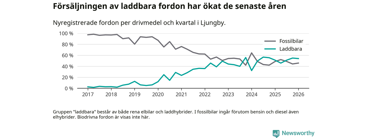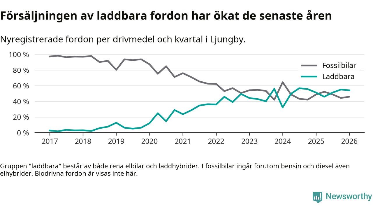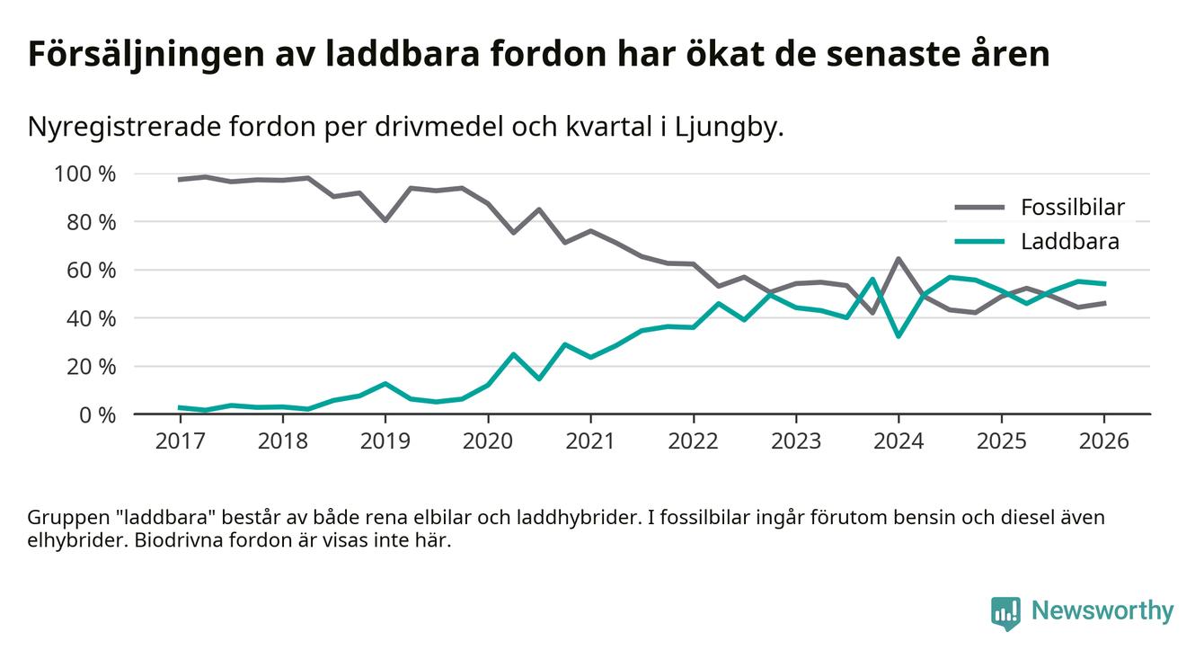 Under första kvartalet 2026 var 54 procent av alla nyregistrerade personbilar i Ljungby laddbara (sammanlagt registrerades 122 nya bilar). Merparten av de laddbara bilarna var så kallade laddhybrider, det vill säga fordon som går att ladda och köra på el, men som även har en förbränningsmotor. 26 procent av alla nya bilar var rena elbilar.