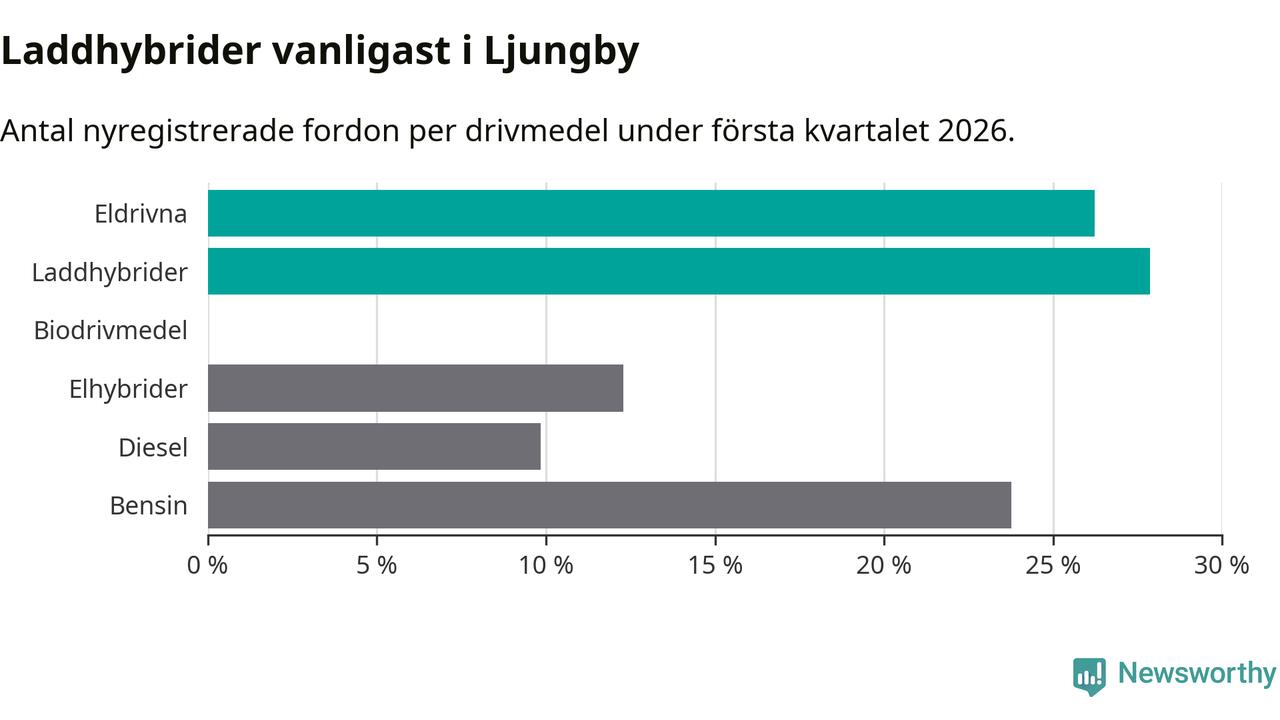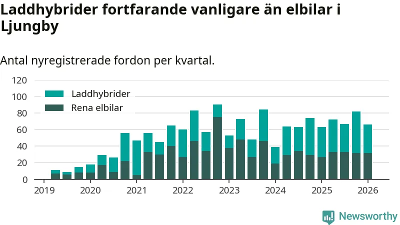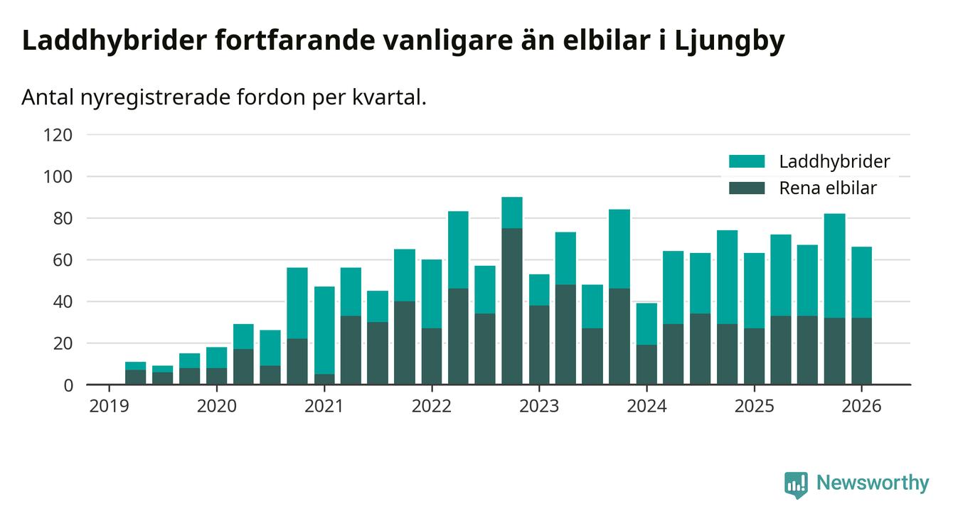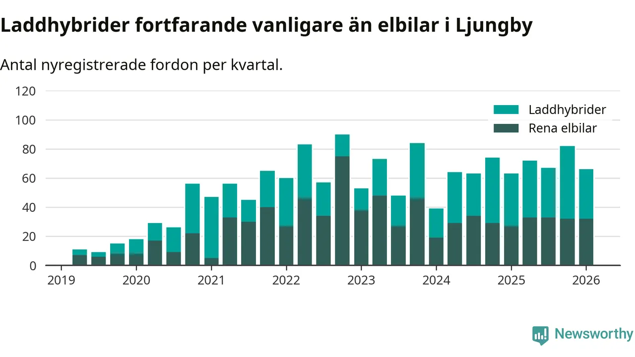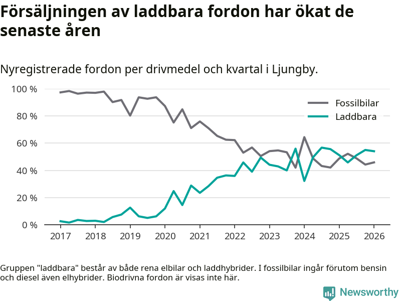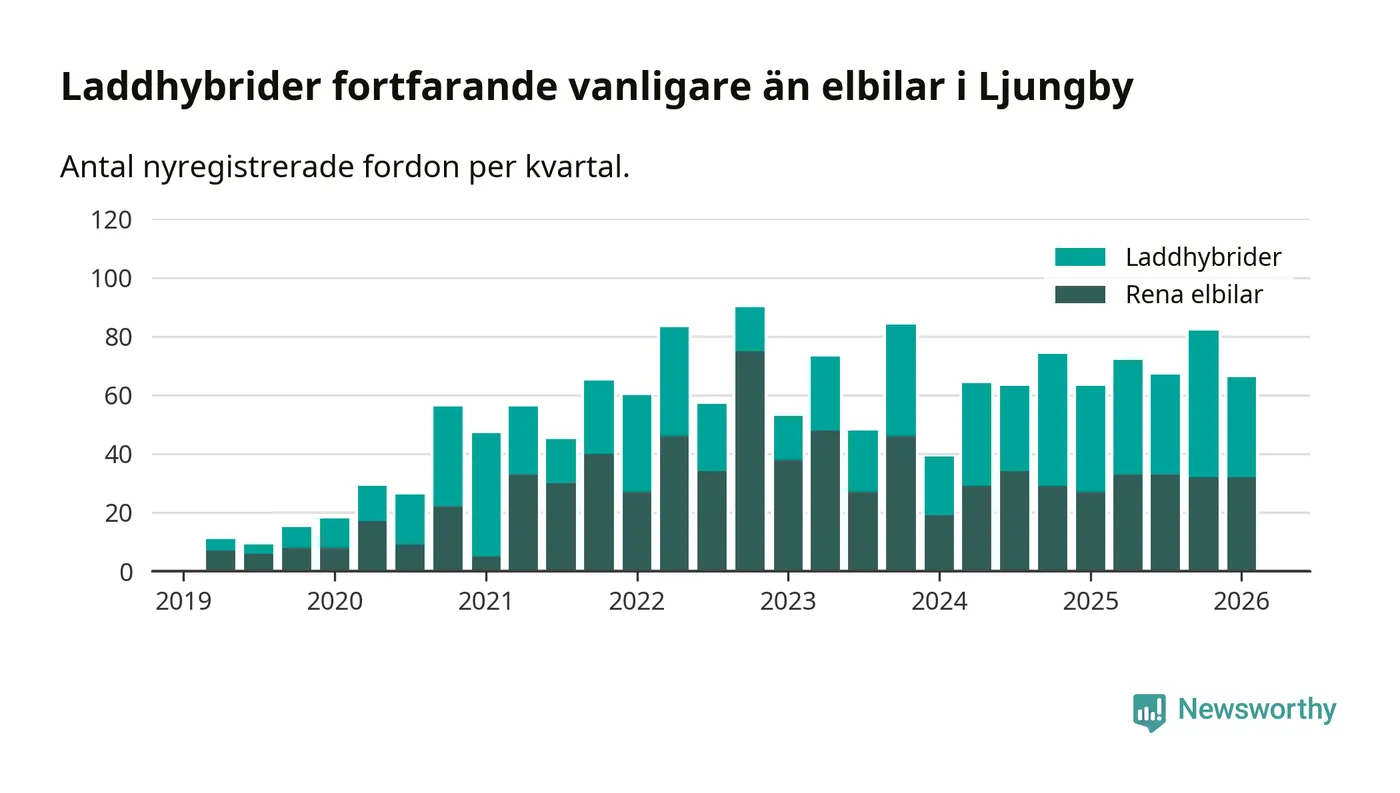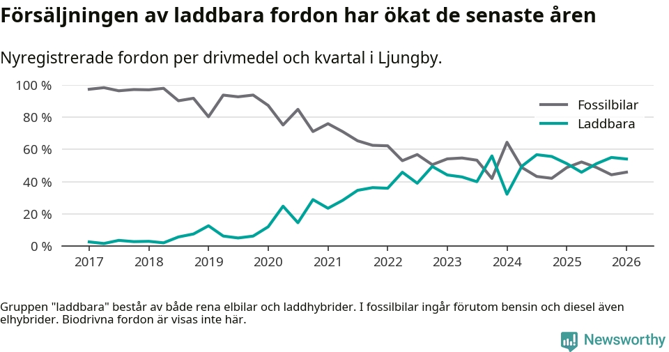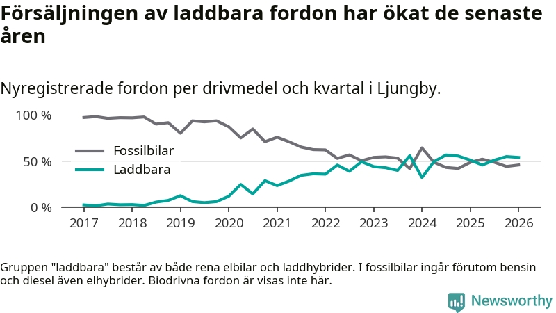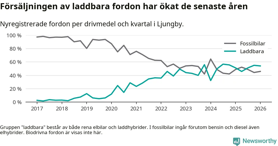 Under första kvartalet 2026 var 54 procent av alla nyregistrerade personbilar i Ljungby laddbara (sammanlagt registrerades 122 nya bilar). Merparten av de laddbara bilarna var så kallade laddhybrider, det vill säga fordon som går att ladda och köra på el, men som även har en förbränningsmotor. 26 procent av alla nya bilar var rena elbilar.