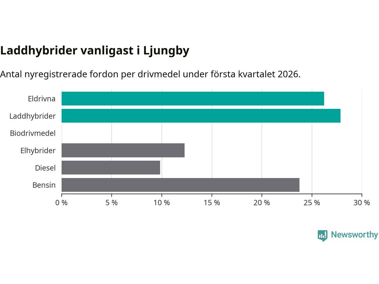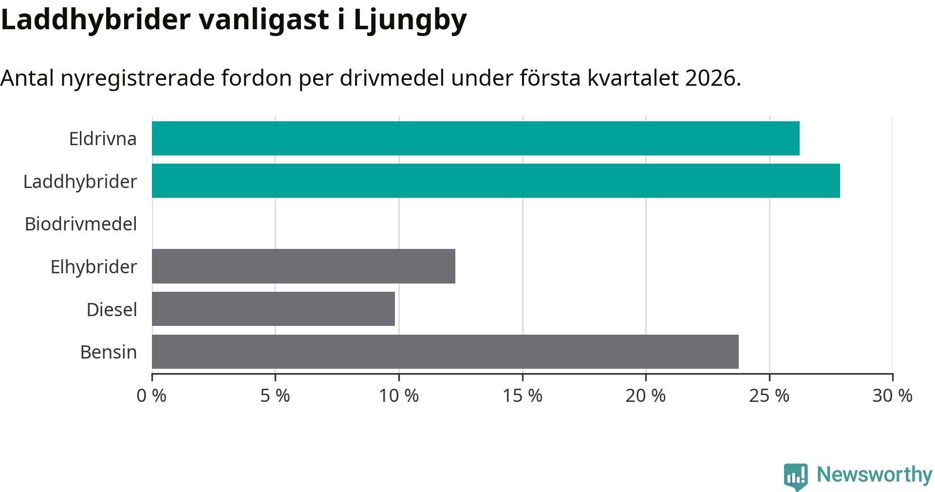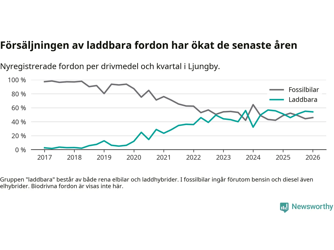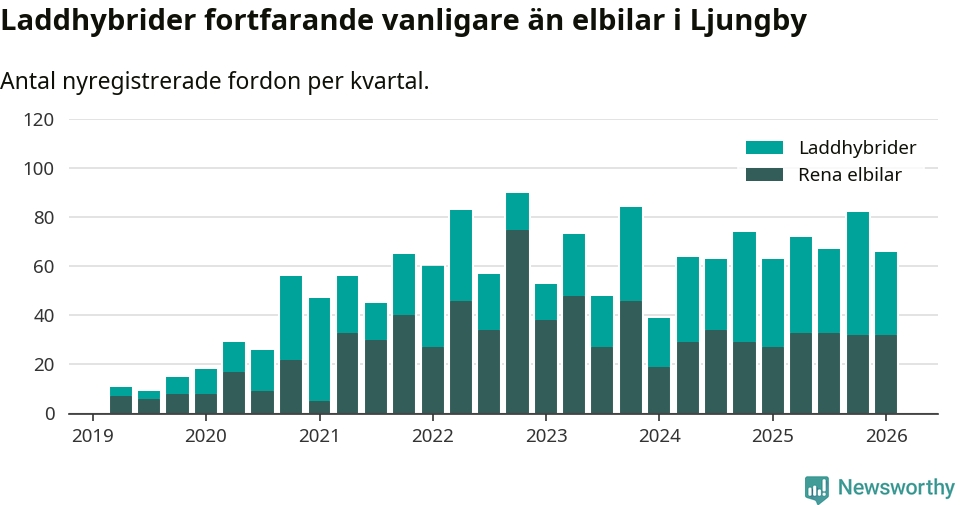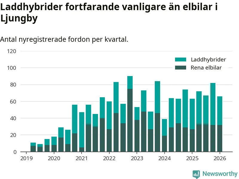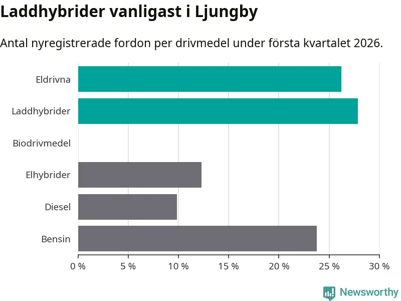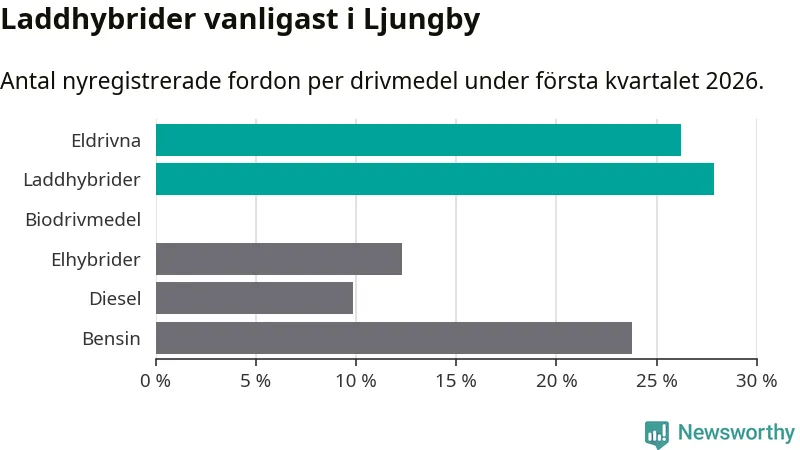 Under första kvartalet 2026 var 54 procent av alla nyregistrerade personbilar i Ljungby laddbara (sammanlagt registrerades 122 nya bilar). Merparten av de laddbara bilarna var så kallade laddhybrider, det vill säga fordon som går att ladda och köra på el, men som även har en förbränningsmotor. 26 procent av alla nya bilar var rena elbilar.