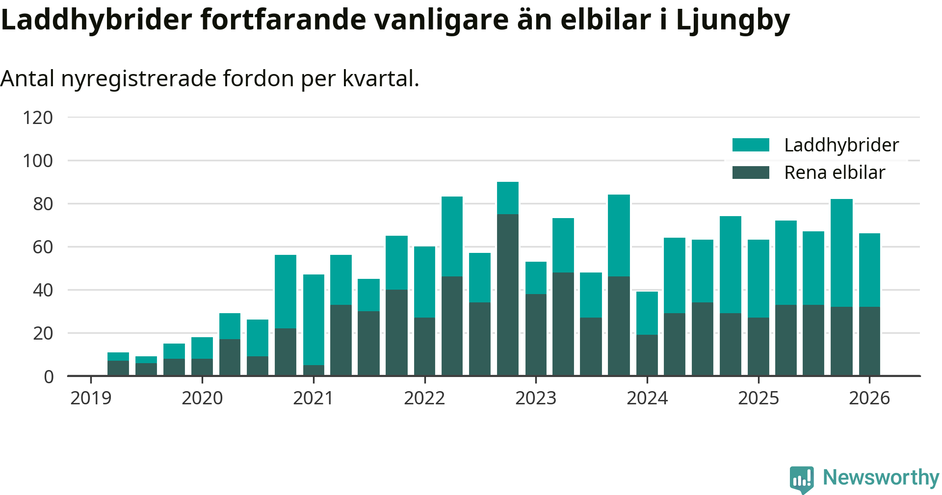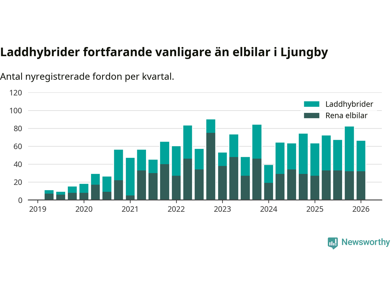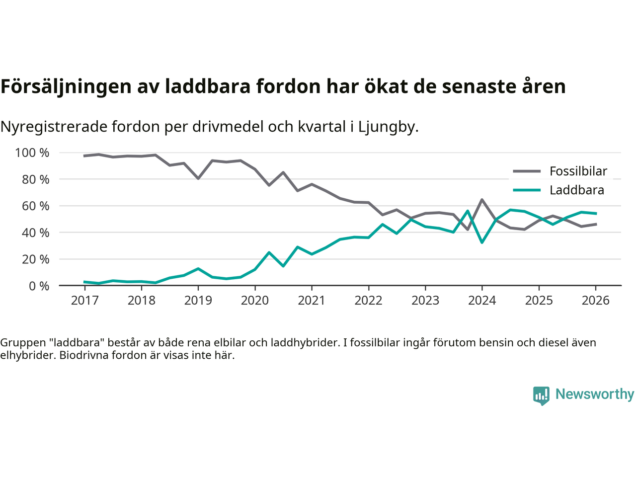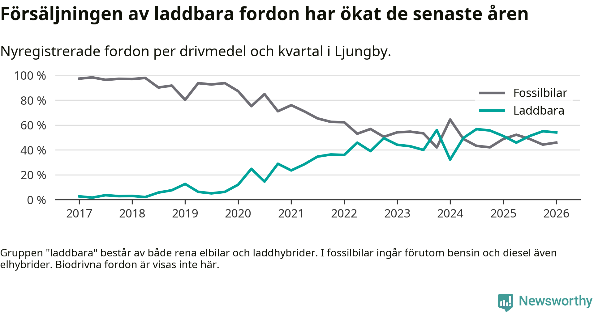 I Ljungby minskade andelen laddbara bilar under första kvartalet jämfört med kvartalet innan (−0,9 procentenheter). Nyregistreringen peakade under tredje kvartalet 2024 då 57 procent av de nya bilarna var laddbara.