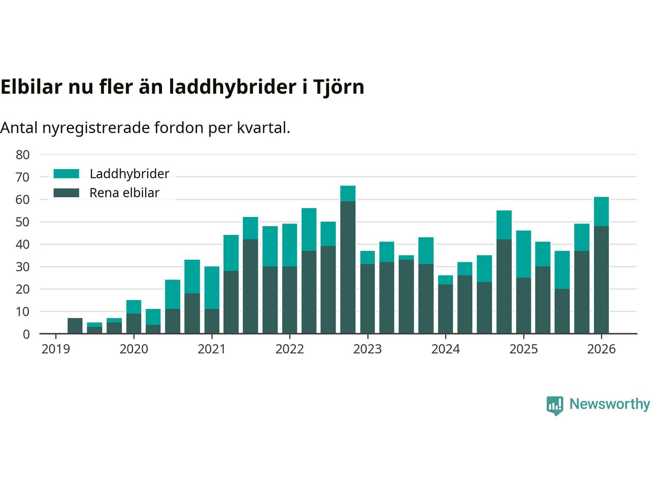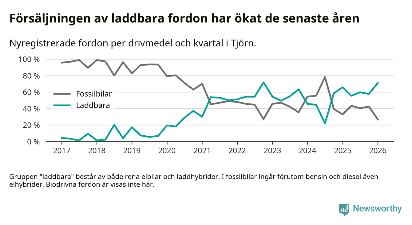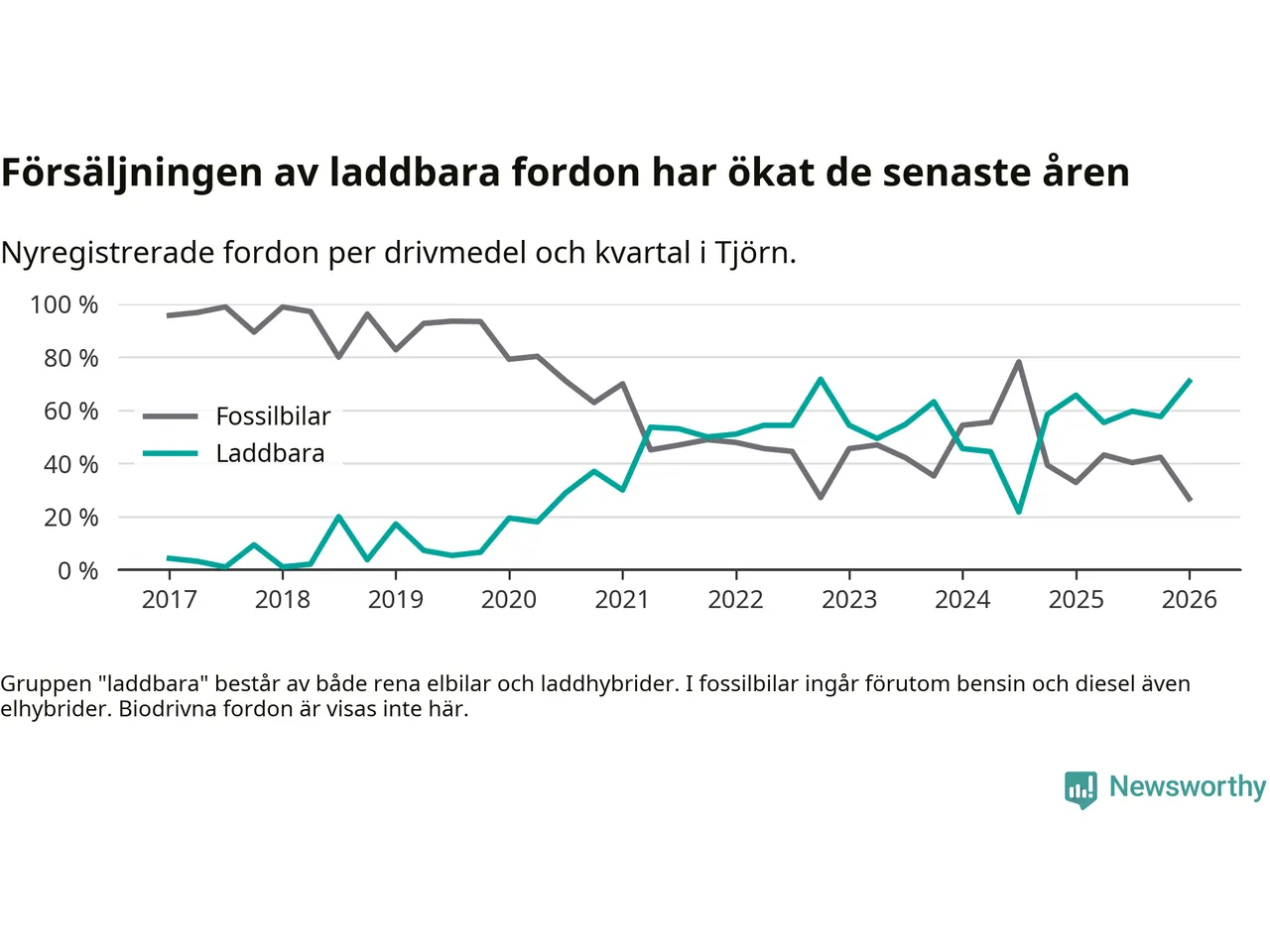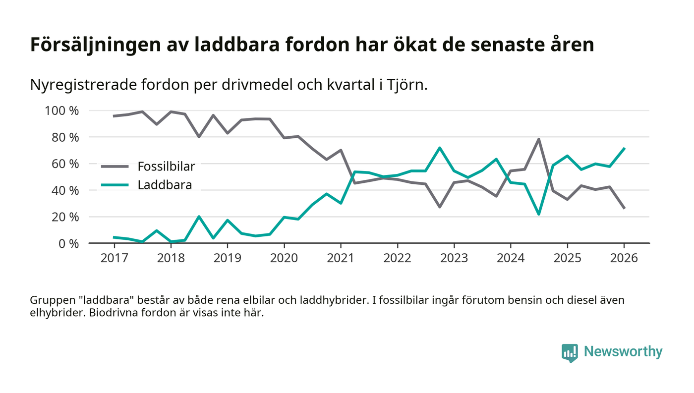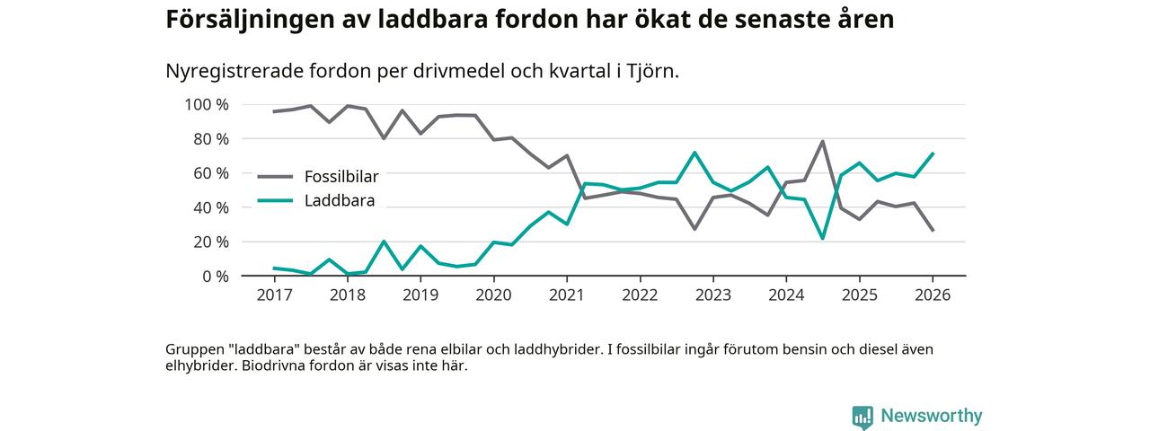Under första kvartalet 2026 var 71 procent av alla nyregistrerade personbilar på Tjörn laddbara (sammanlagt registrerades 86 nya bilar). Merparten av de laddbara bilarna var rena elbilar (56 procent av alla).