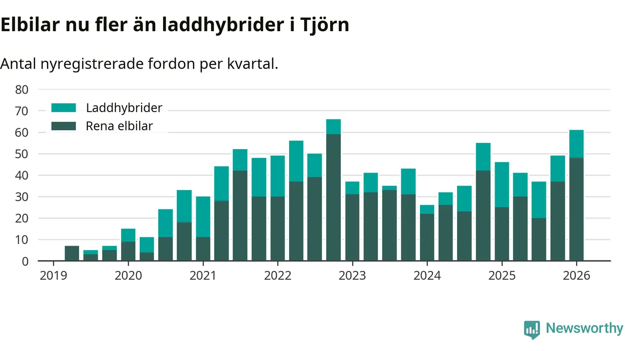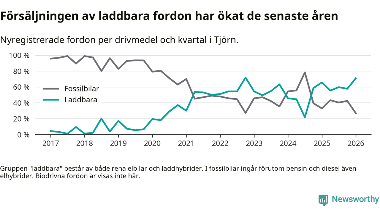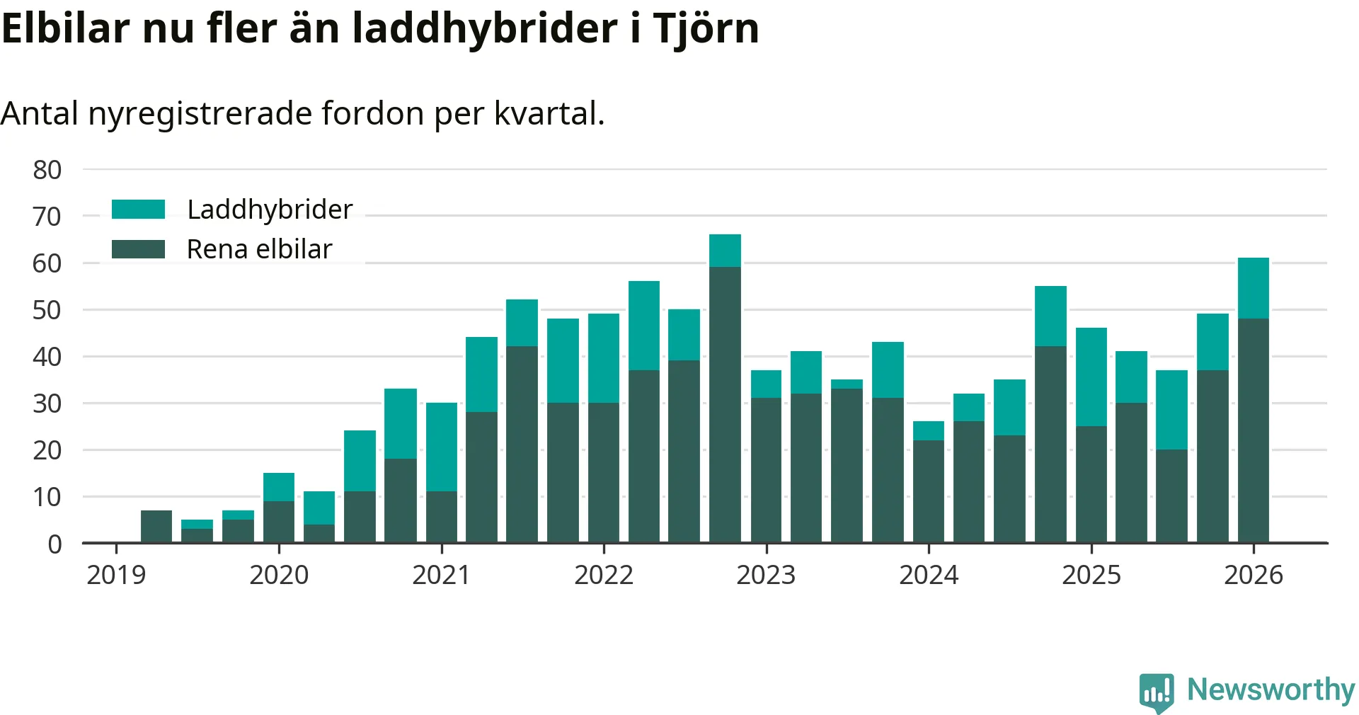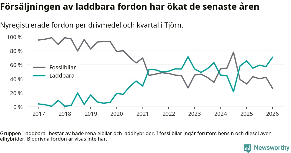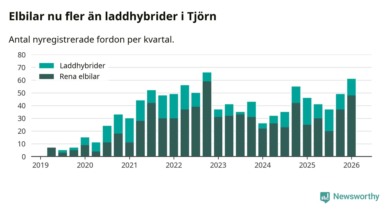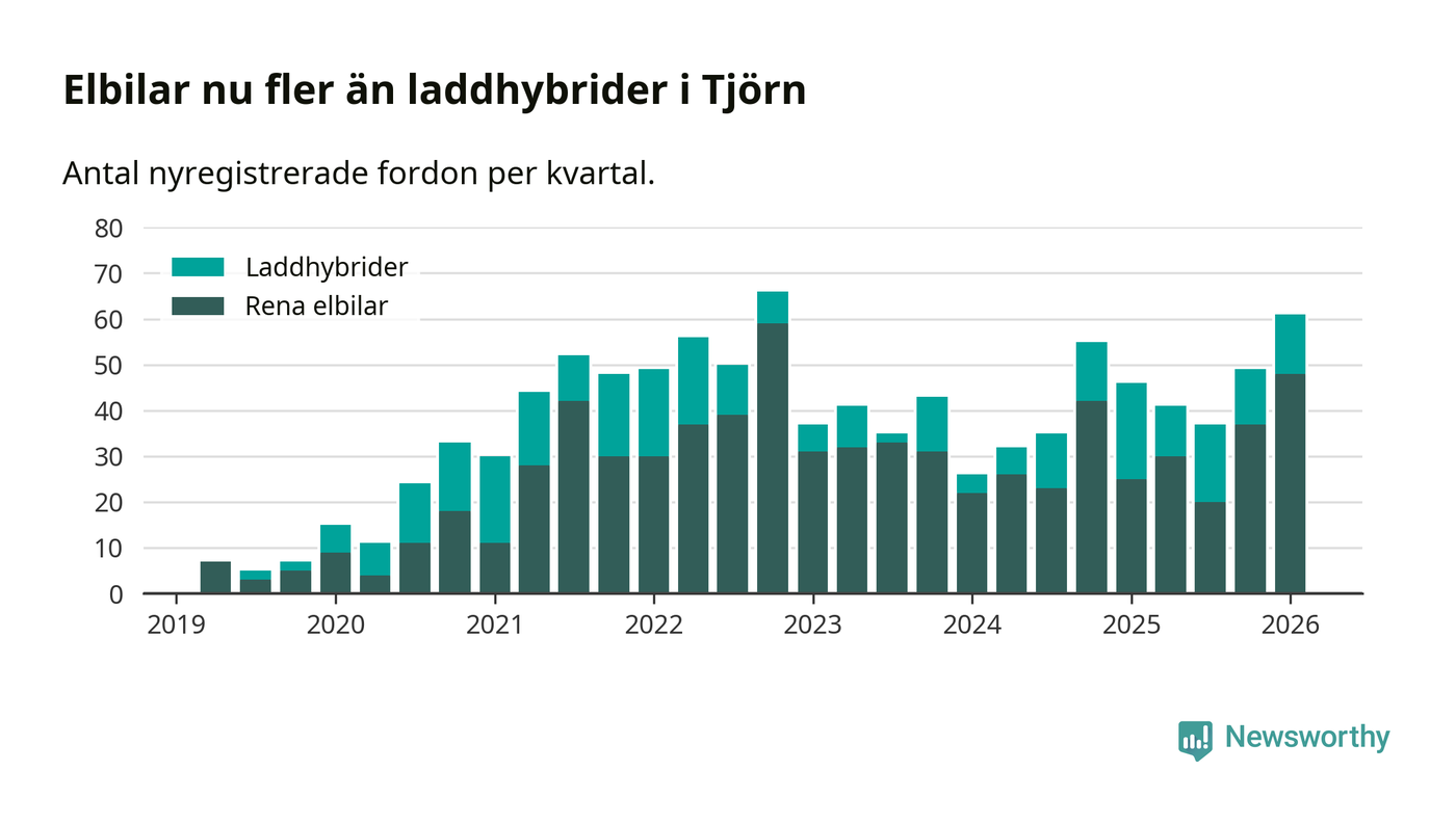 Under första kvartalet 2026 var 71 procent av alla nyregistrerade personbilar på Tjörn laddbara (sammanlagt registrerades 86 nya bilar). Merparten av de laddbara bilarna var rena elbilar (56 procent av alla).