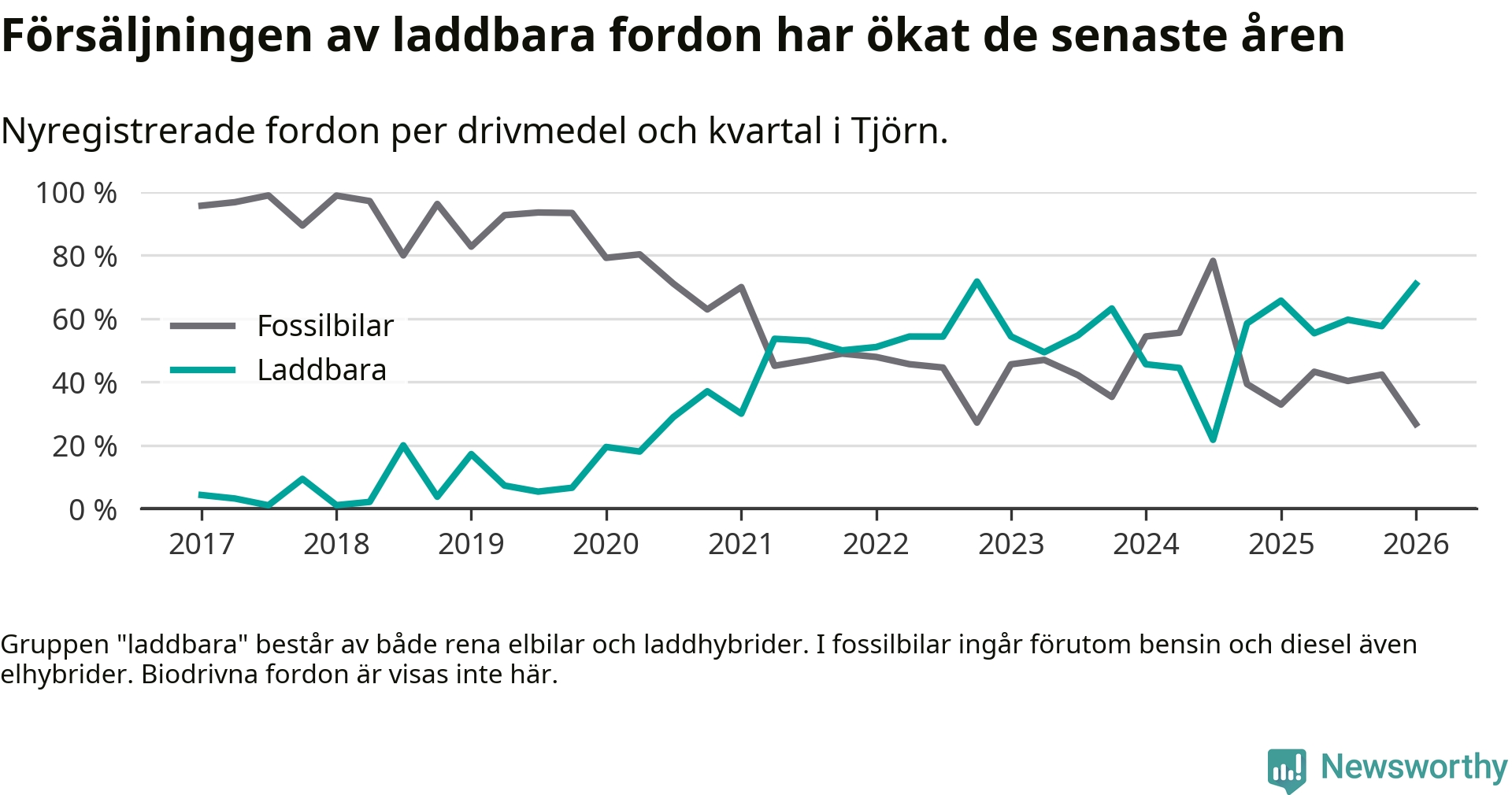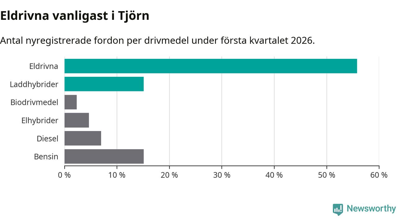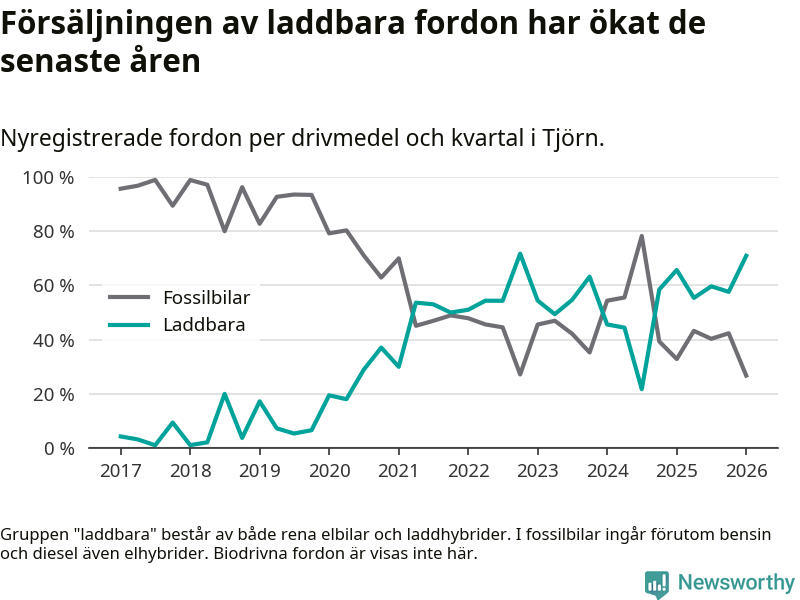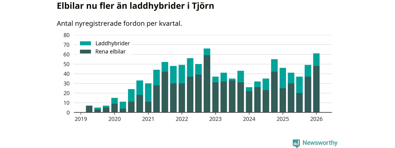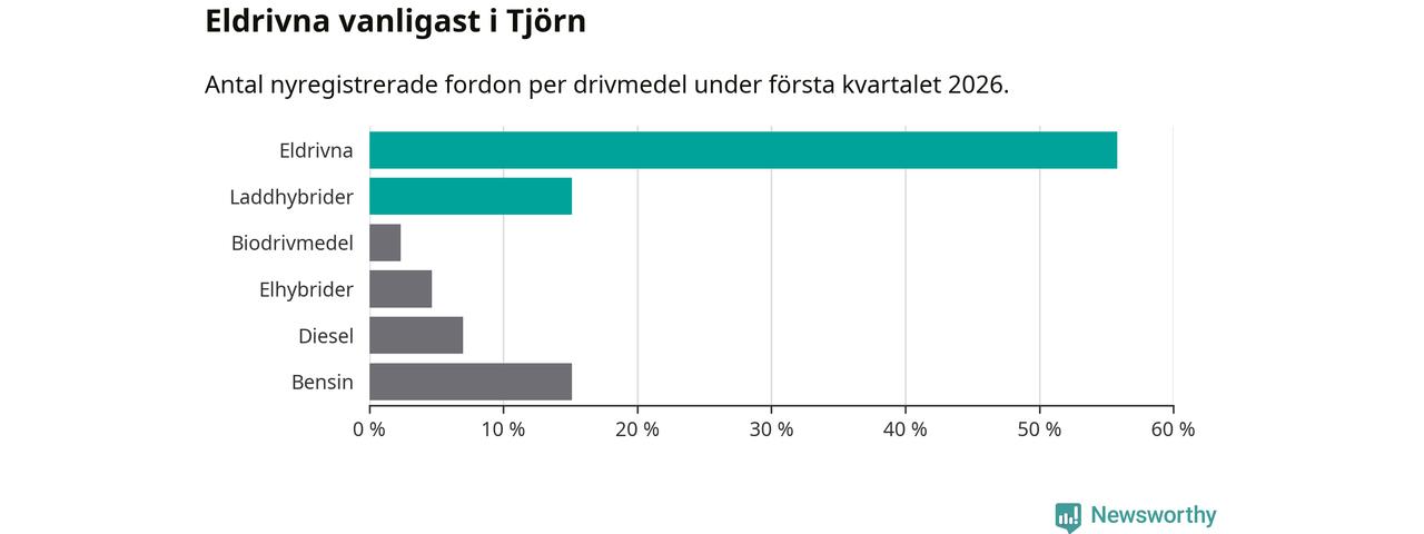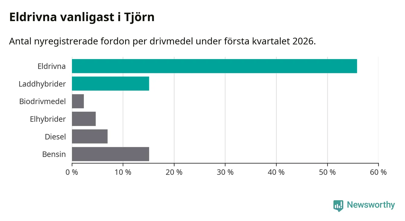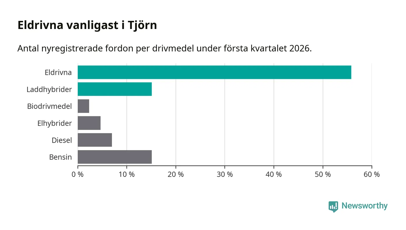 Under första kvartalet 2026 var 71 procent av alla nyregistrerade personbilar på Tjörn laddbara (sammanlagt registrerades 86 nya bilar). Merparten av de laddbara bilarna var rena elbilar (56 procent av alla).