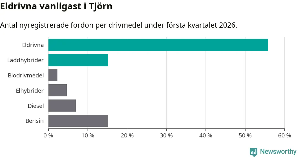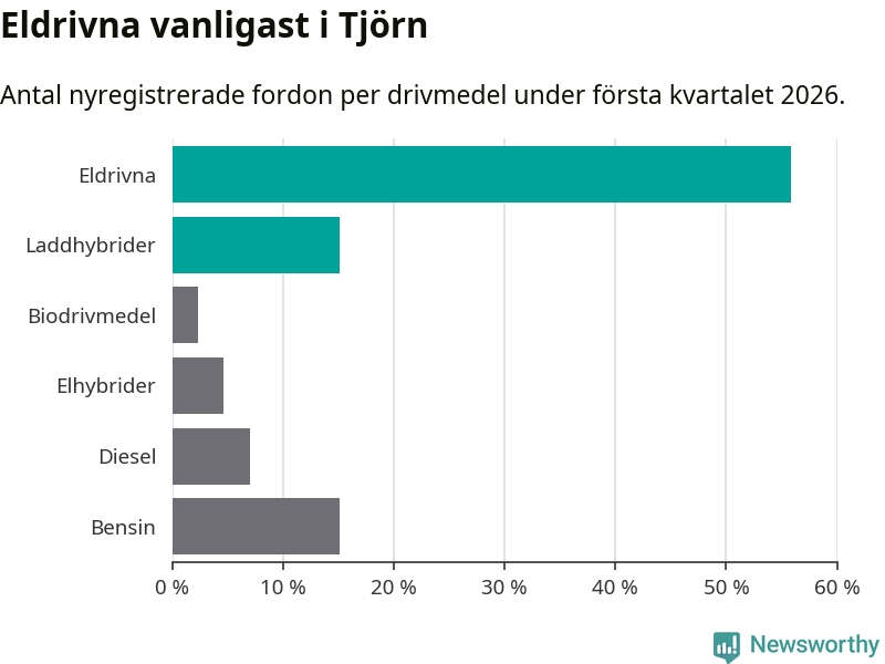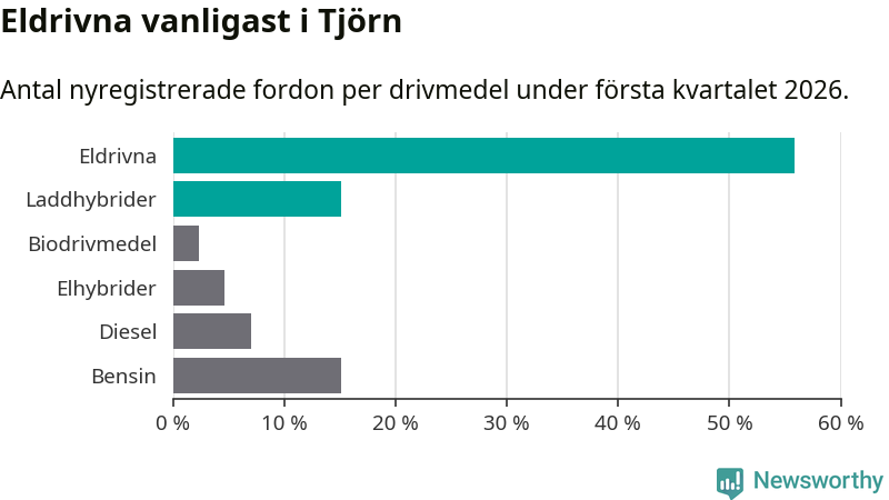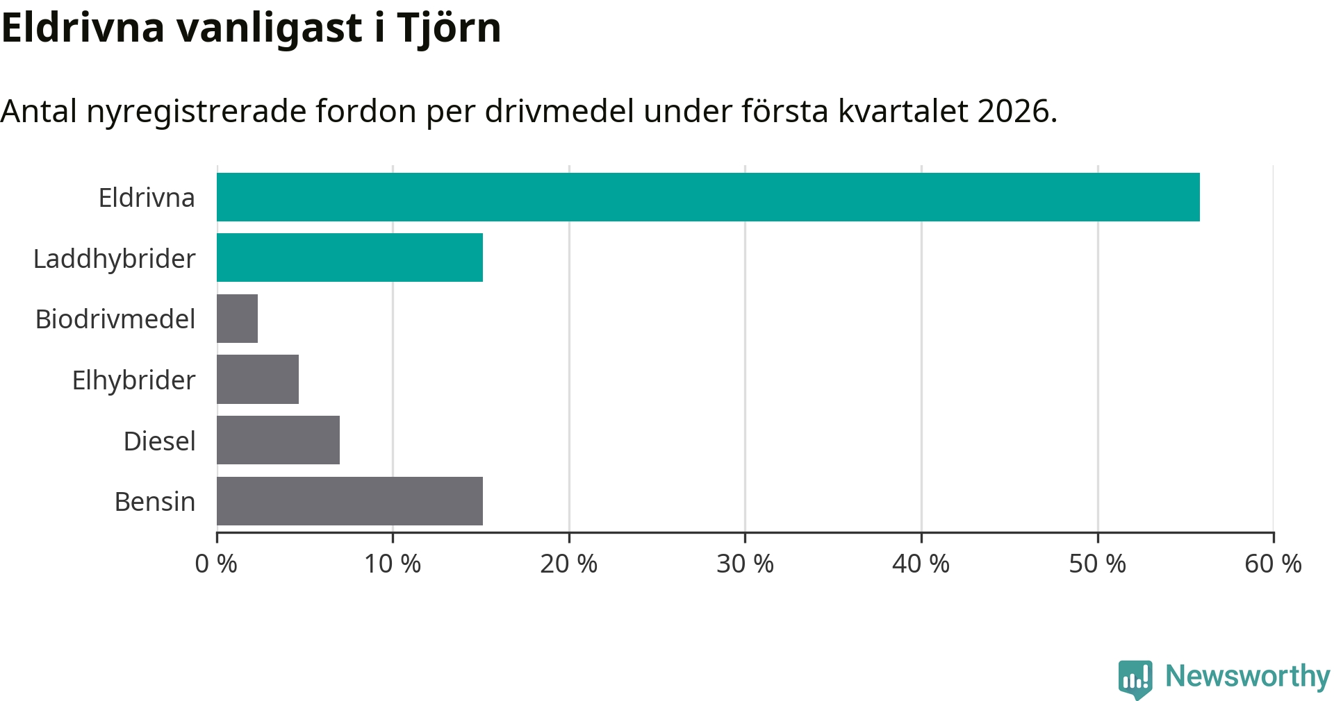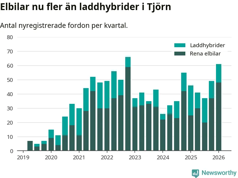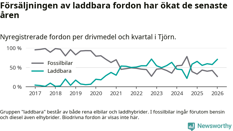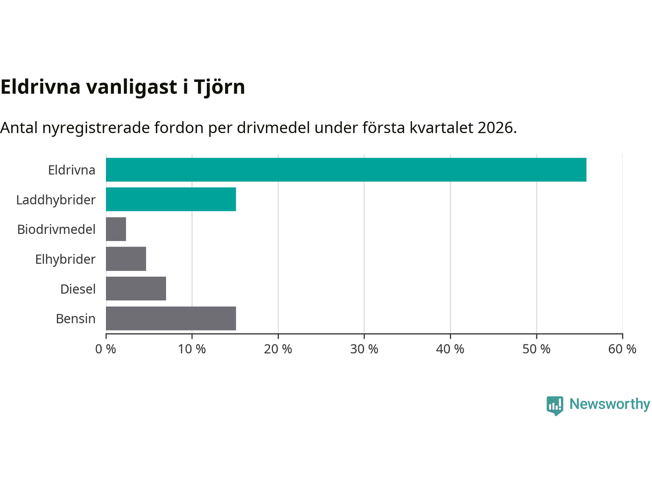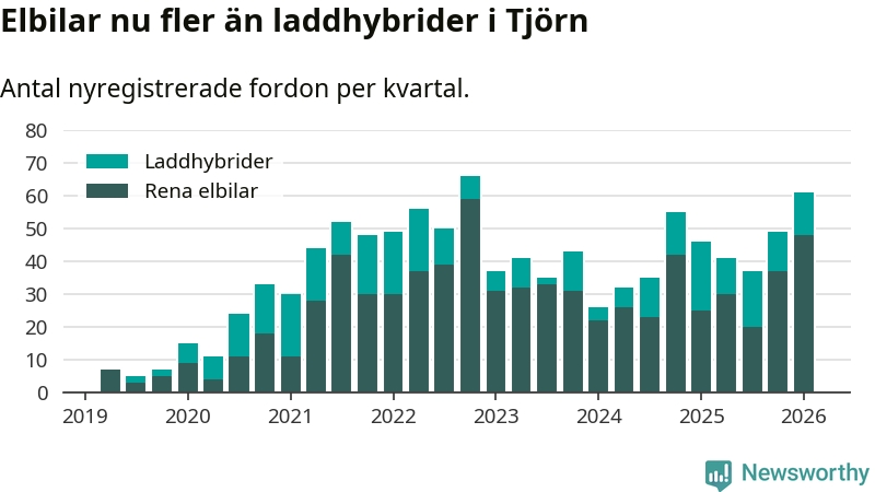 Under första kvartalet 2026 var 71 procent av alla nyregistrerade personbilar på Tjörn laddbara (sammanlagt registrerades 86 nya bilar). Merparten av de laddbara bilarna var rena elbilar (56 procent av alla).