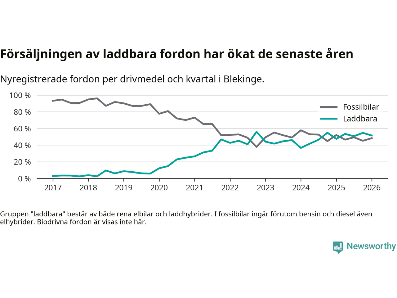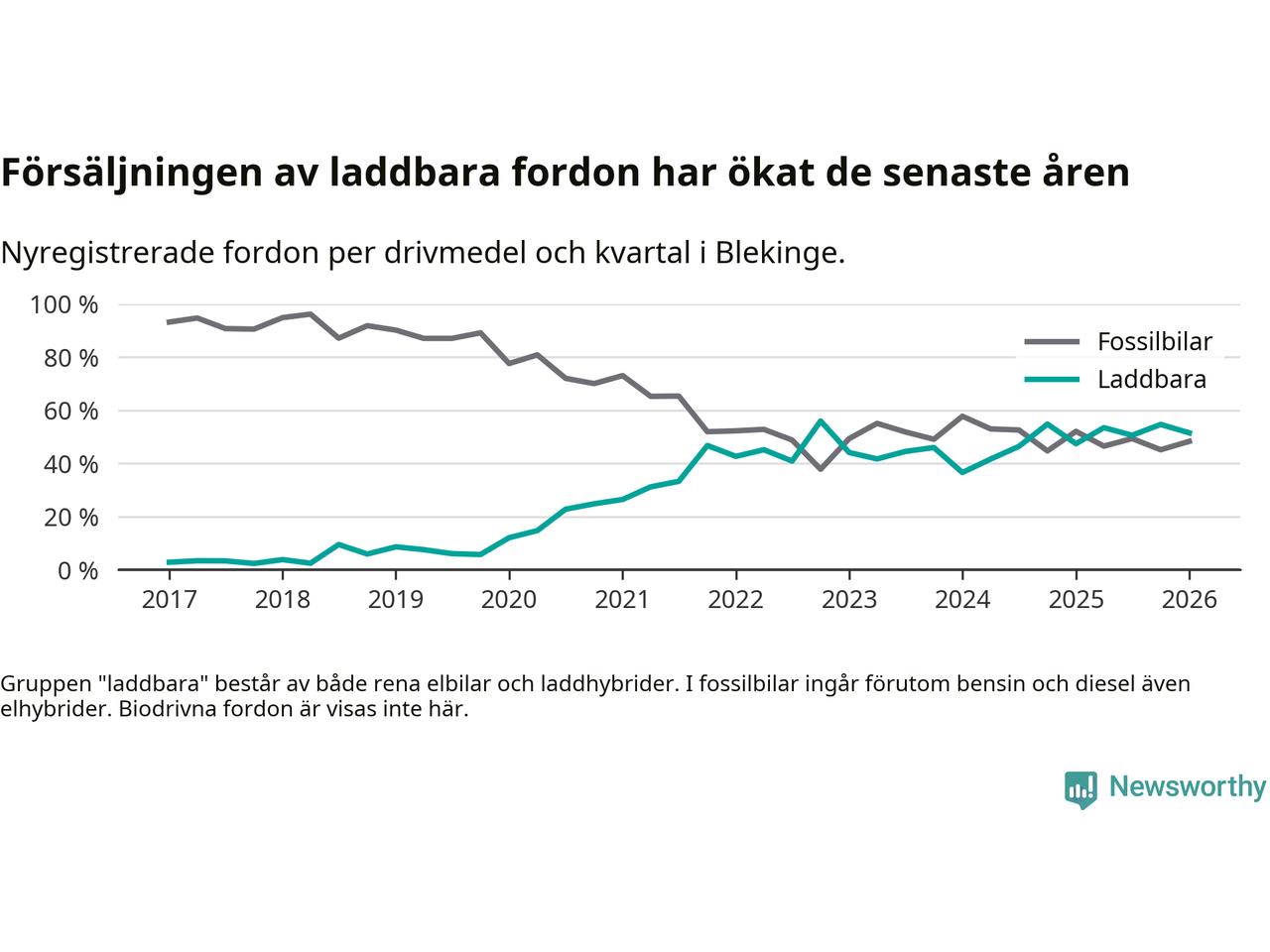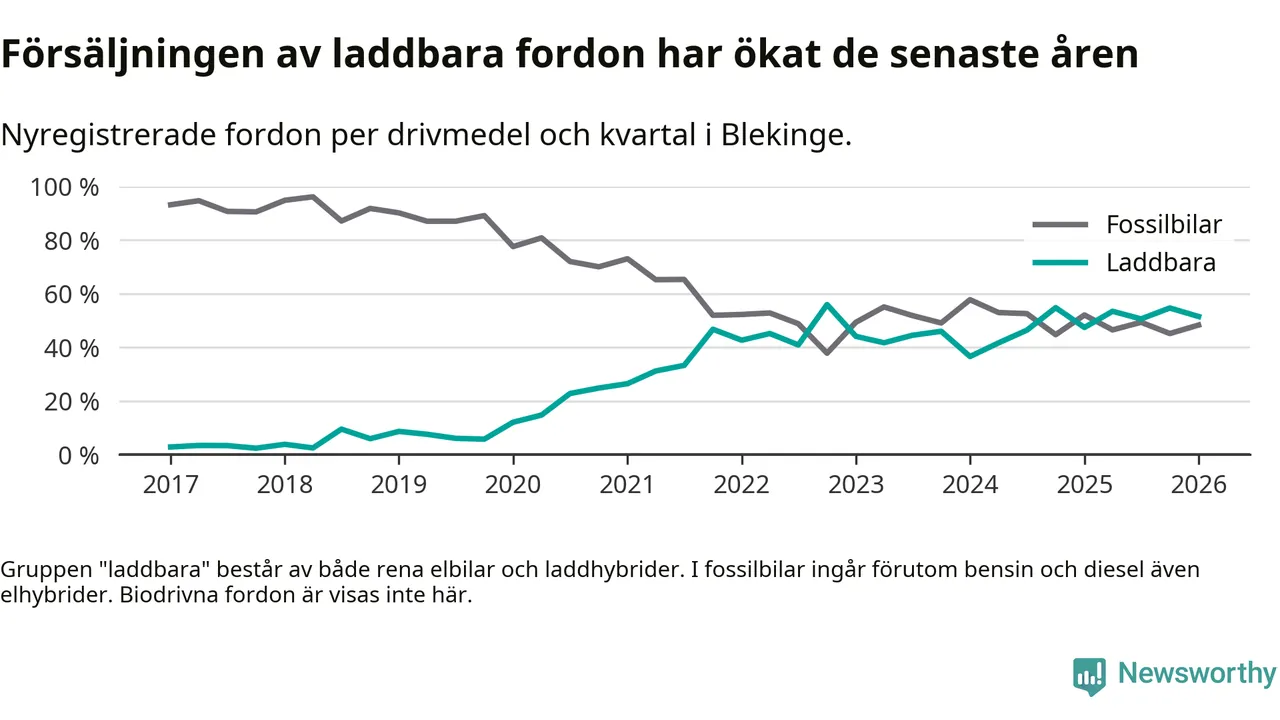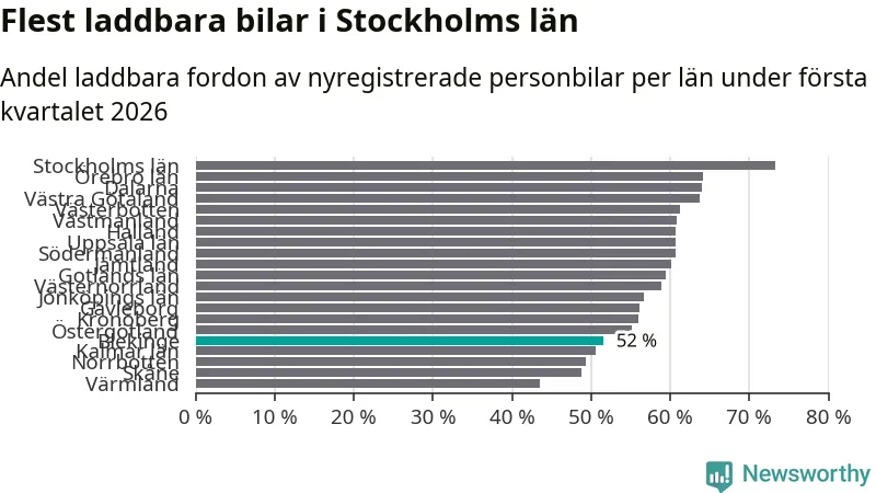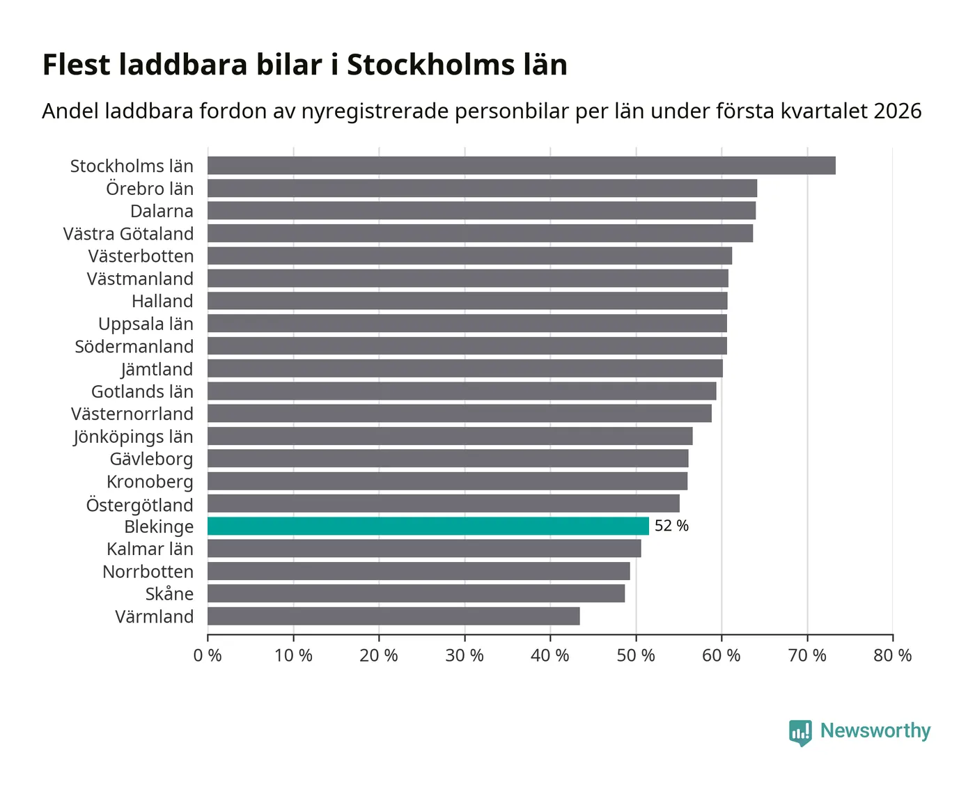 Under första kvartalet 2026 var 52 procent av alla nyregistrerade personbilar i Blekinge laddbara (sammanlagt registrerades 658 nya bilar). Merparten av de laddbara bilarna var rena elbilar (31 procent av alla).
