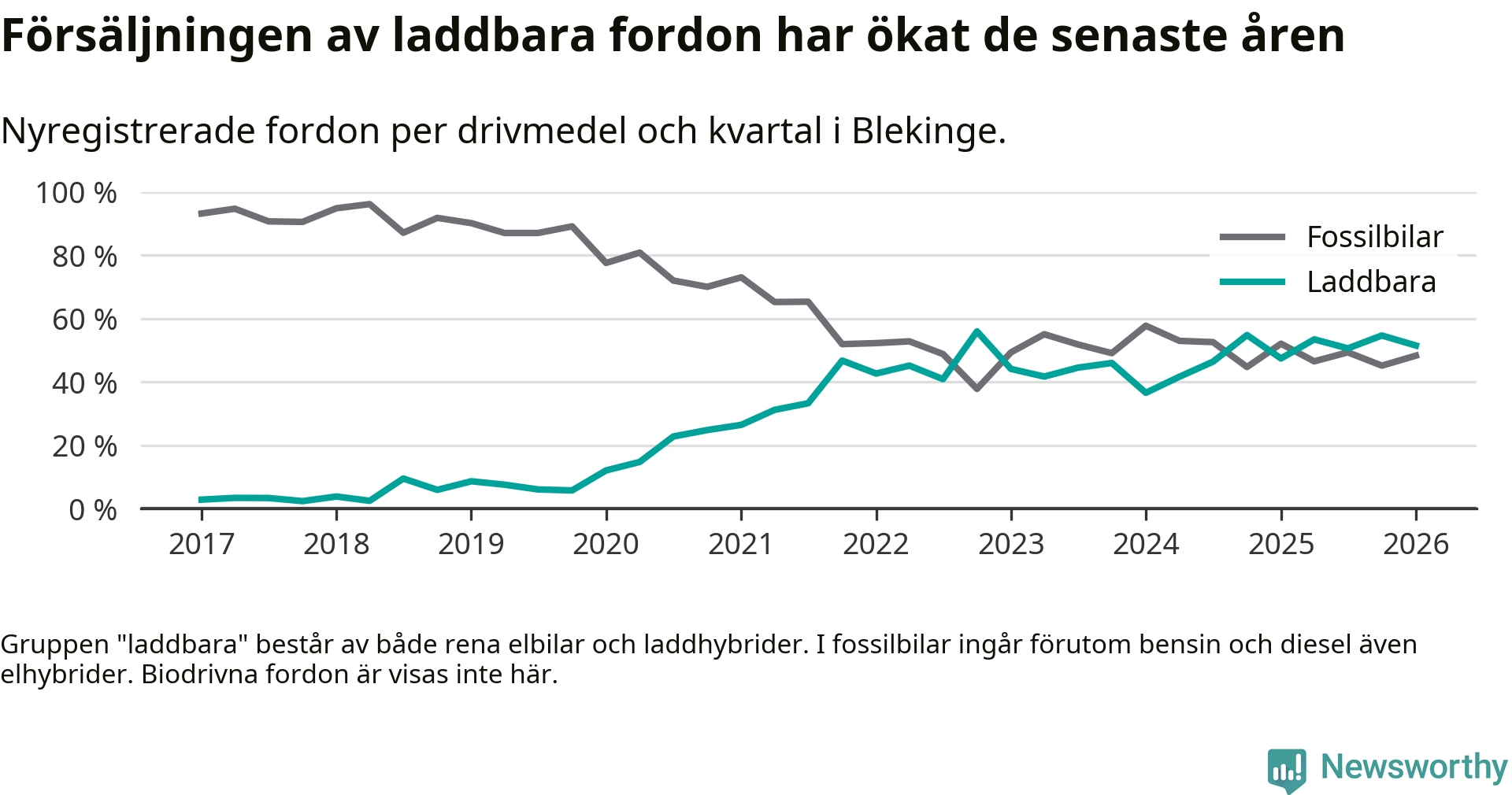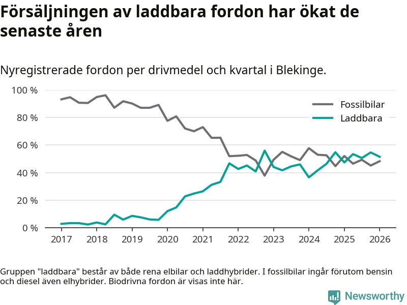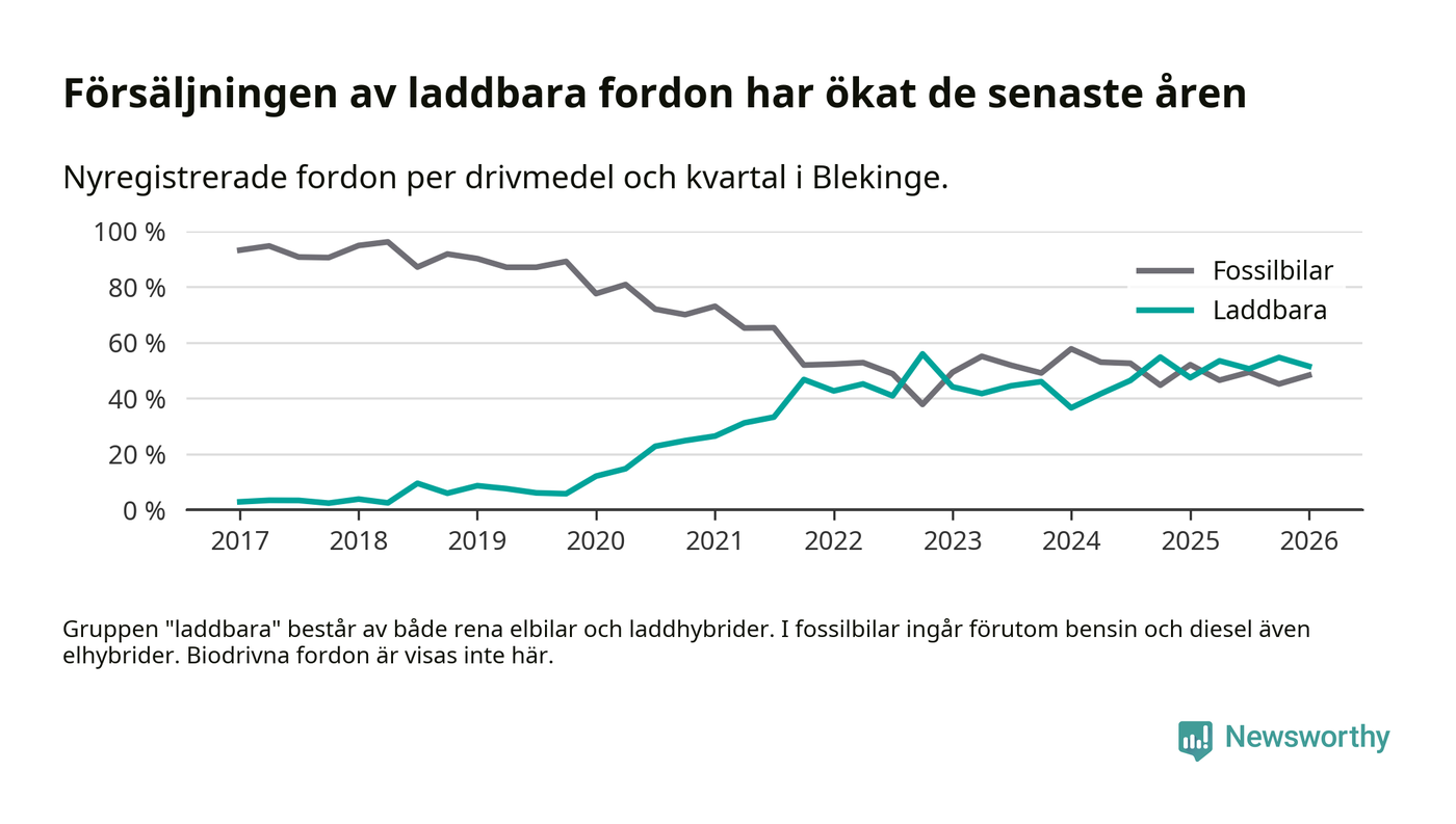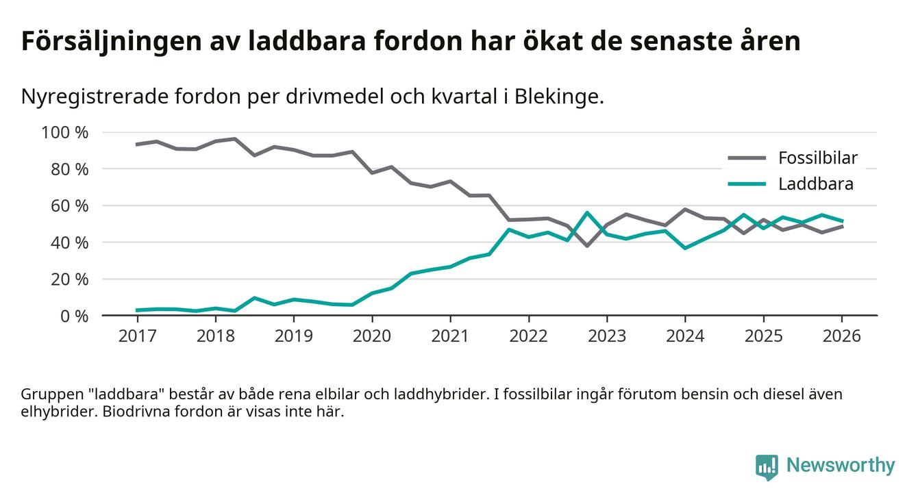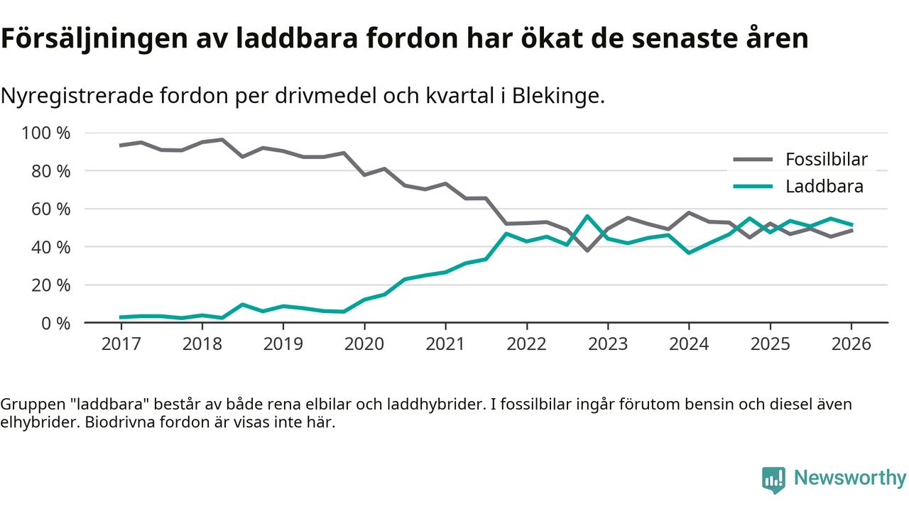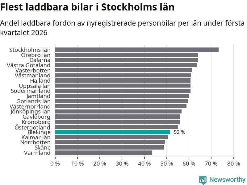 Under första kvartalet 2026 var 52 procent av alla nyregistrerade personbilar i Blekinge laddbara (sammanlagt registrerades 658 nya bilar). Merparten av de laddbara bilarna var rena elbilar (31 procent av alla).
