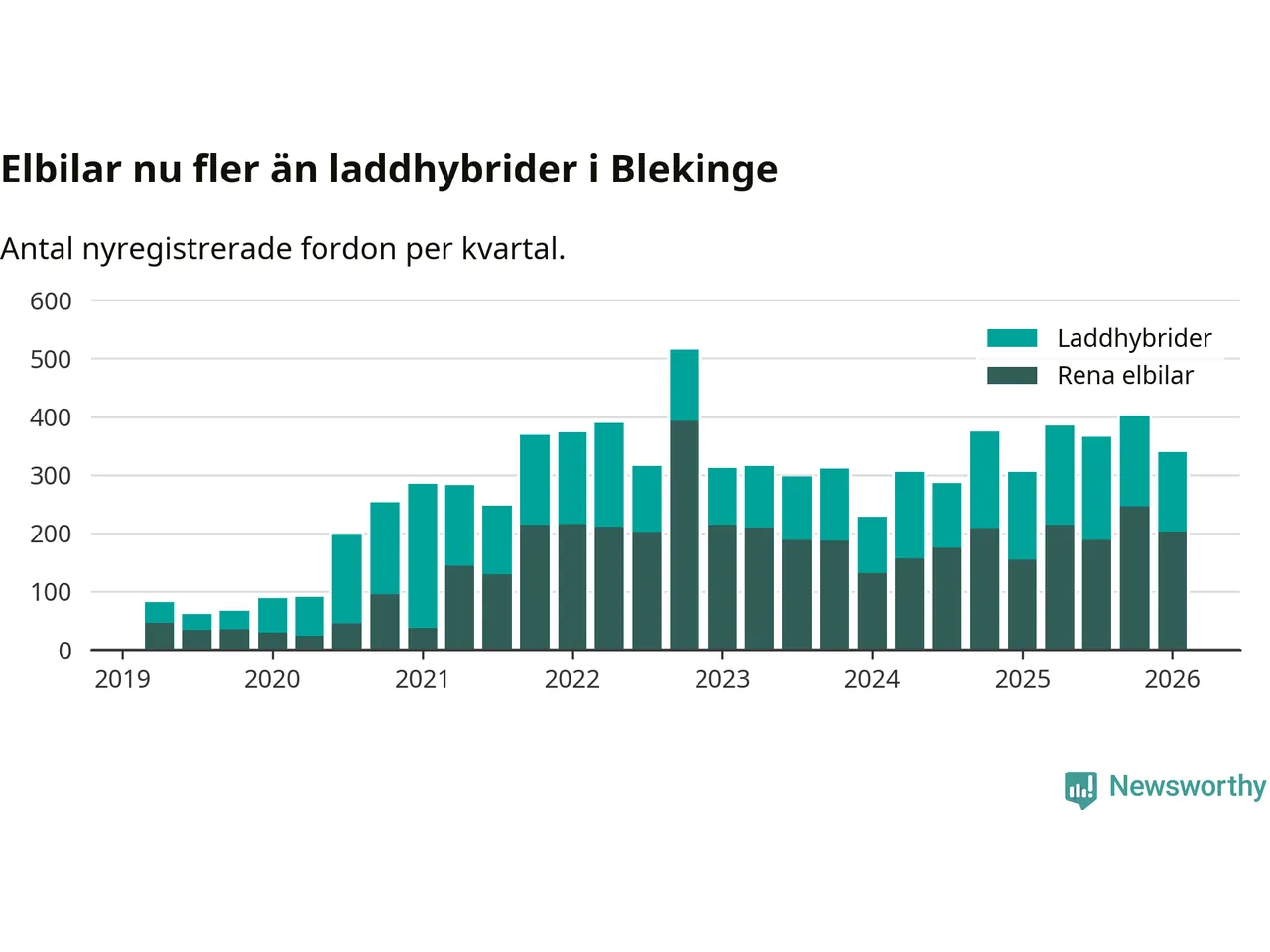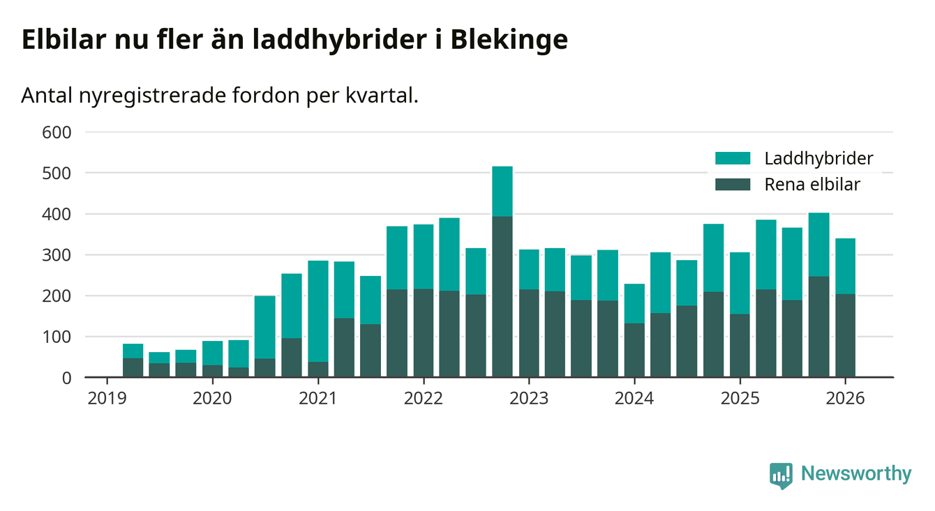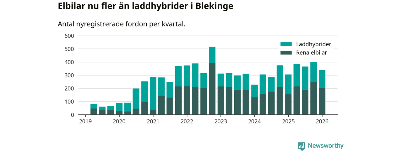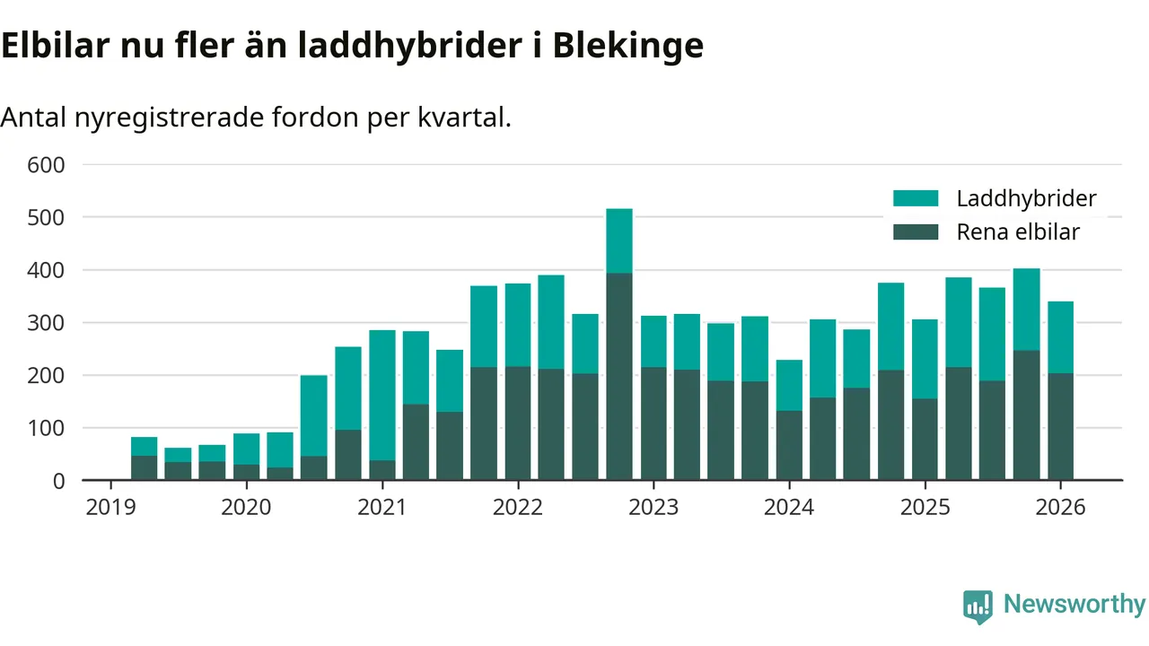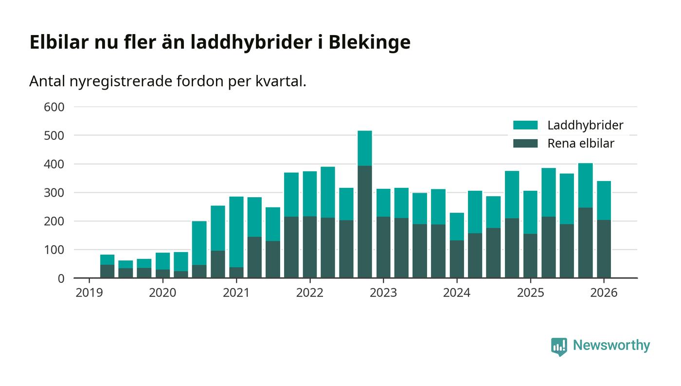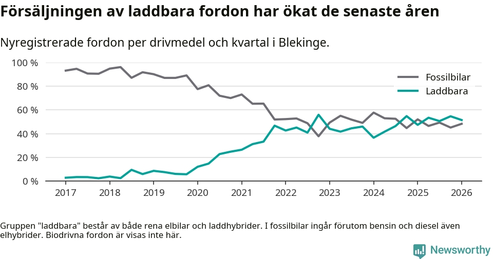 Under första kvartalet 2026 var 52 procent av alla nyregistrerade personbilar i Blekinge laddbara (sammanlagt registrerades 658 nya bilar). Merparten av de laddbara bilarna var rena elbilar (31 procent av alla).