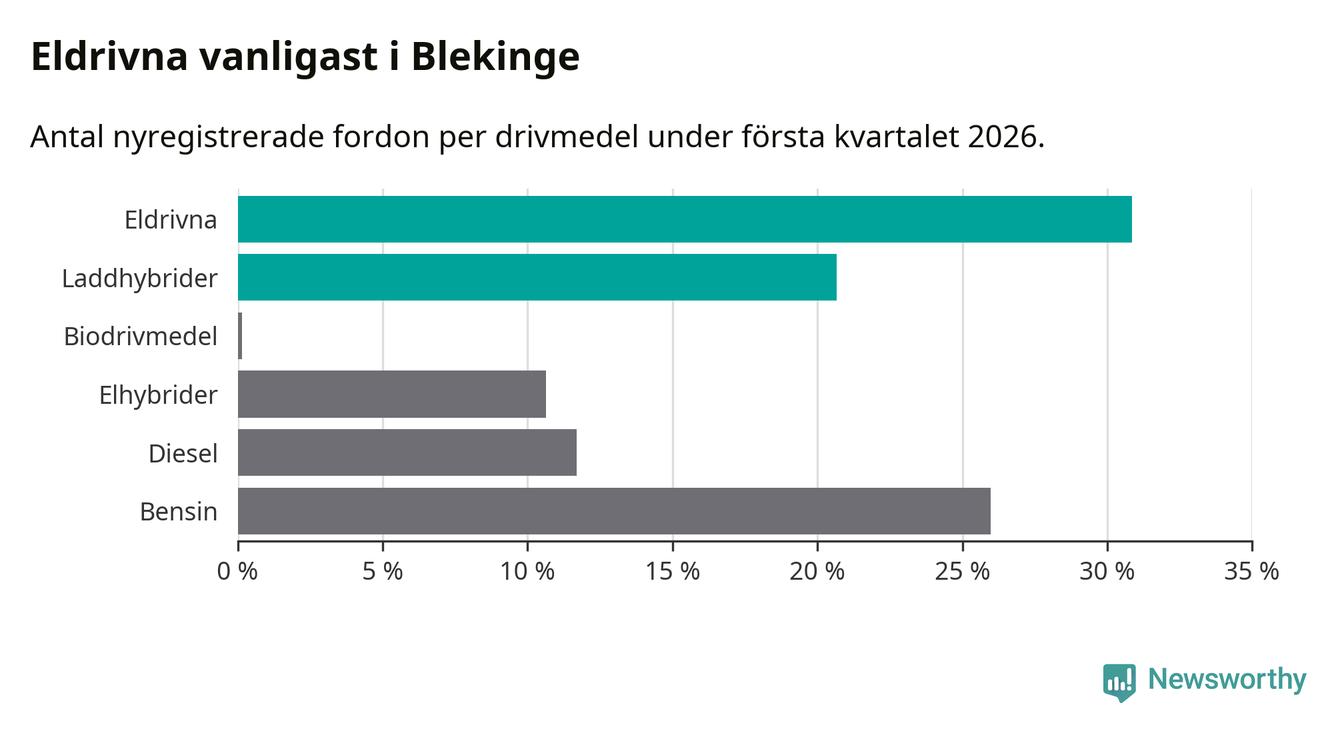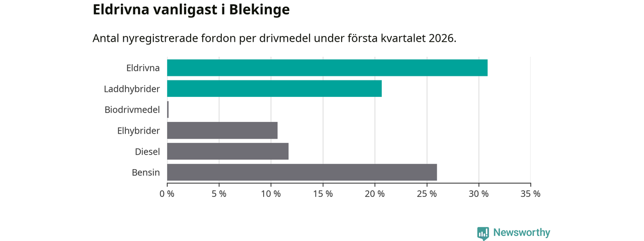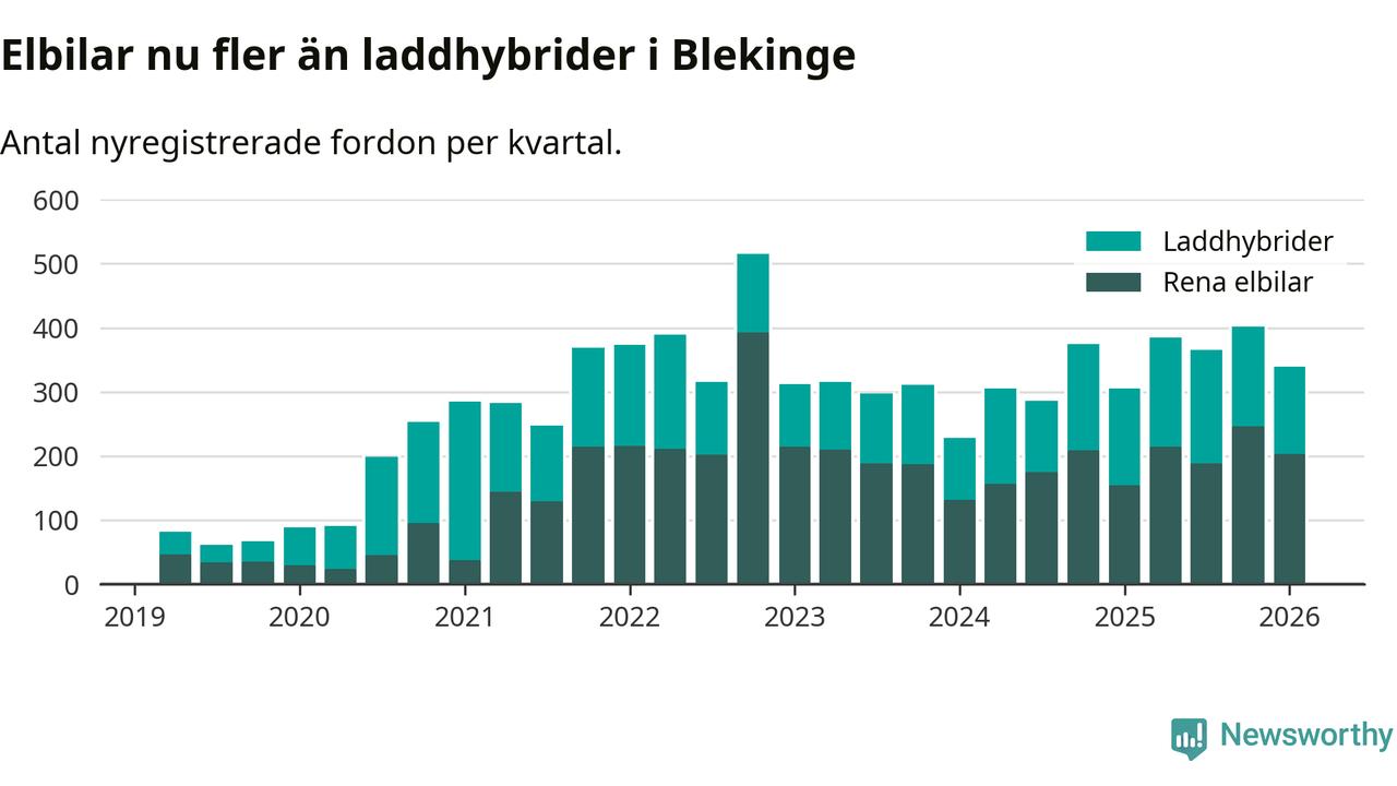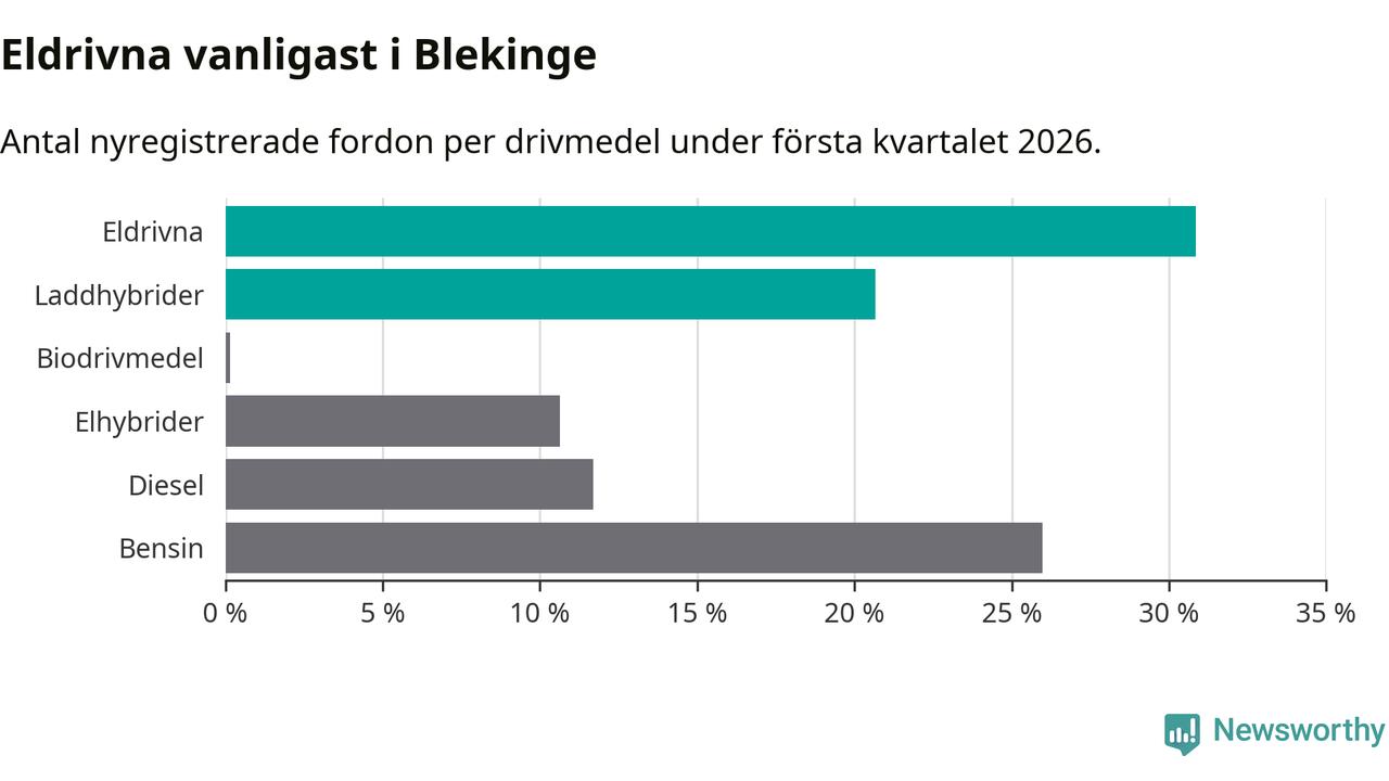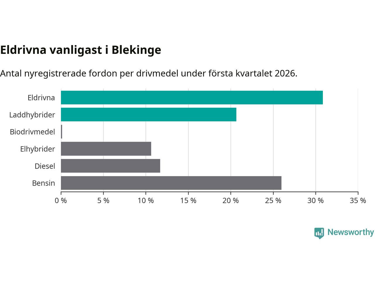 Under första kvartalet 2026 var 52 procent av alla nyregistrerade personbilar i Blekinge laddbara (sammanlagt registrerades 658 nya bilar). Merparten av de laddbara bilarna var rena elbilar (31 procent av alla).