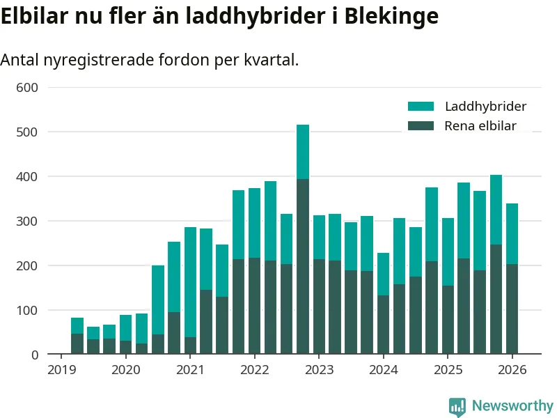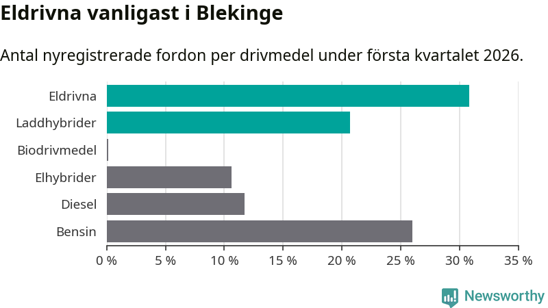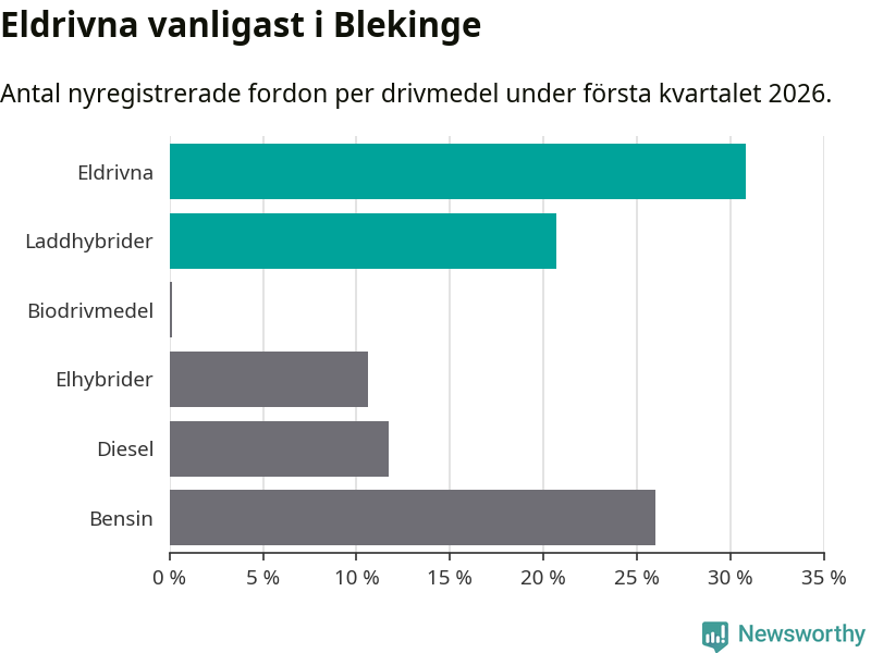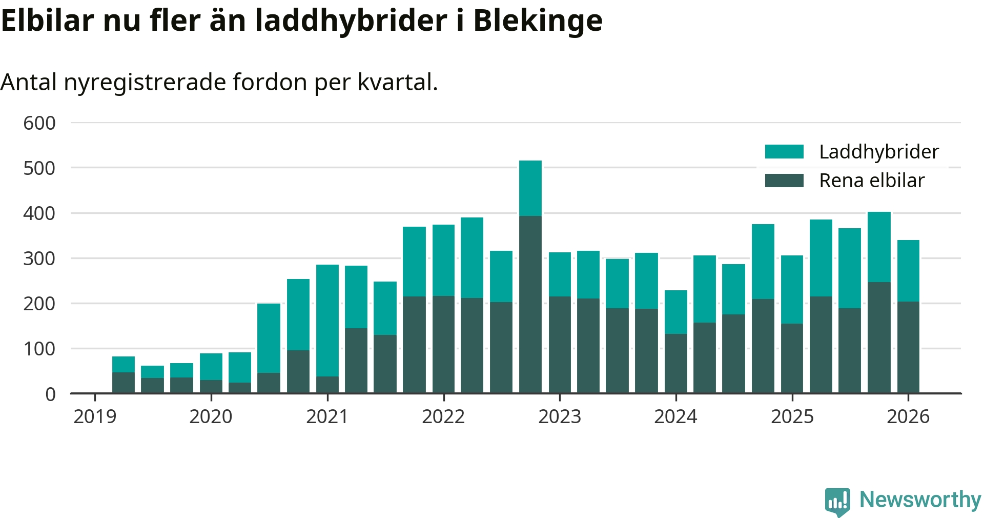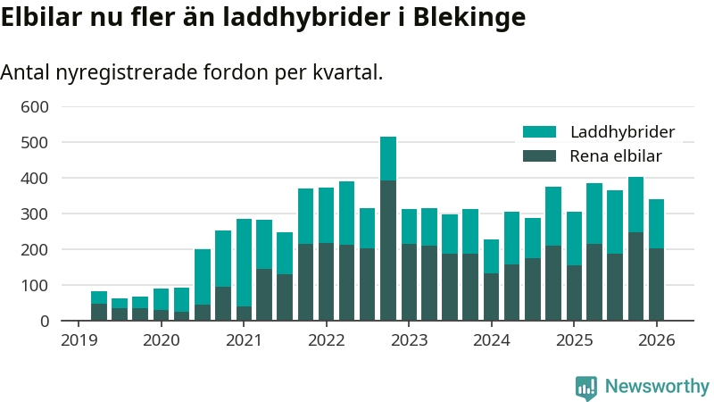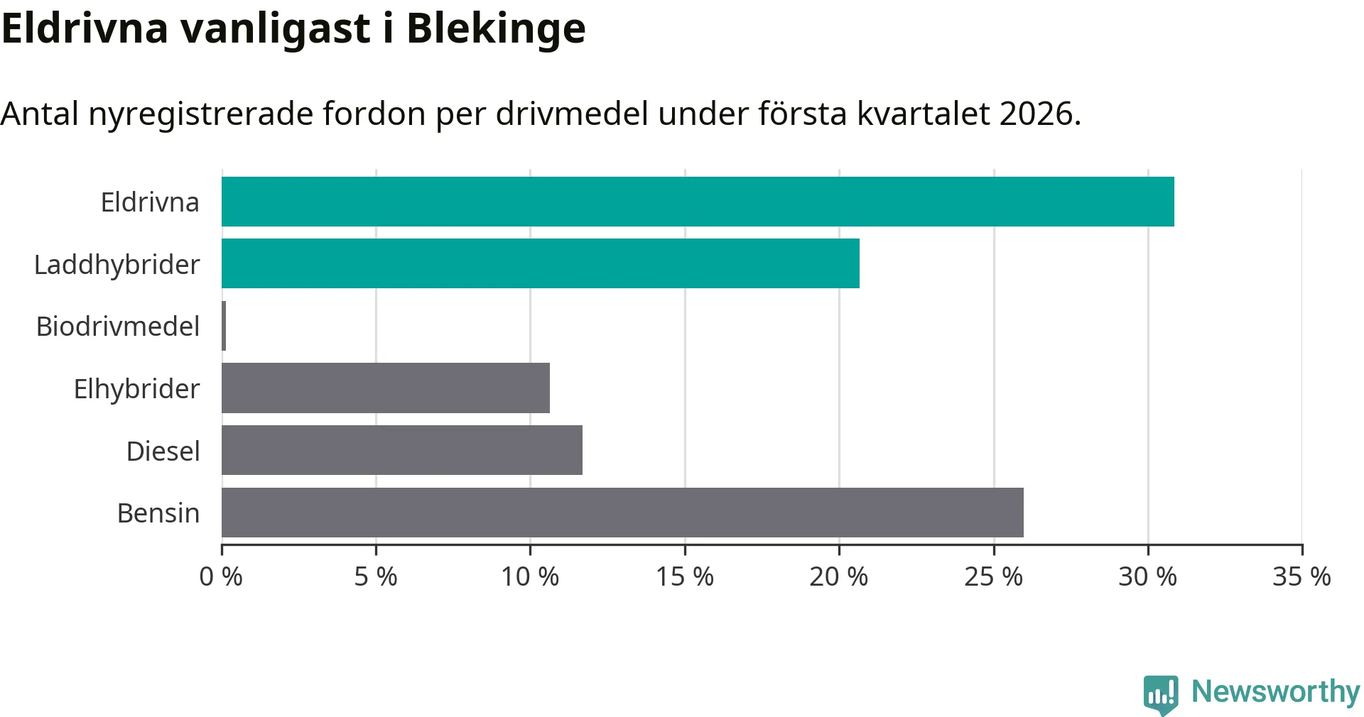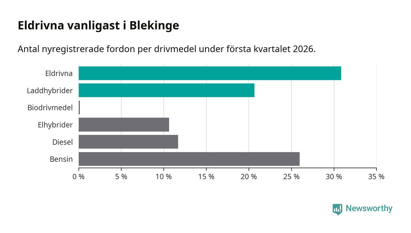 Under första kvartalet 2026 var 52 procent av alla nyregistrerade personbilar i Blekinge laddbara (sammanlagt registrerades 658 nya bilar). Merparten av de laddbara bilarna var rena elbilar (31 procent av alla).