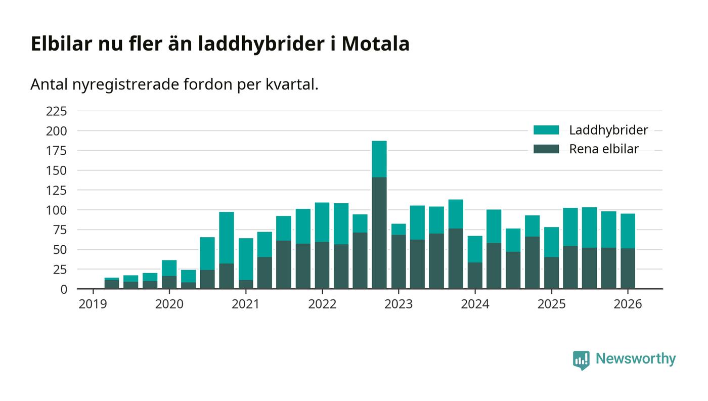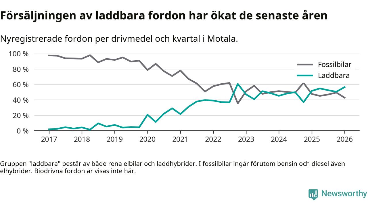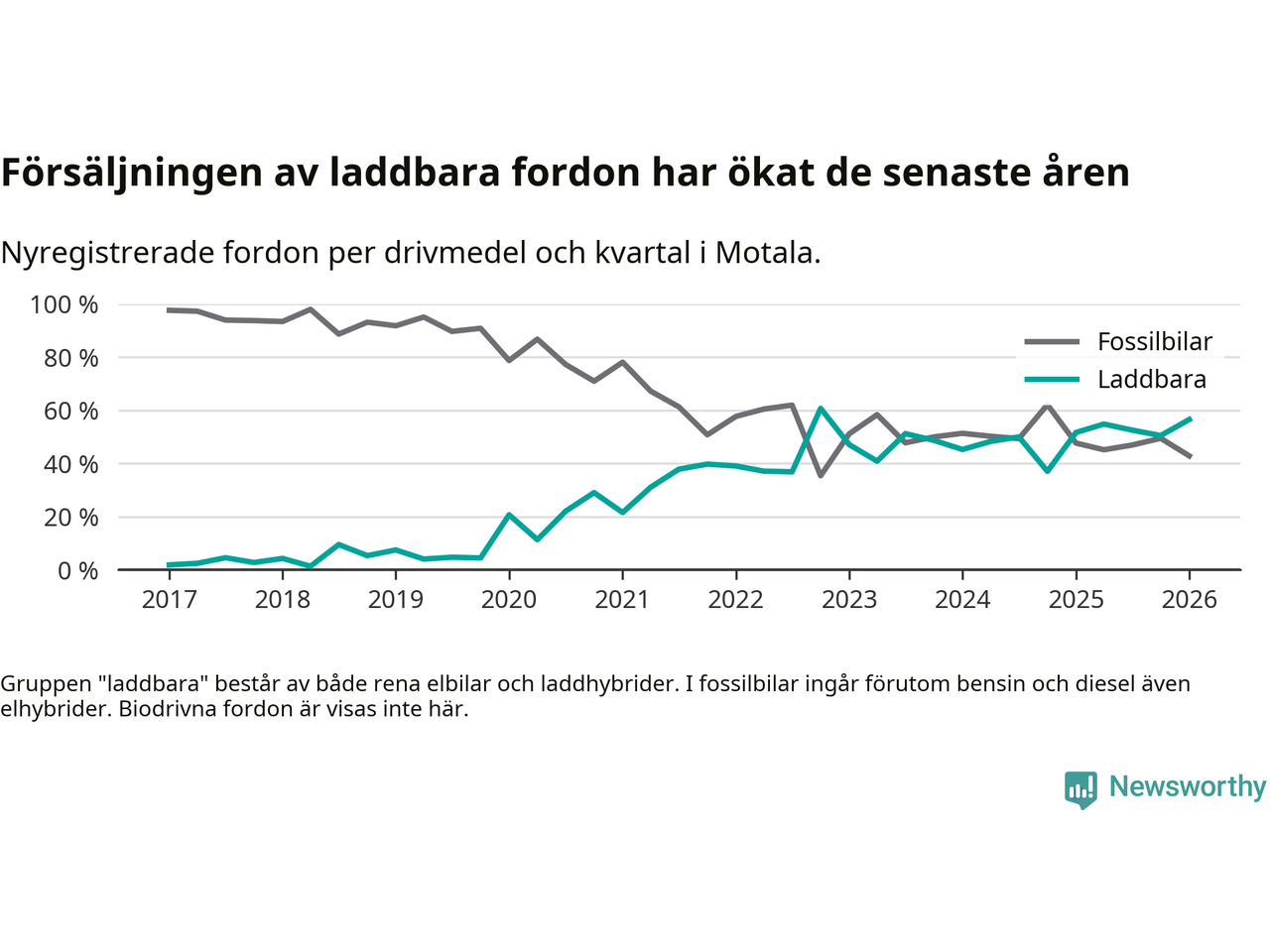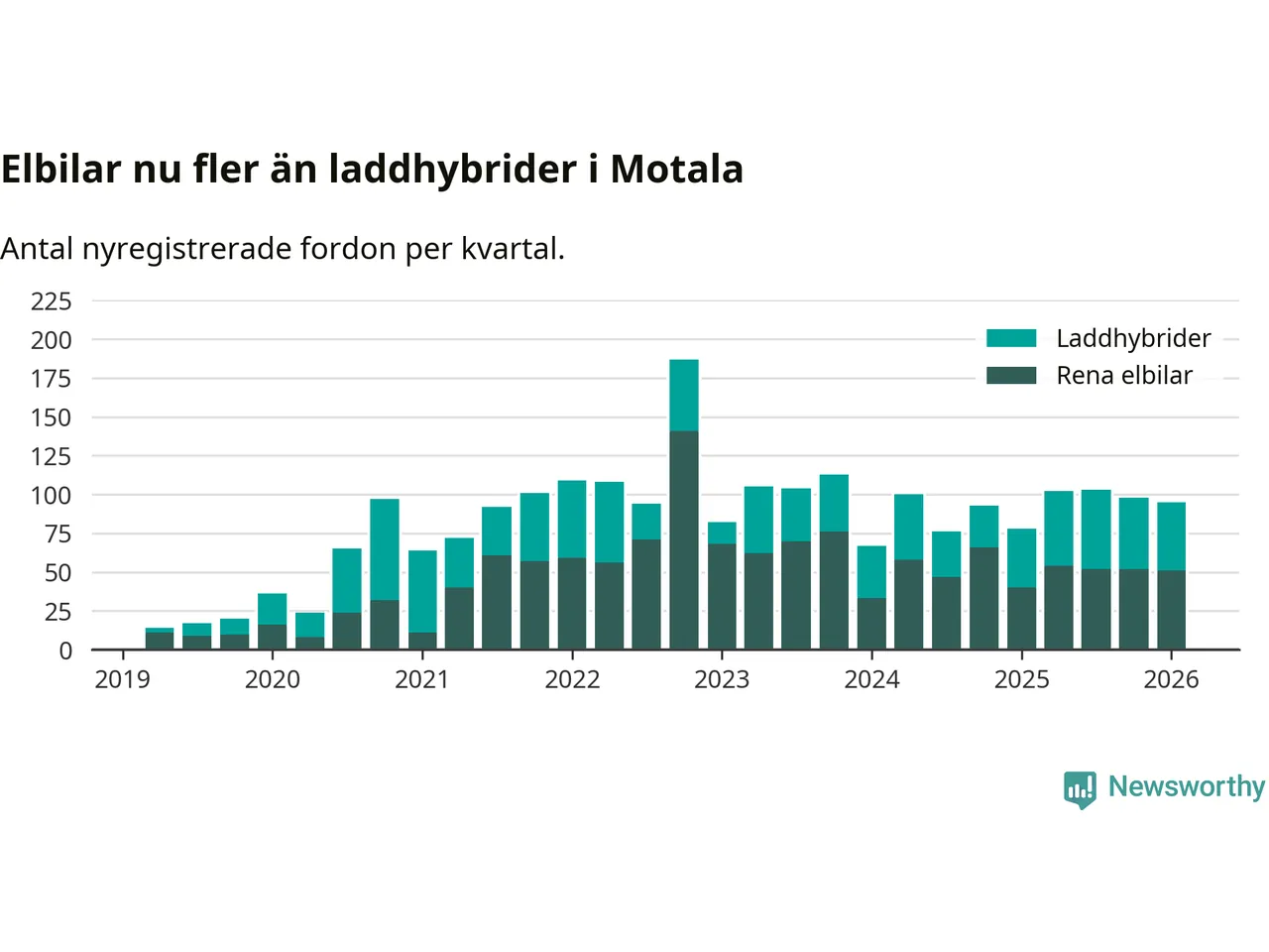 Under första kvartalet 2026 var 57 procent av alla nyregistrerade personbilar i Motala laddbara (sammanlagt registrerades 168 nya bilar). Merparten av de laddbara bilarna var rena elbilar (30 procent av alla).