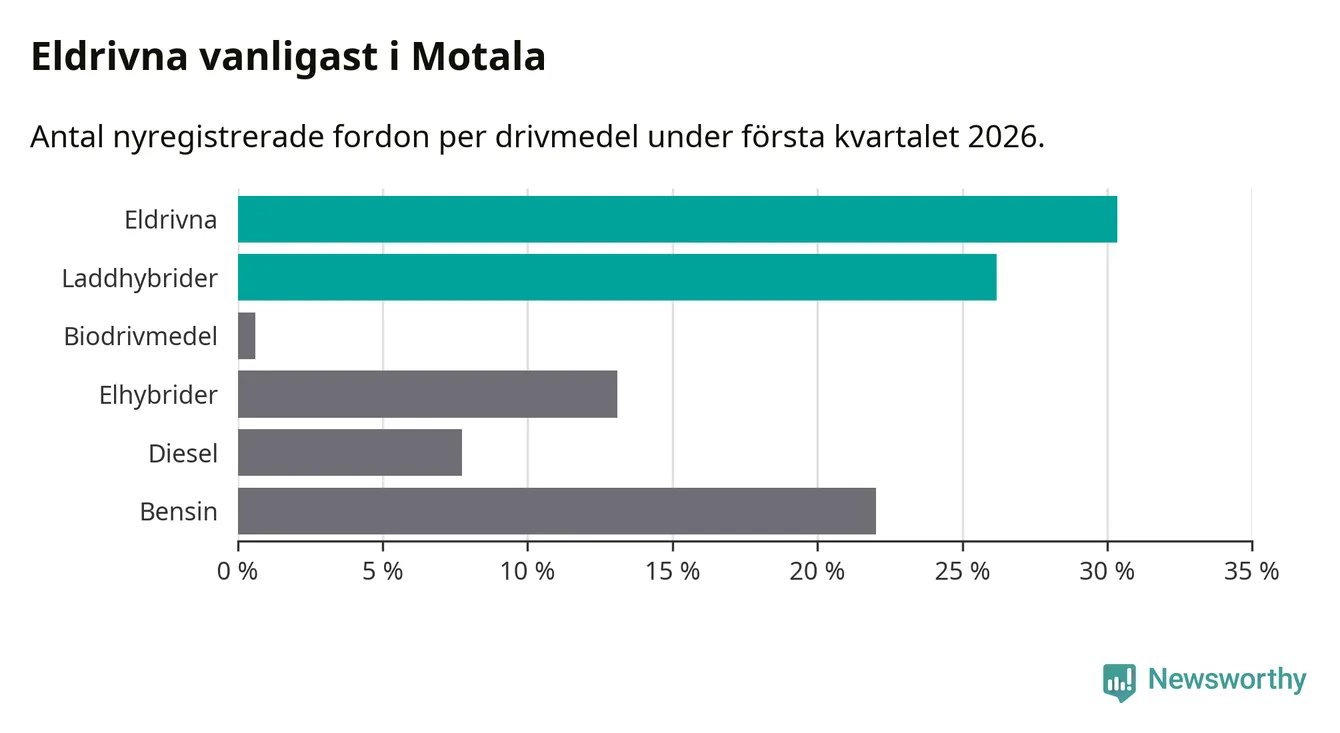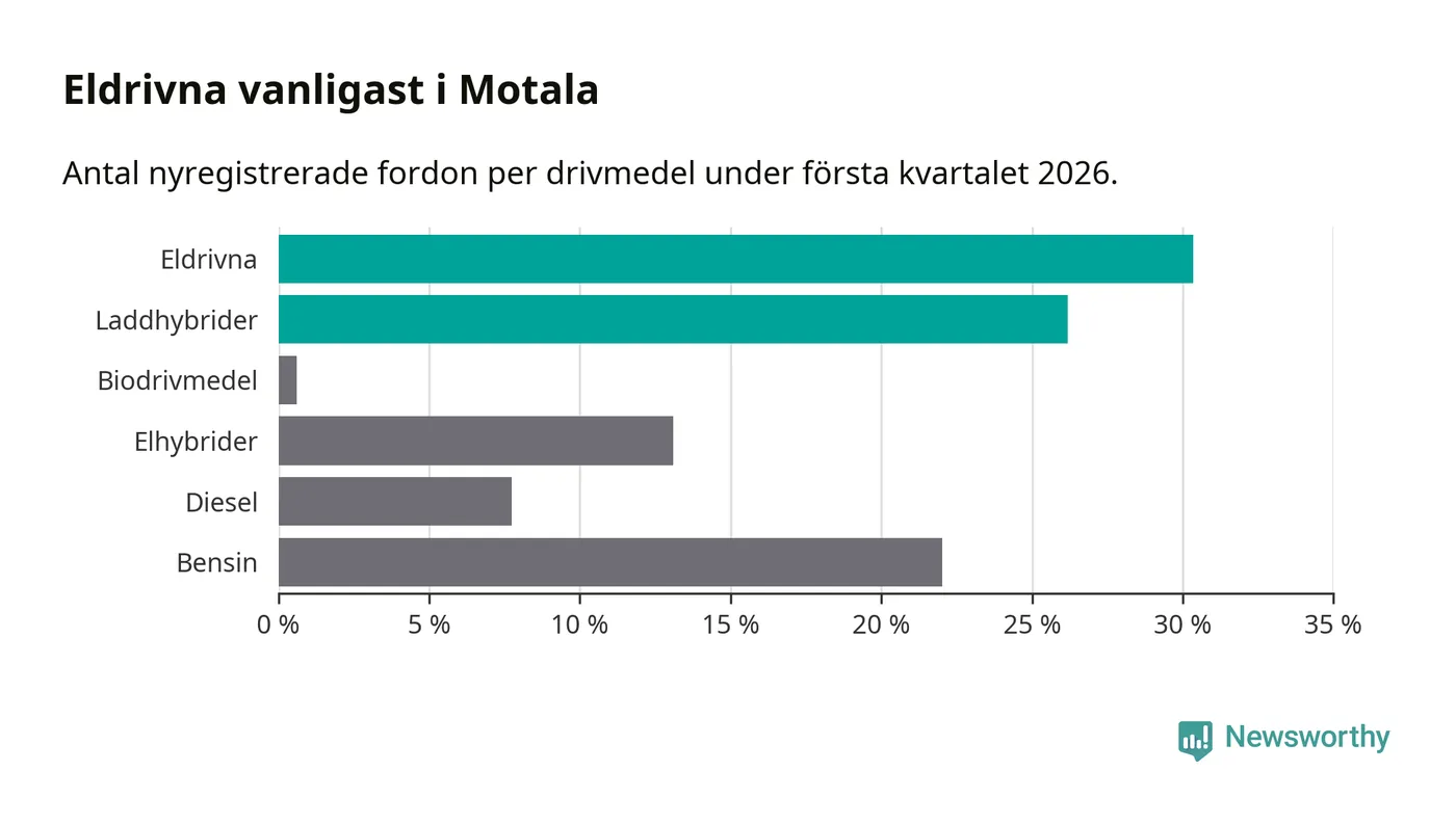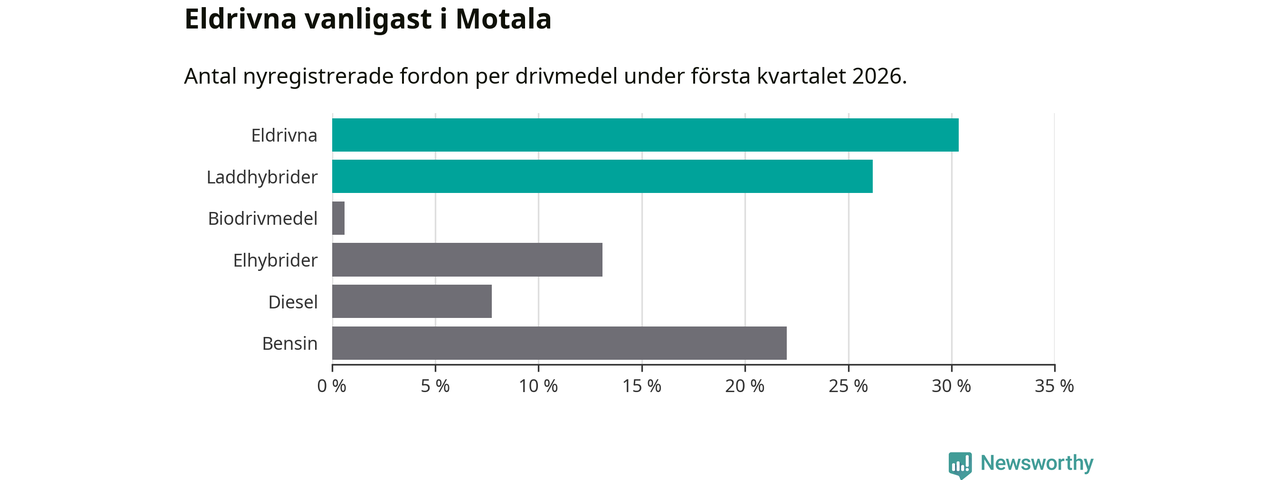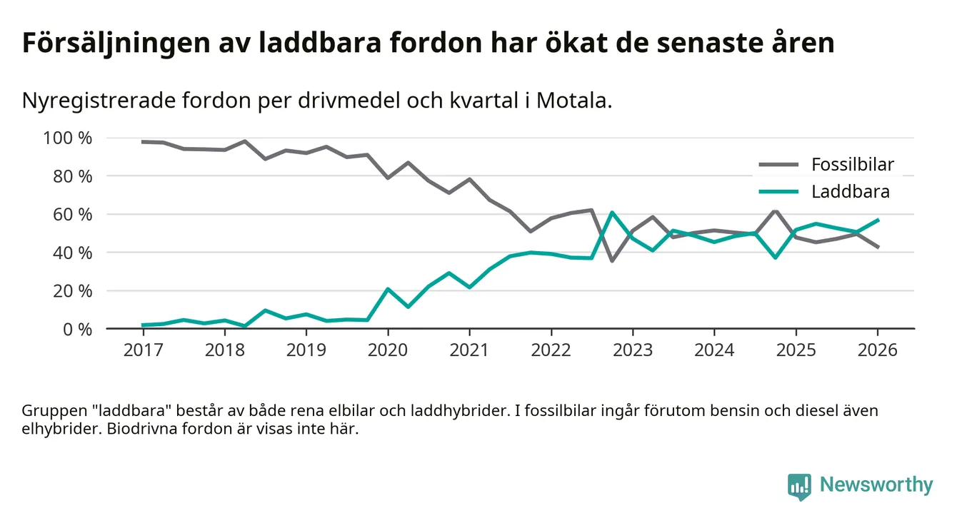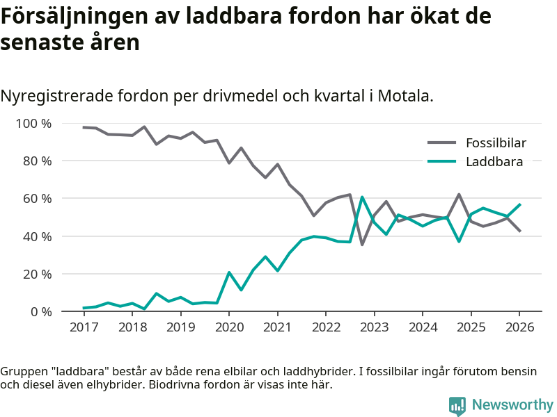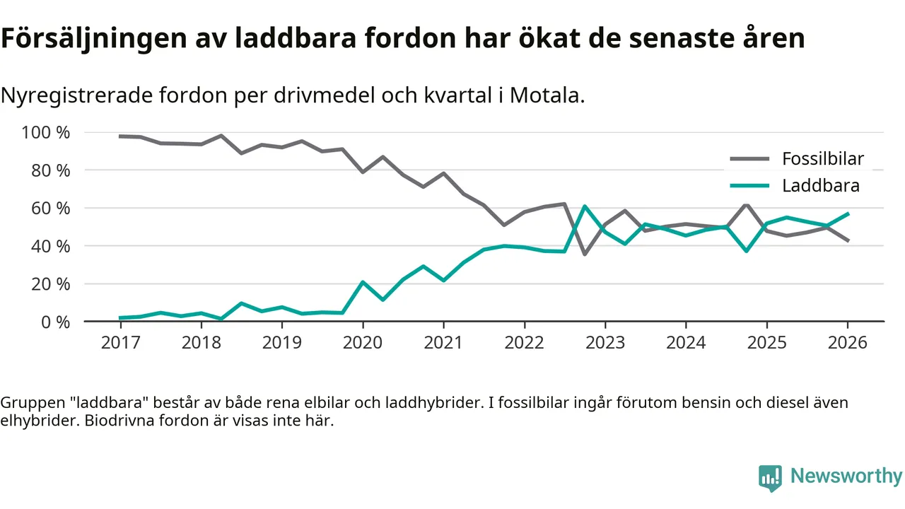 Under första kvartalet 2026 var 57 procent av alla nyregistrerade personbilar i Motala laddbara (sammanlagt registrerades 168 nya bilar). Merparten av de laddbara bilarna var rena elbilar (30 procent av alla).