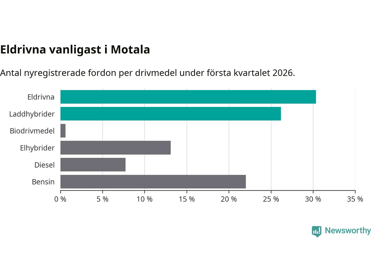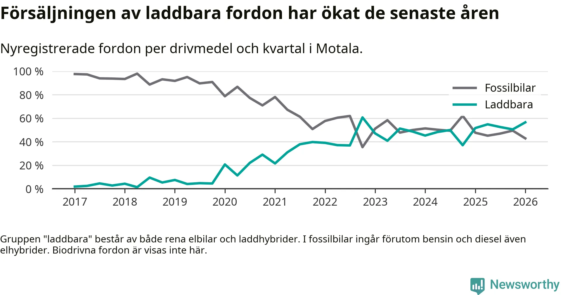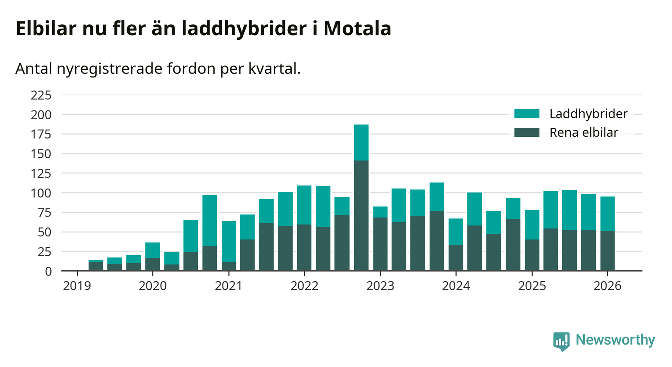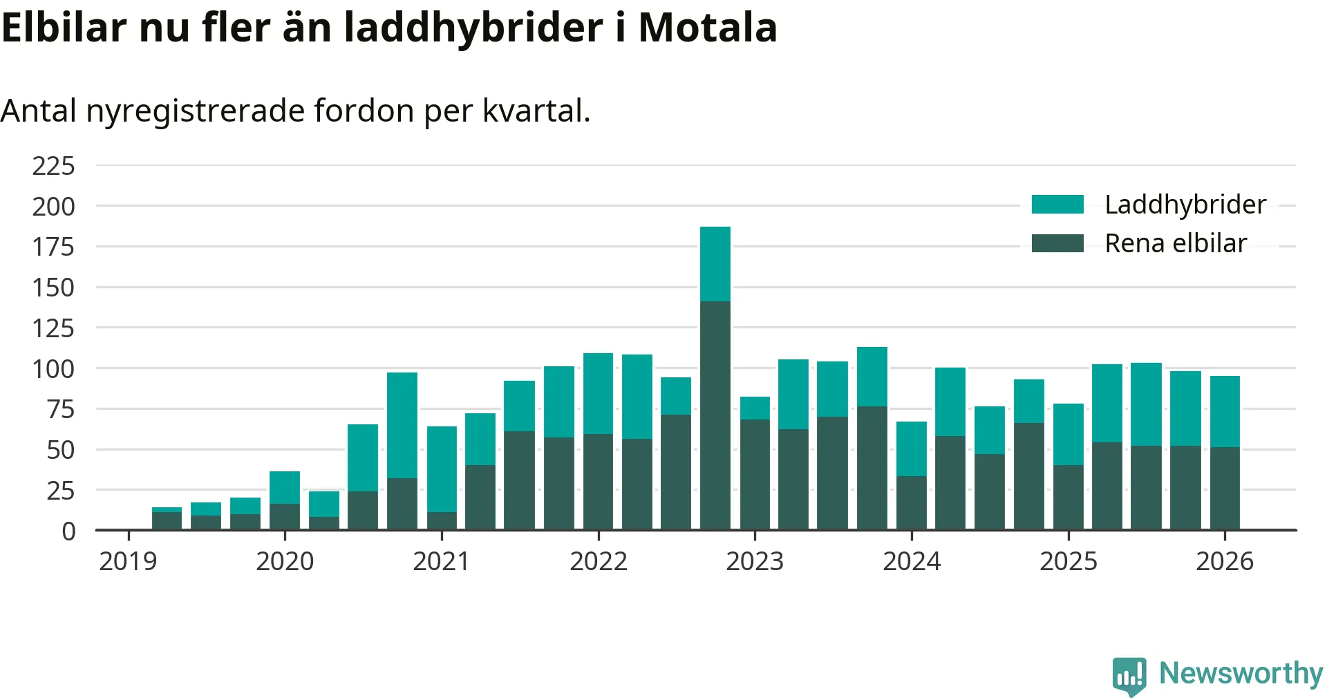 Under första kvartalet 2026 var 57 procent av alla nyregistrerade personbilar i Motala laddbara (sammanlagt registrerades 168 nya bilar). Merparten av de laddbara bilarna var rena elbilar (30 procent av alla).