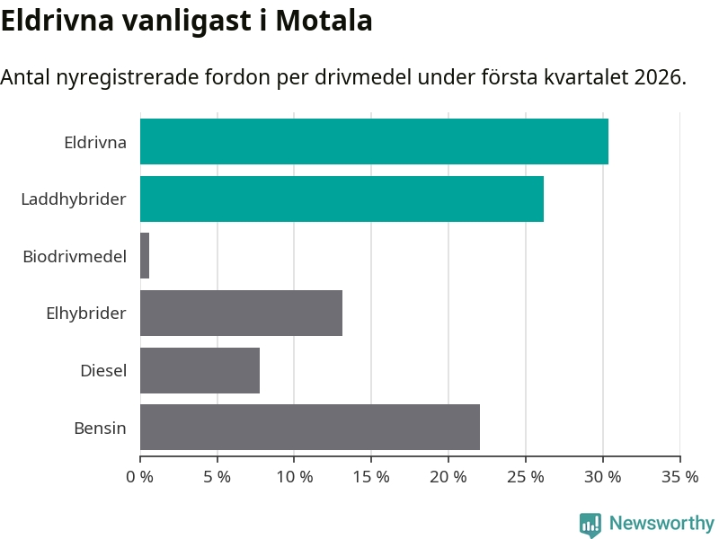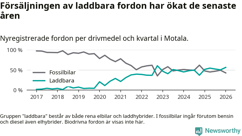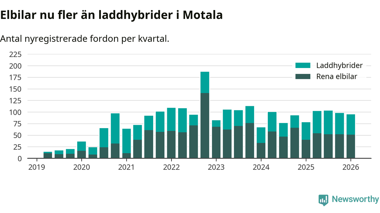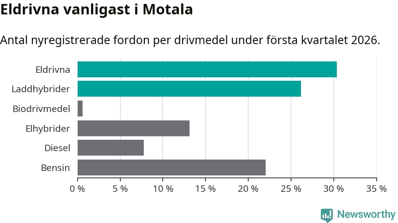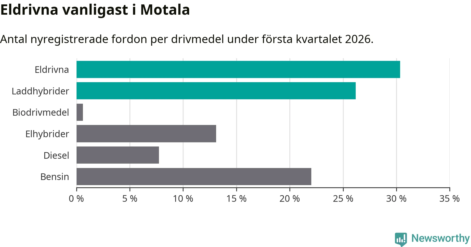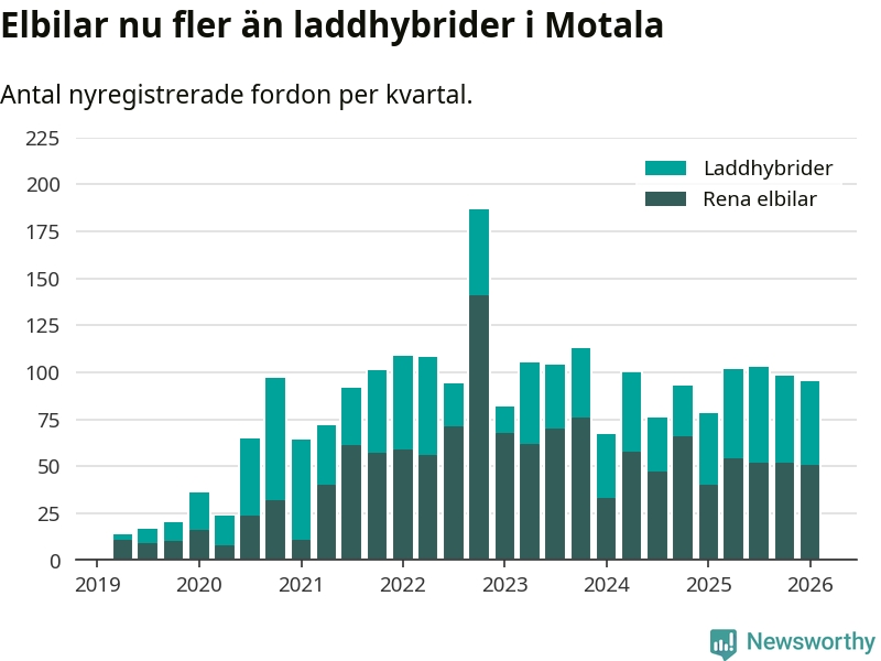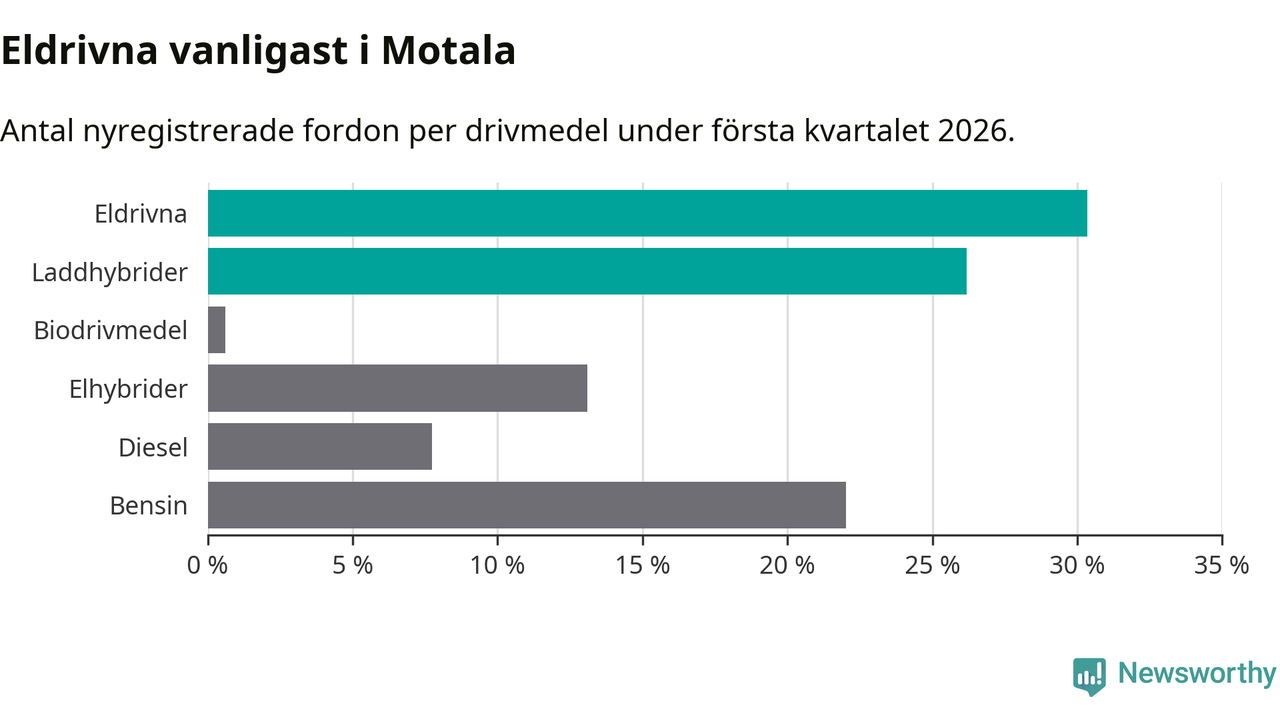 Under första kvartalet 2026 var 57 procent av alla nyregistrerade personbilar i Motala laddbara (sammanlagt registrerades 168 nya bilar). Merparten av de laddbara bilarna var rena elbilar (30 procent av alla).