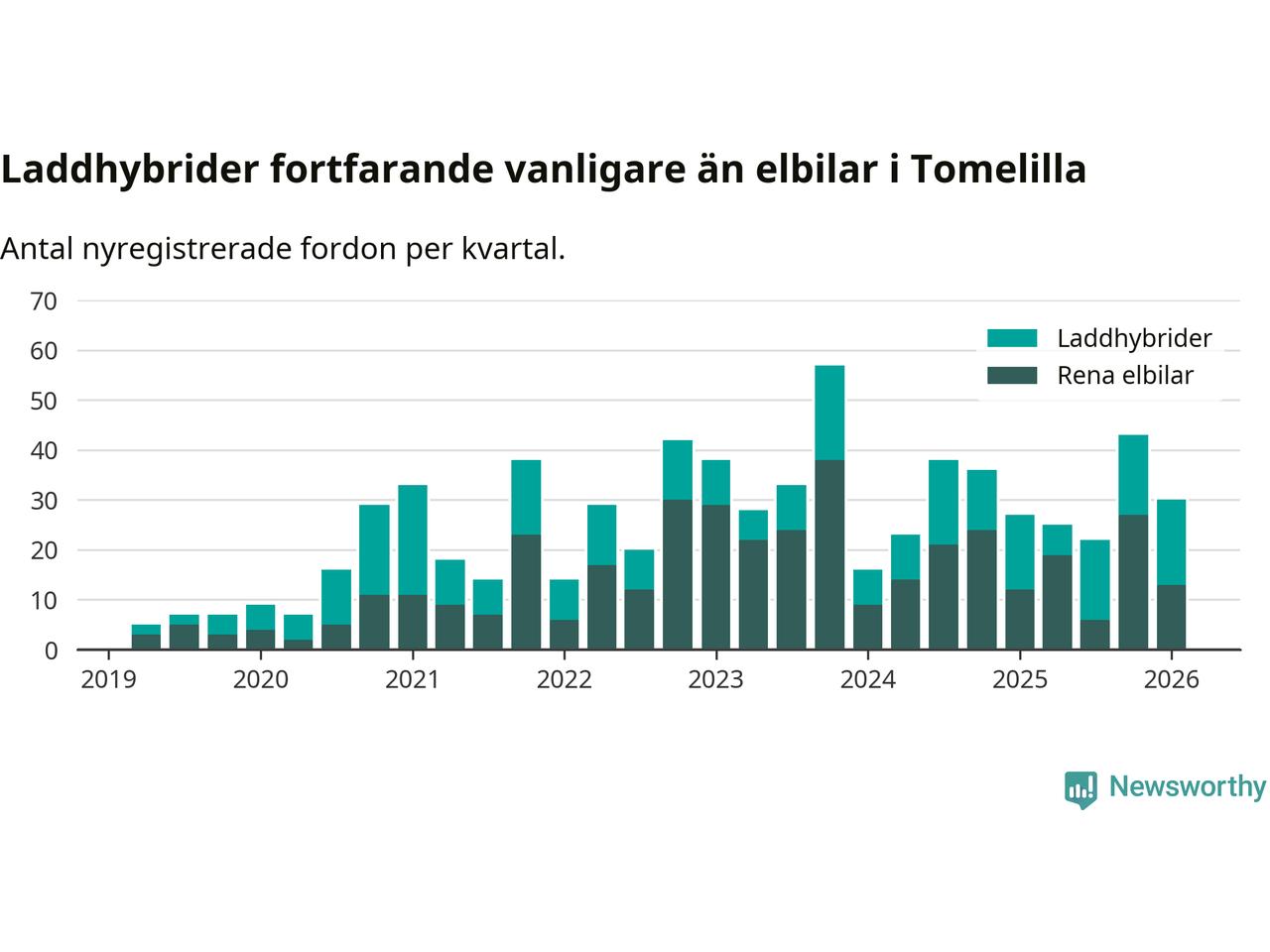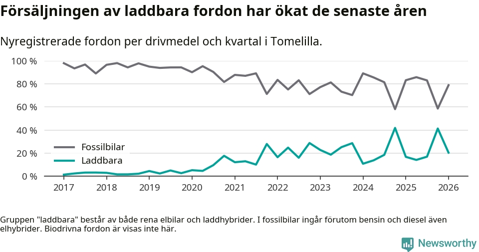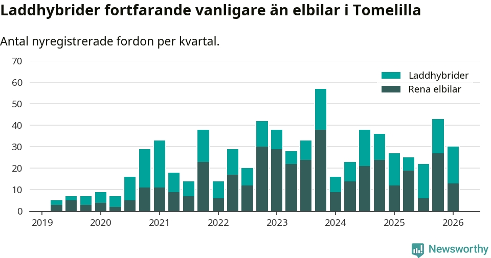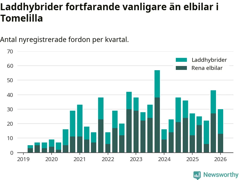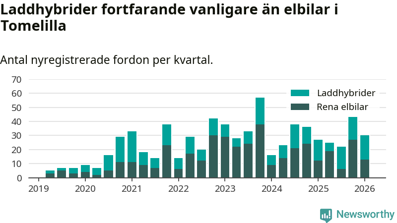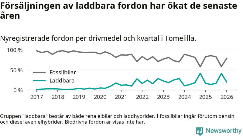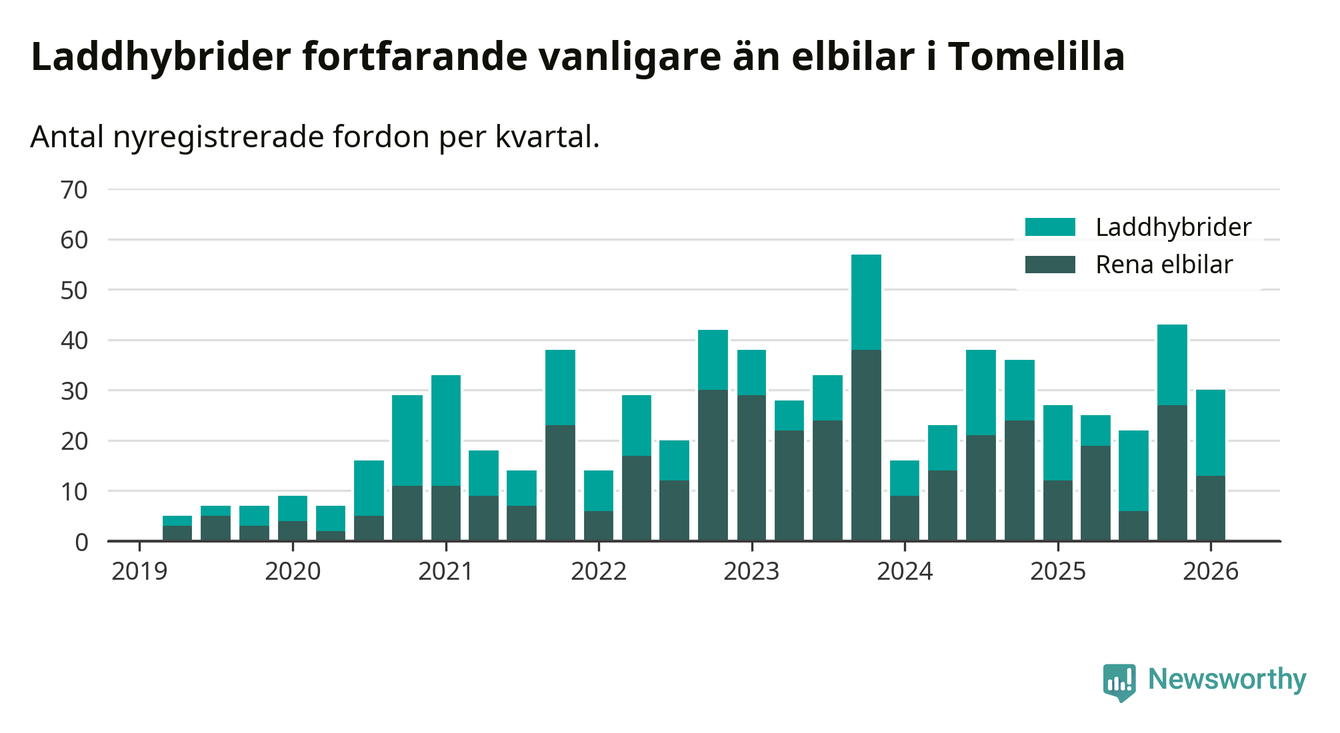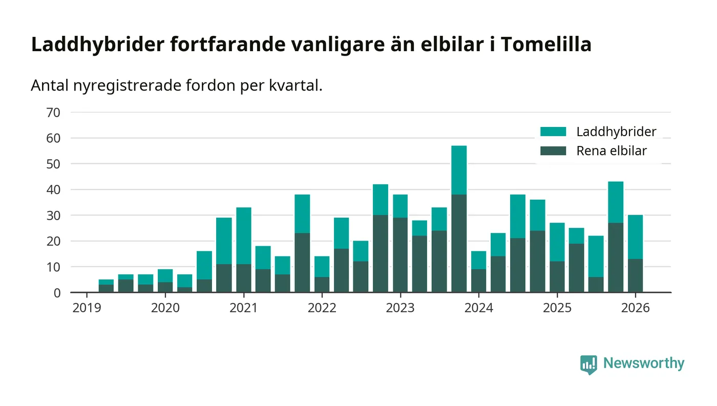 I Tomelilla minskade andelen laddbara bilar under första kvartalet jämfört med kvartalet innan (−20,9 procentenheter). Nyregistreringen peakade under fjärde kvartalet 2024 då 42 procent av de nya bilarna var laddbara.