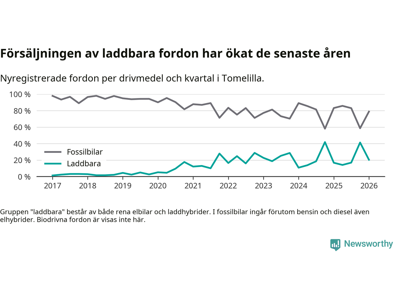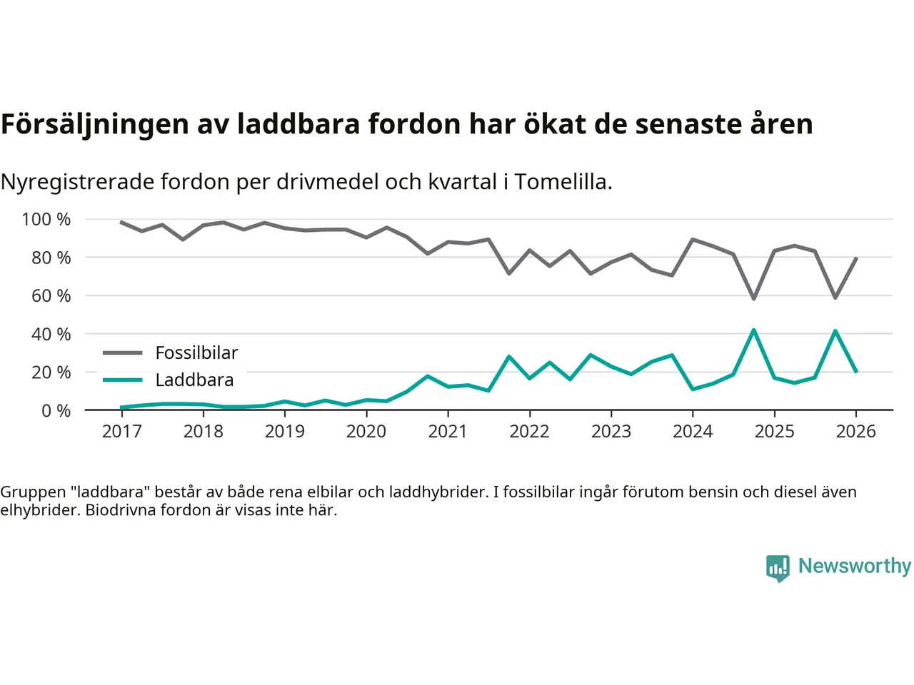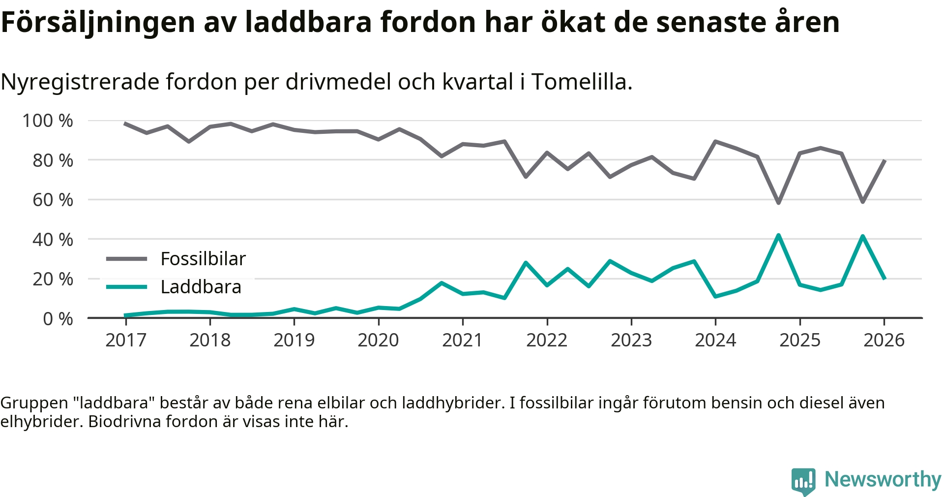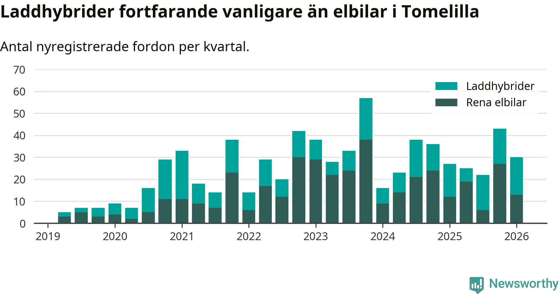 I Tomelilla minskade andelen laddbara bilar under första kvartalet jämfört med kvartalet innan (−20,9 procentenheter). Nyregistreringen peakade under fjärde kvartalet 2024 då 42 procent av de nya bilarna var laddbara.