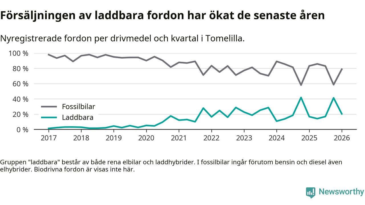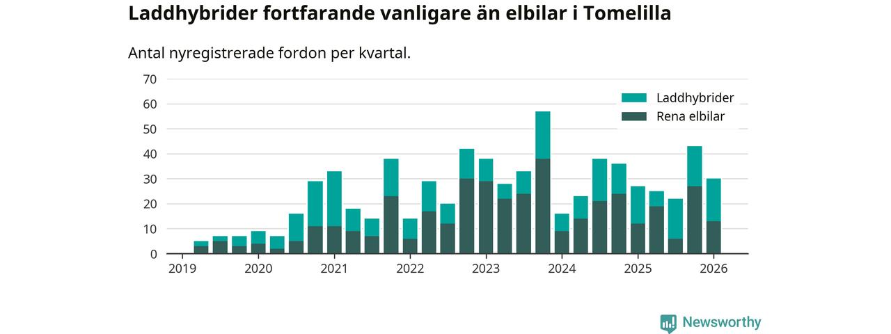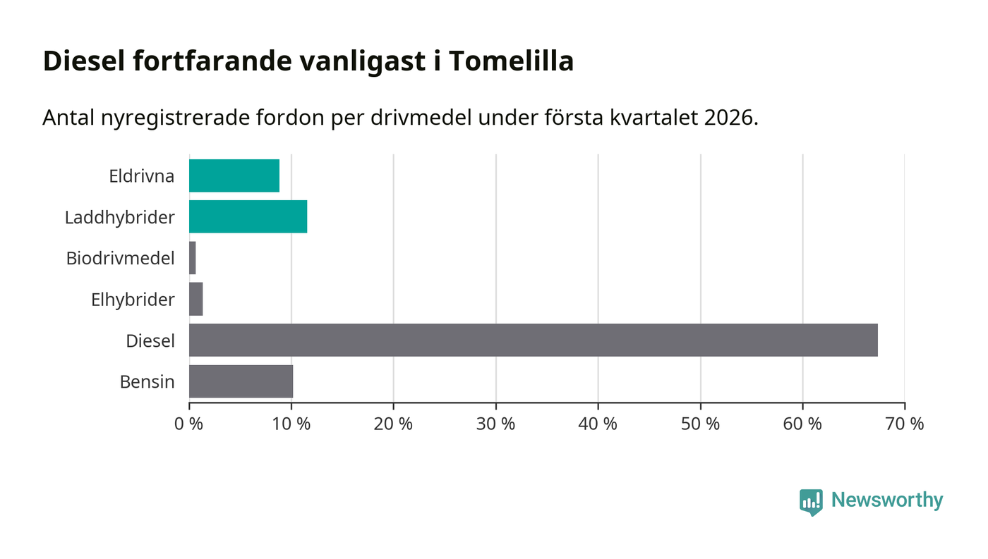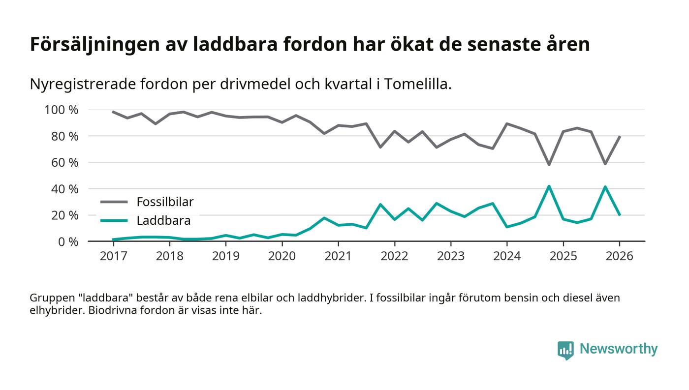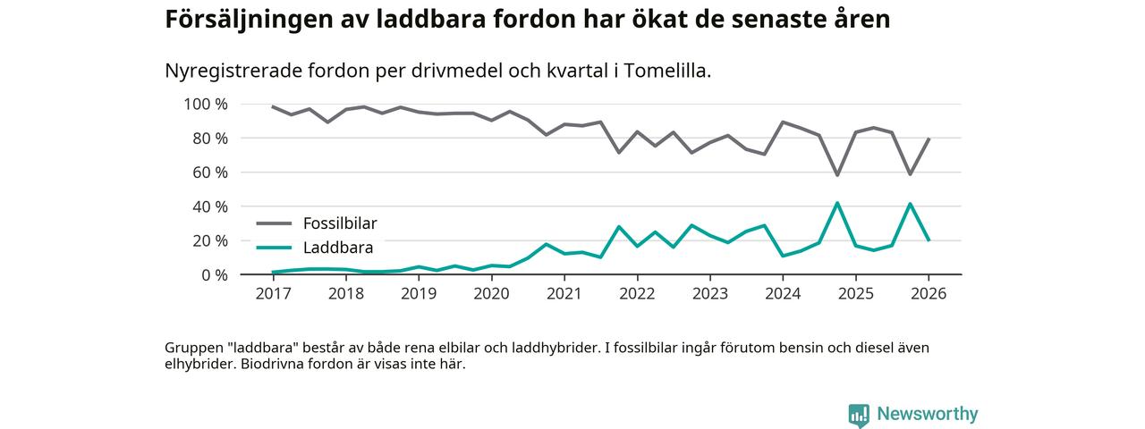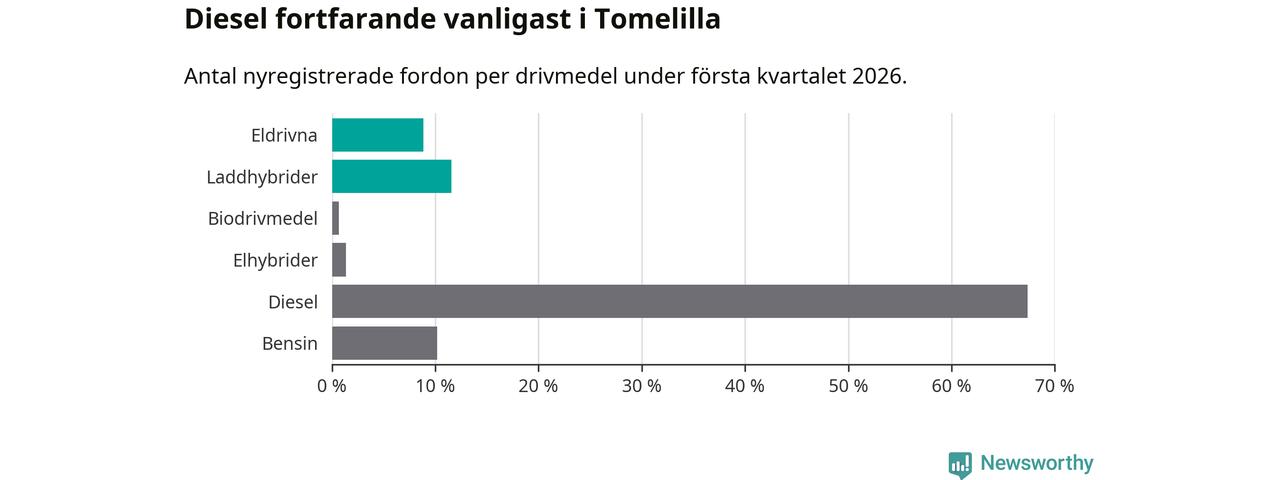Under första kvartalet 2026 var 20 procent av alla nyregistrerade personbilar i Tomelilla laddbara (sammanlagt registrerades 147 nya bilar). Merparten av de laddbara bilarna var så kallade laddhybrider, det vill säga fordon som går att ladda och köra på el, men som även har en förbränningsmotor. 9 procent av alla nya bilar var rena elbilar.