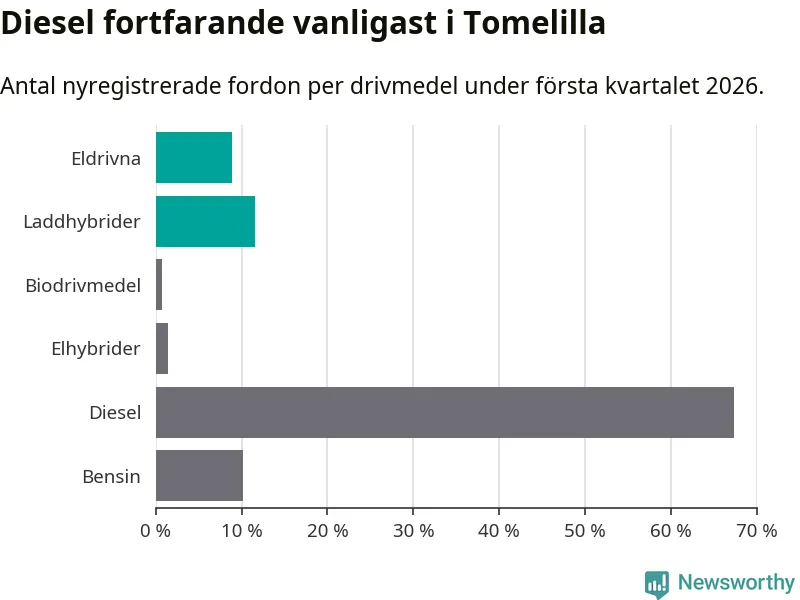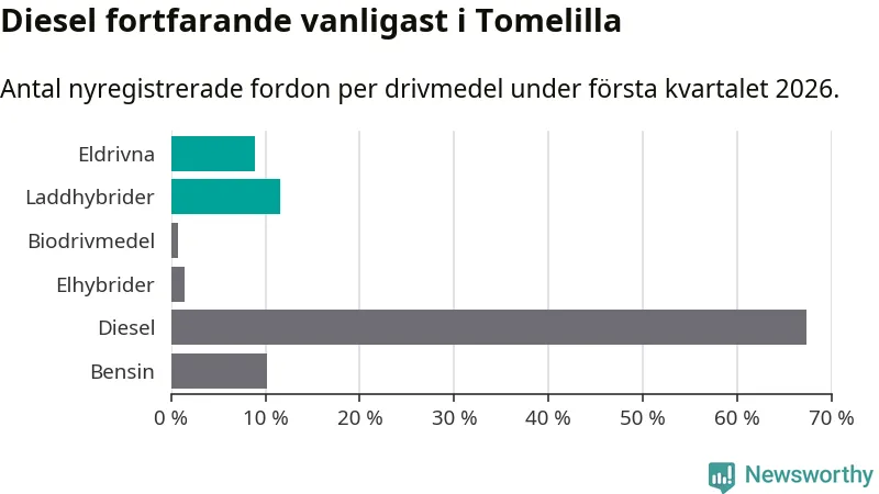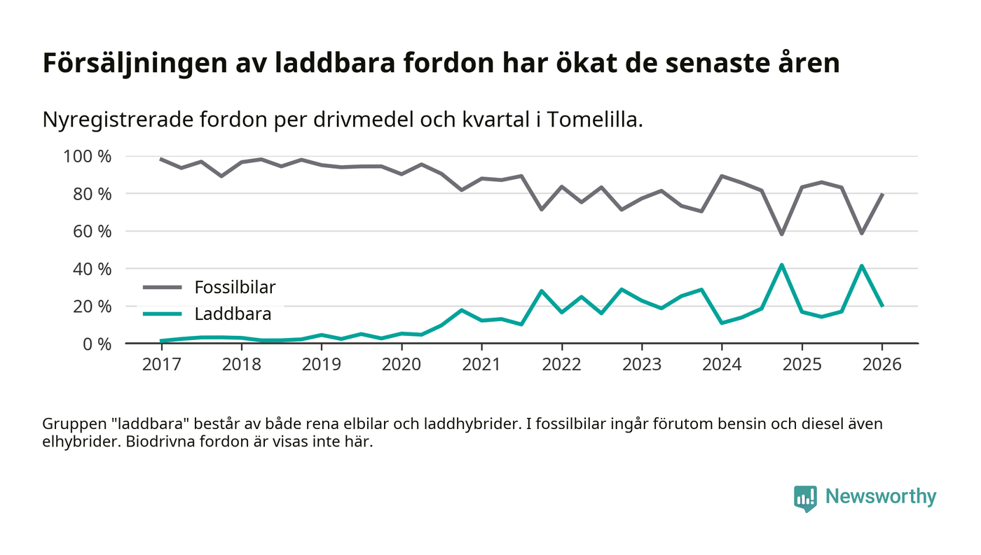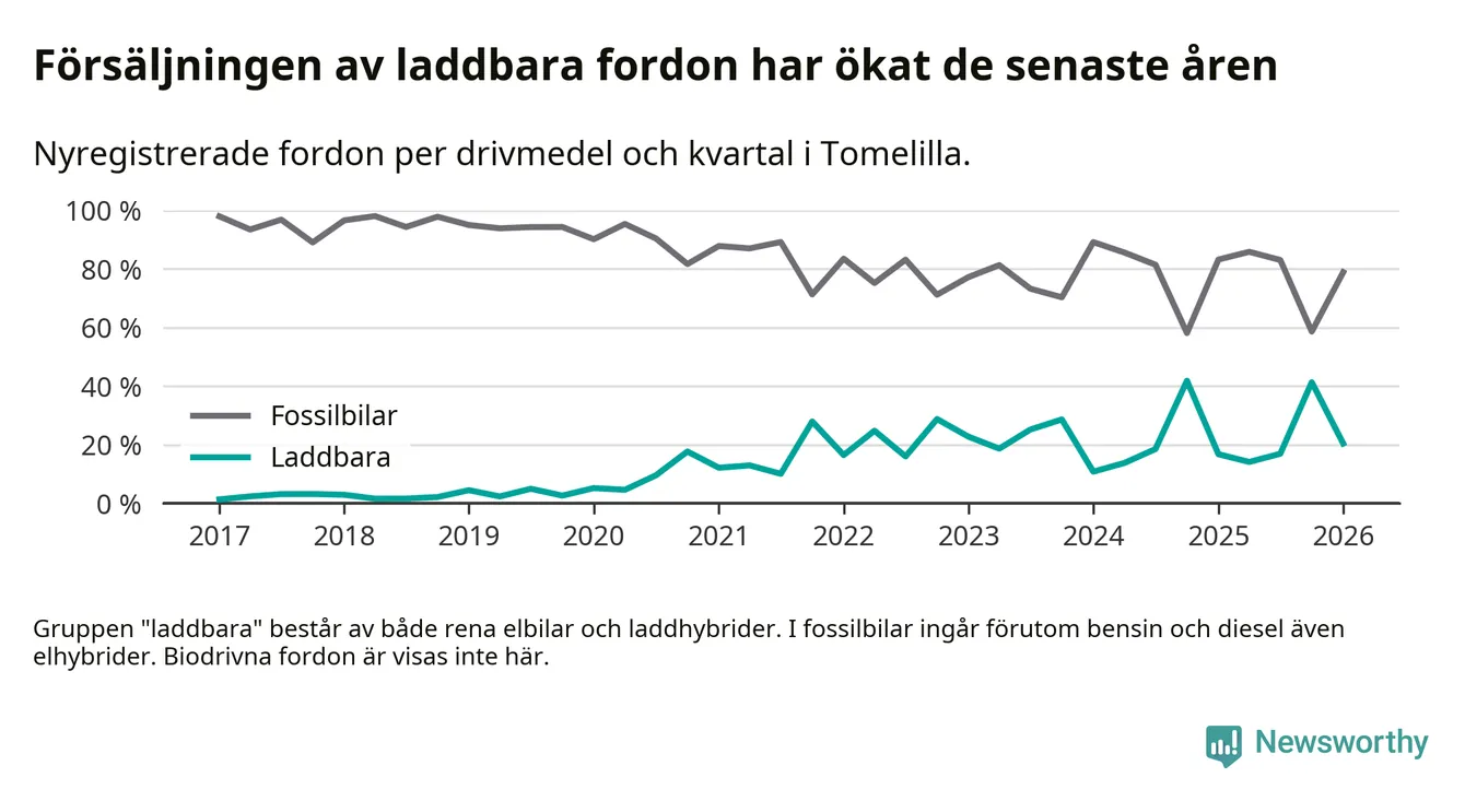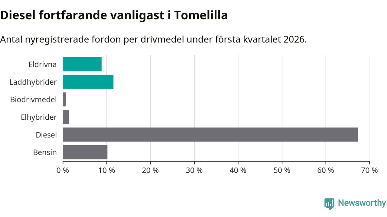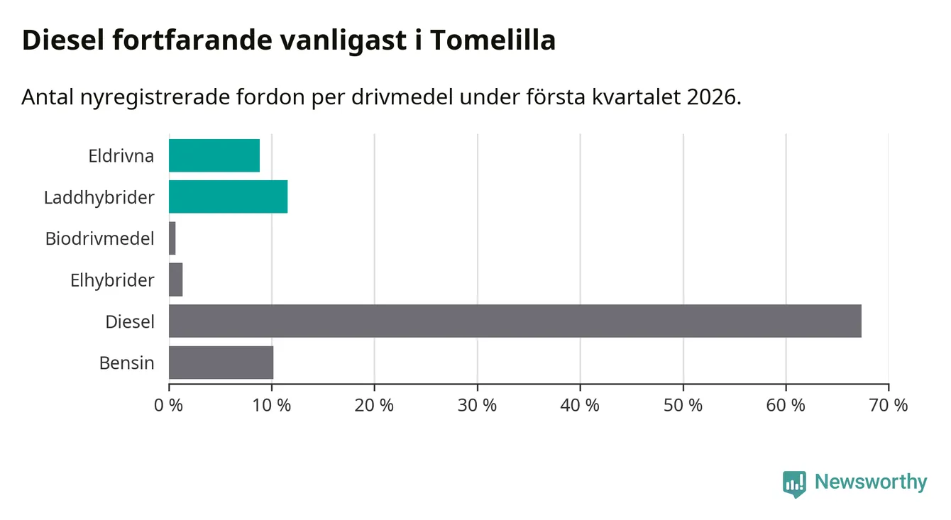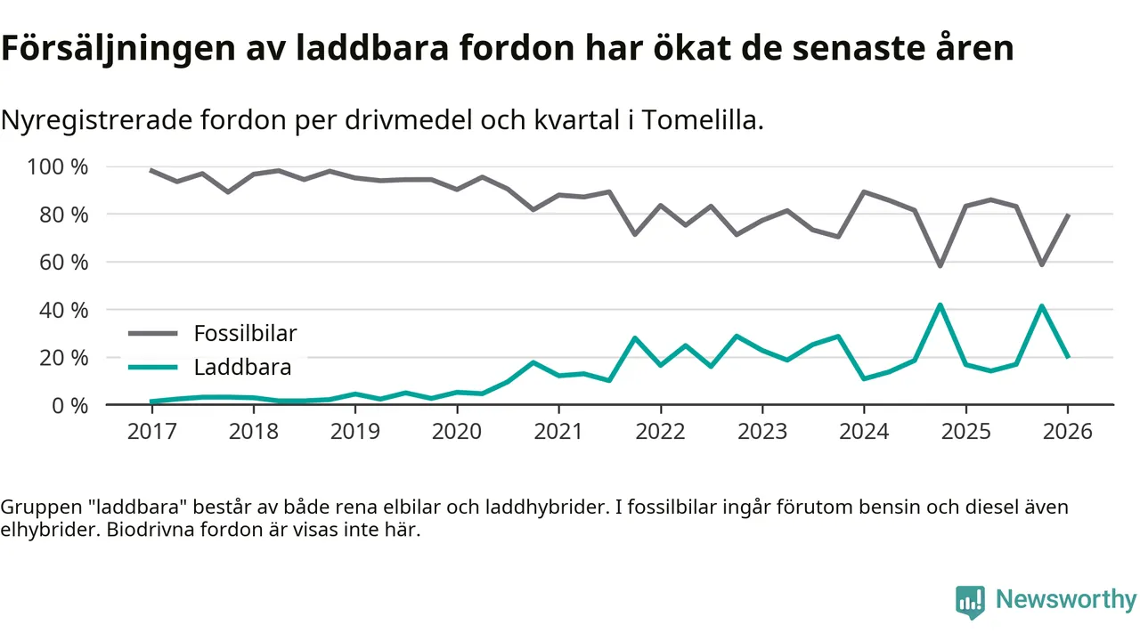 Under första kvartalet 2026 var 20 procent av alla nyregistrerade personbilar i Tomelilla laddbara (sammanlagt registrerades 147 nya bilar). Merparten av de laddbara bilarna var så kallade laddhybrider, det vill säga fordon som går att ladda och köra på el, men som även har en förbränningsmotor. 9 procent av alla nya bilar var rena elbilar.