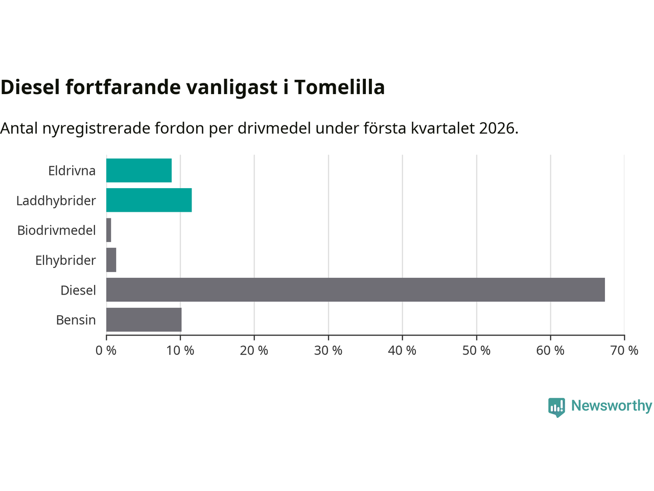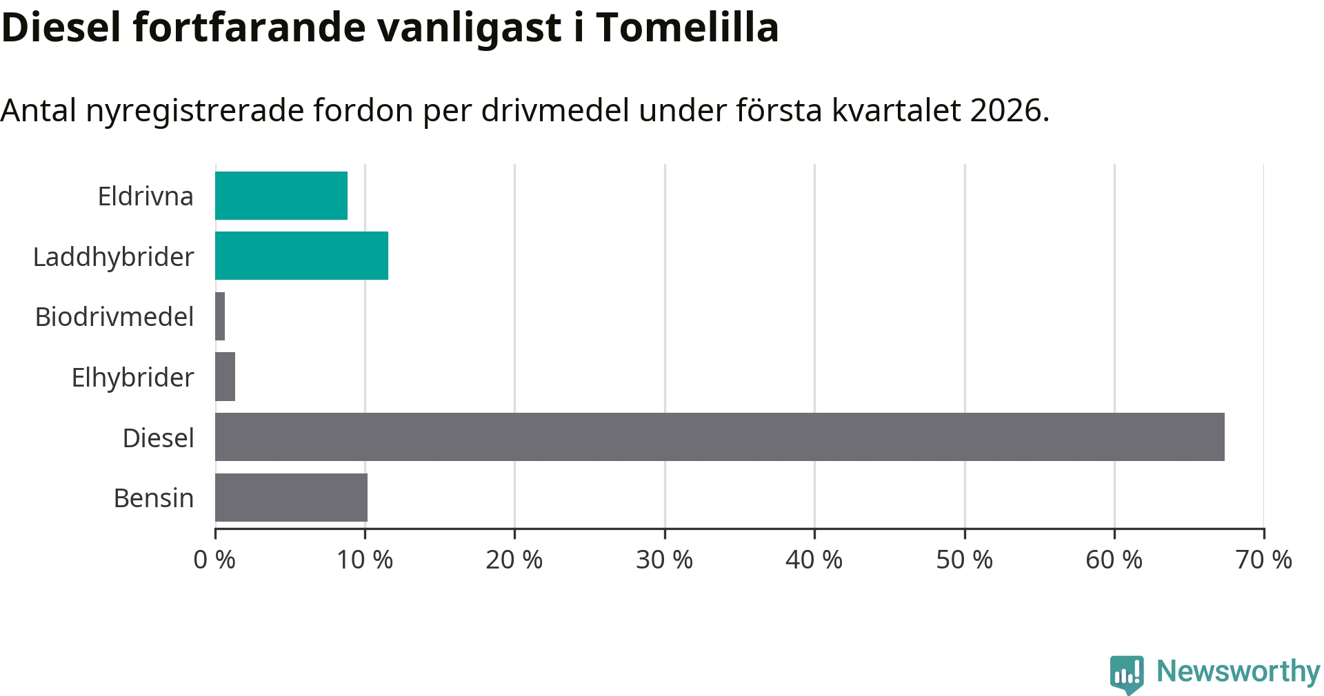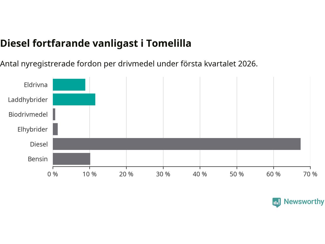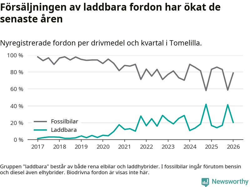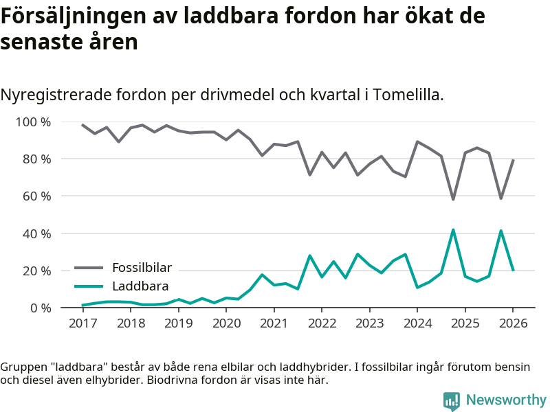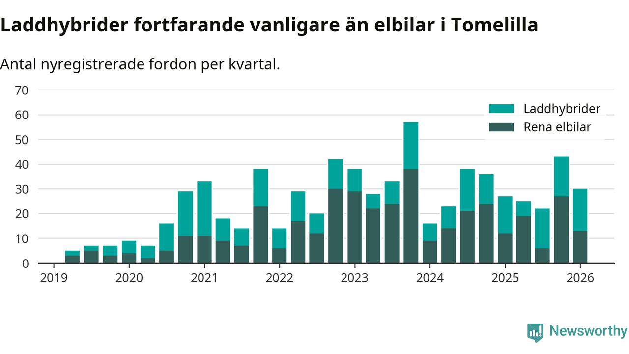 Under första kvartalet 2026 var 20 procent av alla nyregistrerade personbilar i Tomelilla laddbara (sammanlagt registrerades 147 nya bilar). Merparten av de laddbara bilarna var så kallade laddhybrider, det vill säga fordon som går att ladda och köra på el, men som även har en förbränningsmotor. 9 procent av alla nya bilar var rena elbilar.