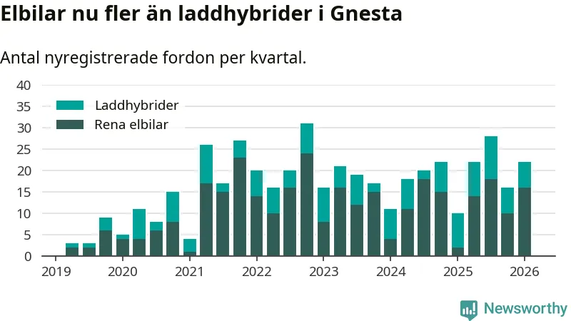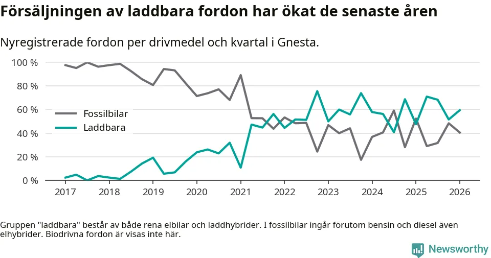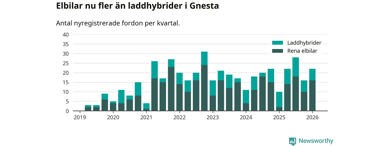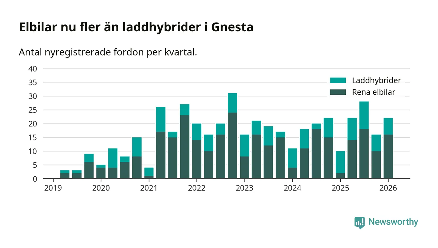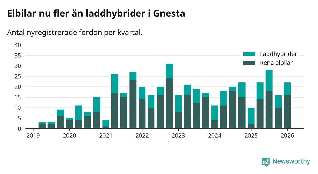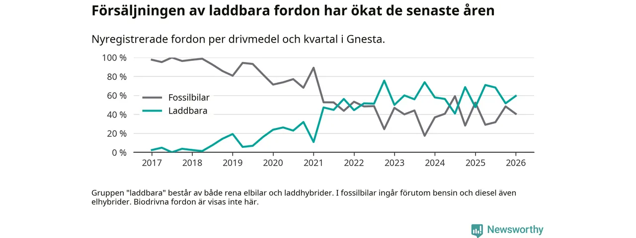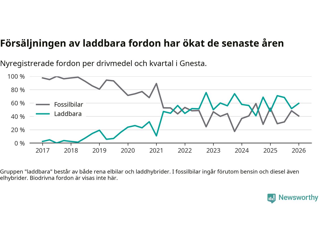 Under första kvartalet 2026 var 59 procent av alla nyregistrerade personbilar i Gnesta laddbara (sammanlagt registrerades 37 nya bilar). Merparten av de laddbara bilarna var rena elbilar (43 procent av alla).