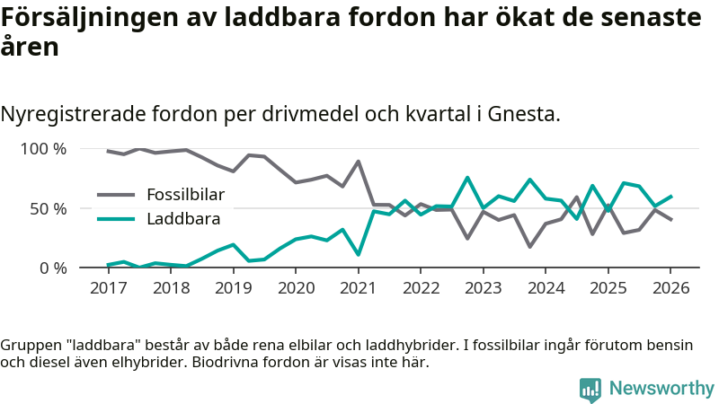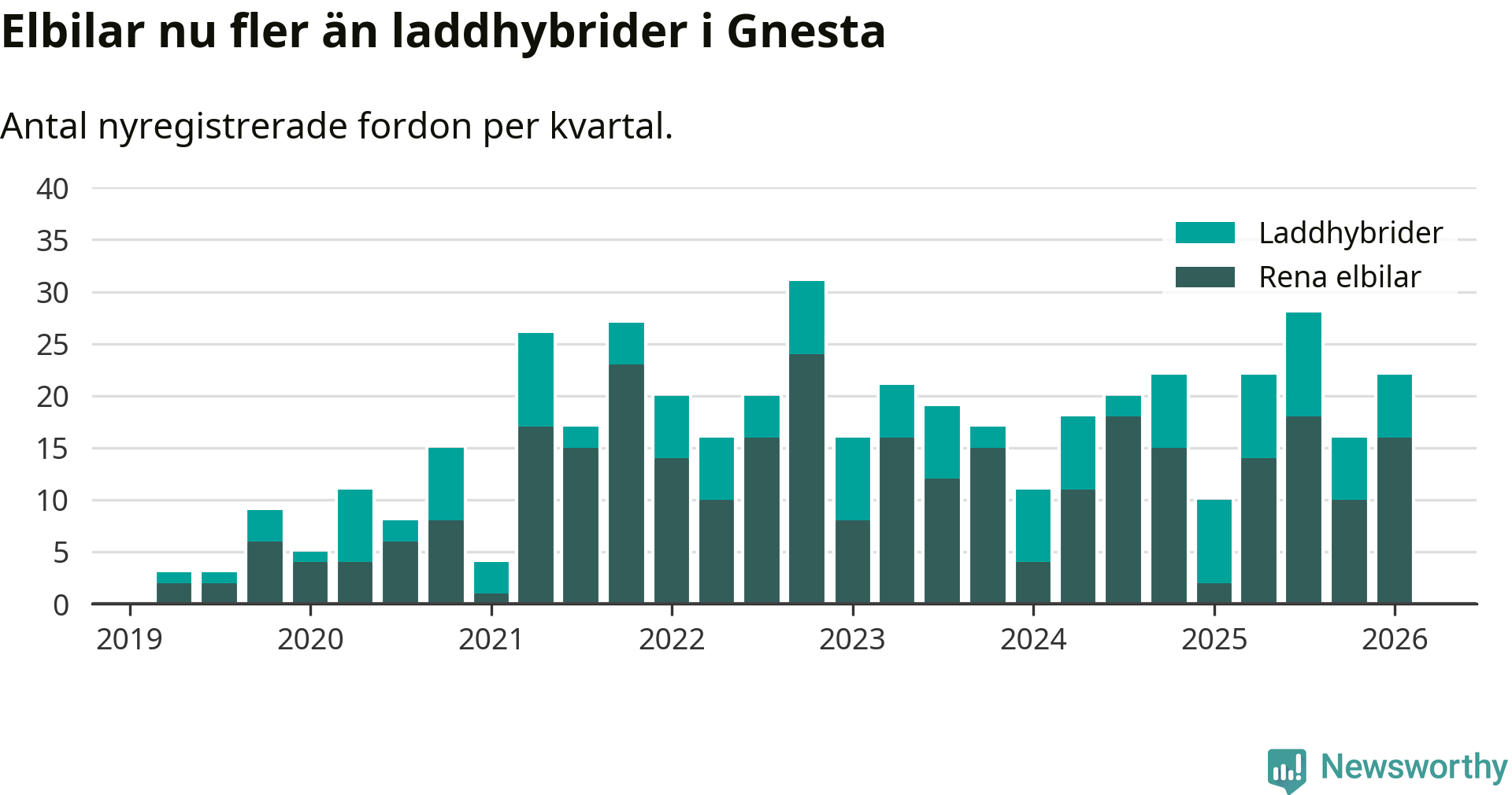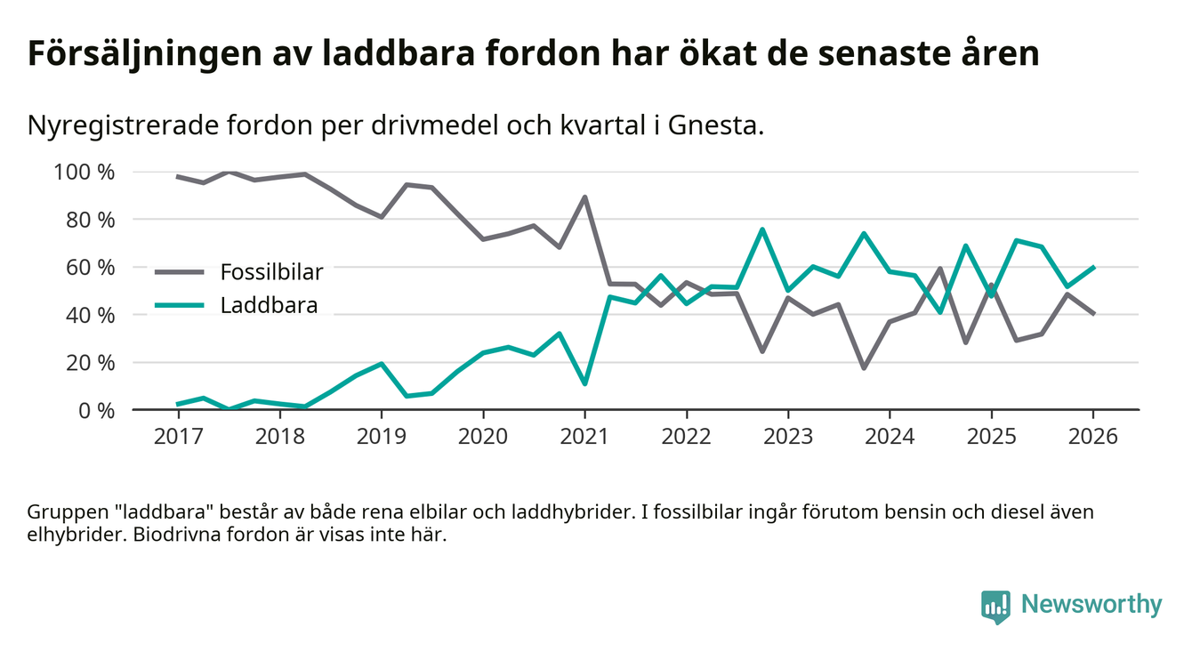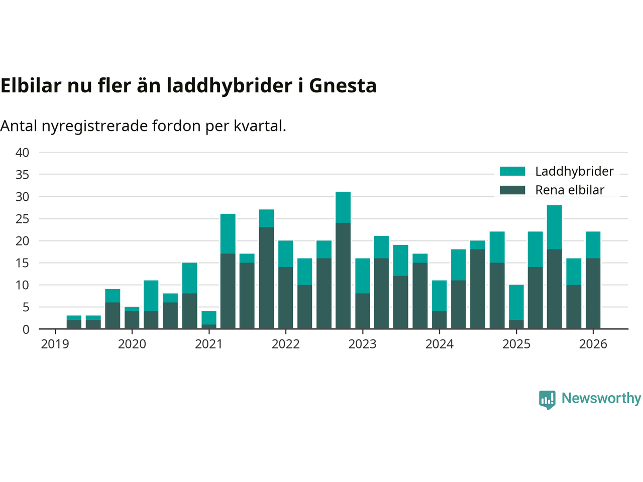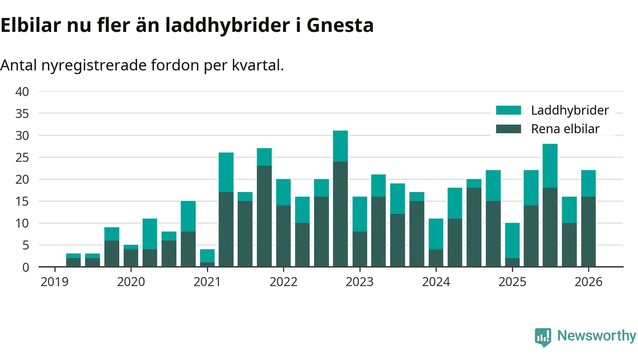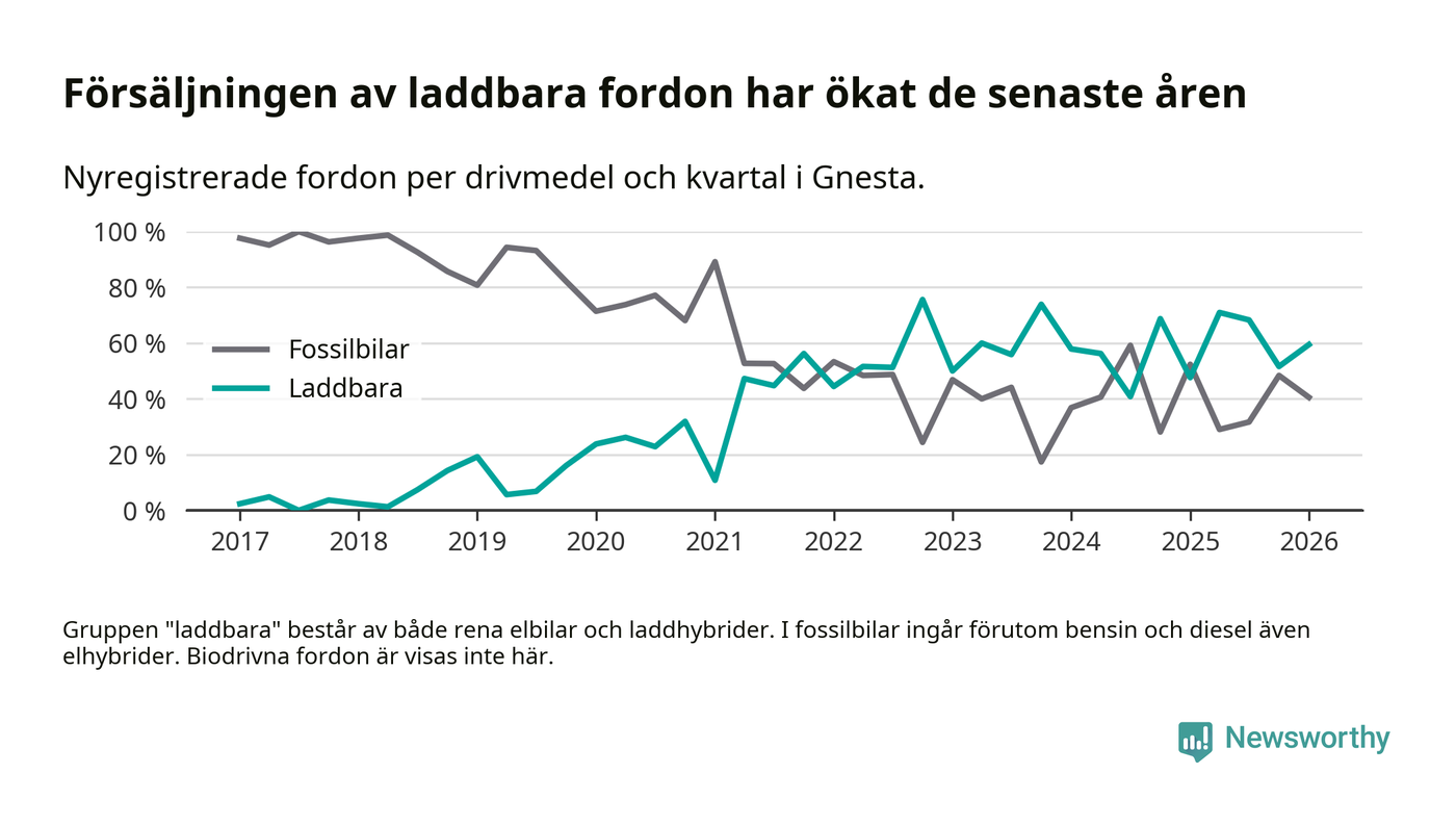 Under första kvartalet 2026 var 59 procent av alla nyregistrerade personbilar i Gnesta laddbara (sammanlagt registrerades 37 nya bilar). Merparten av de laddbara bilarna var rena elbilar (43 procent av alla).