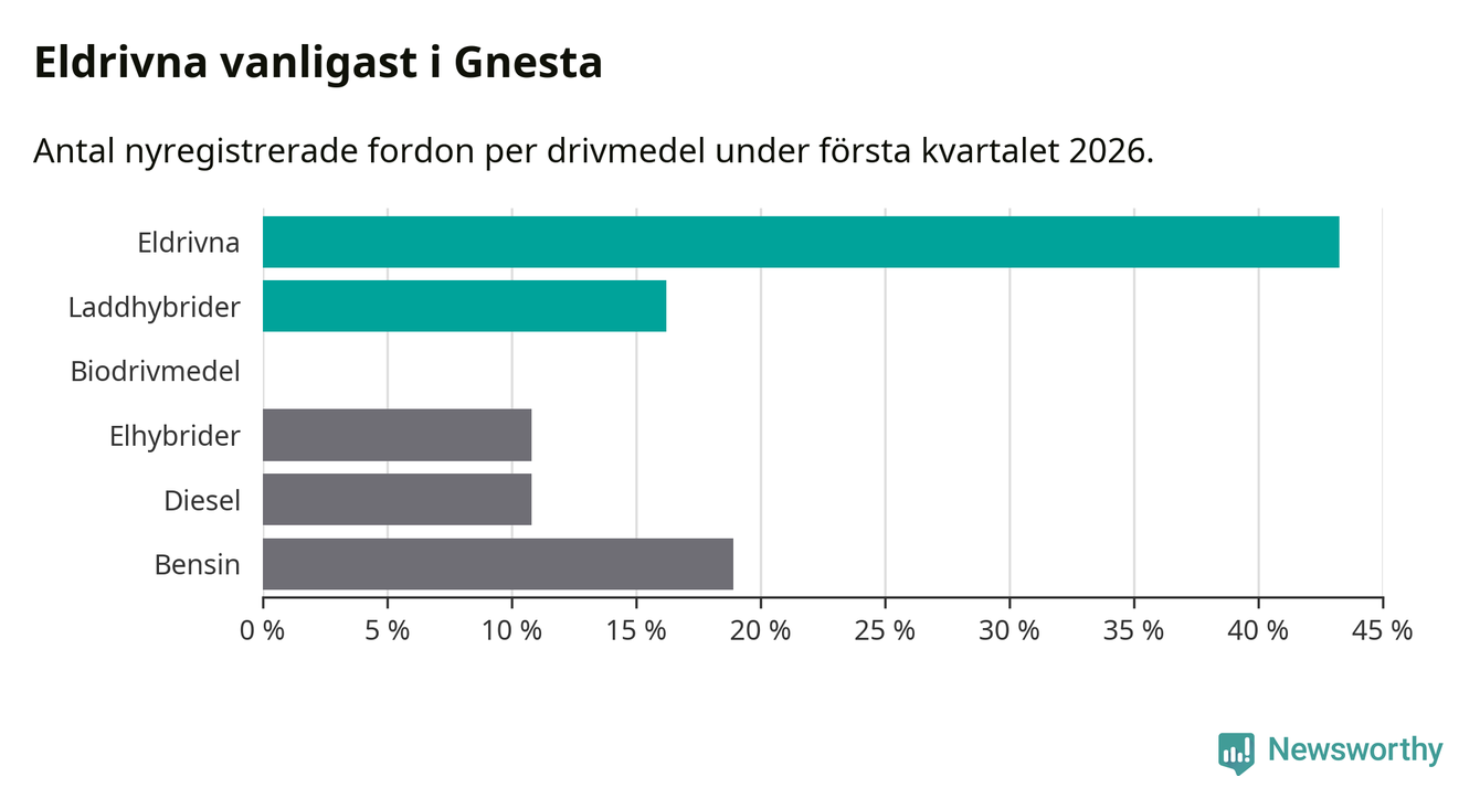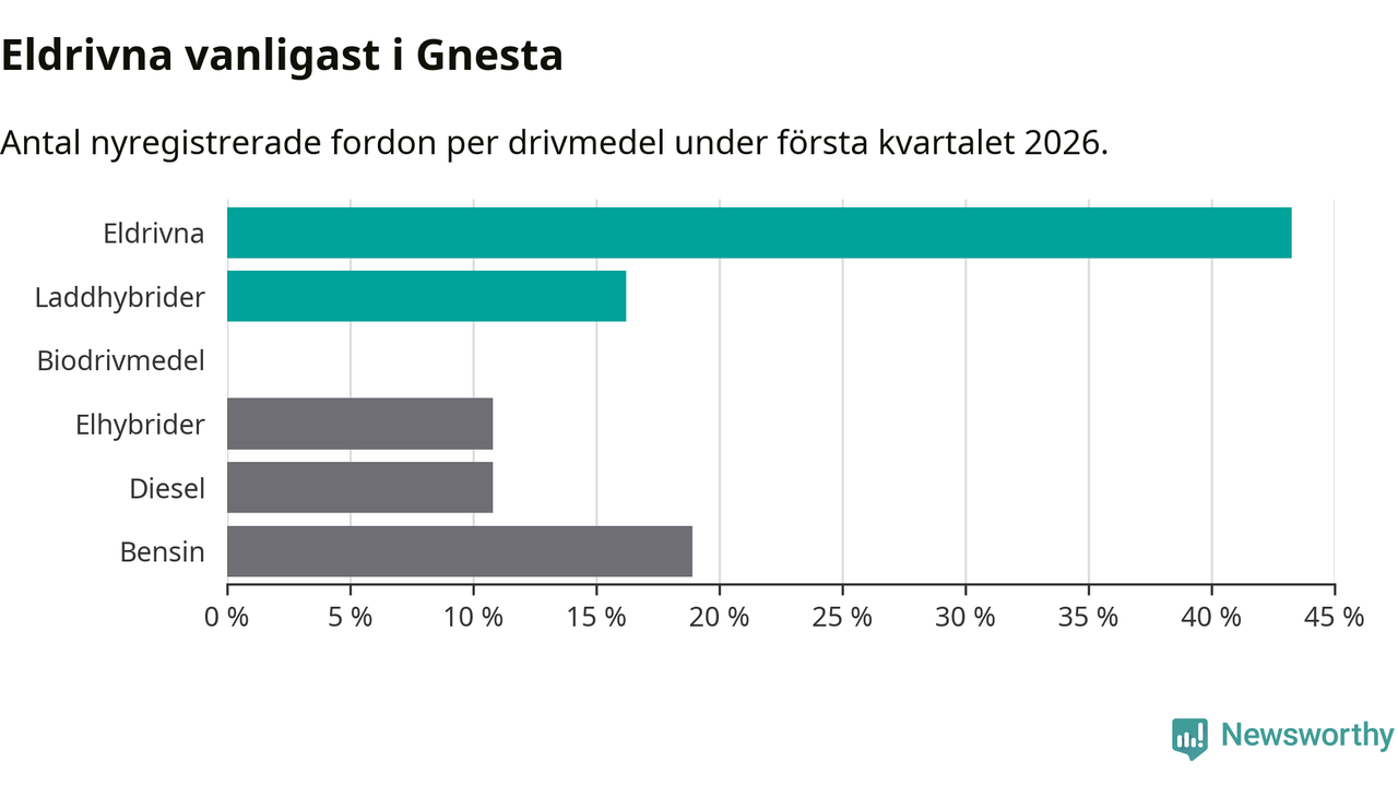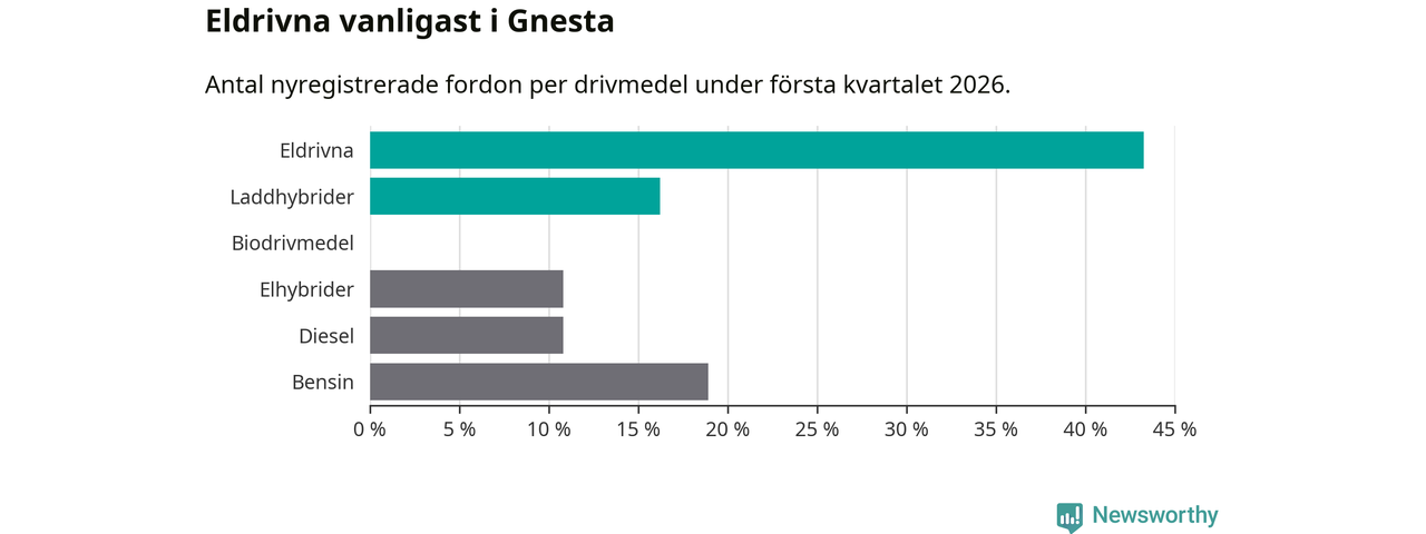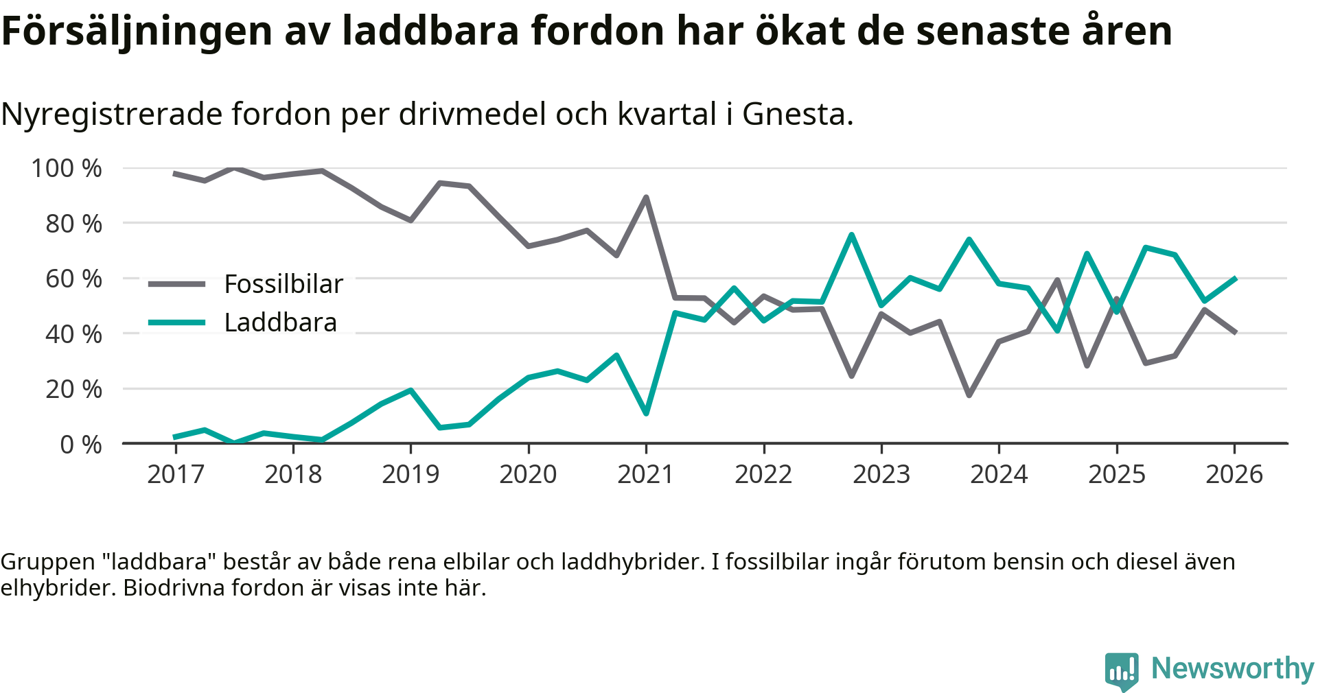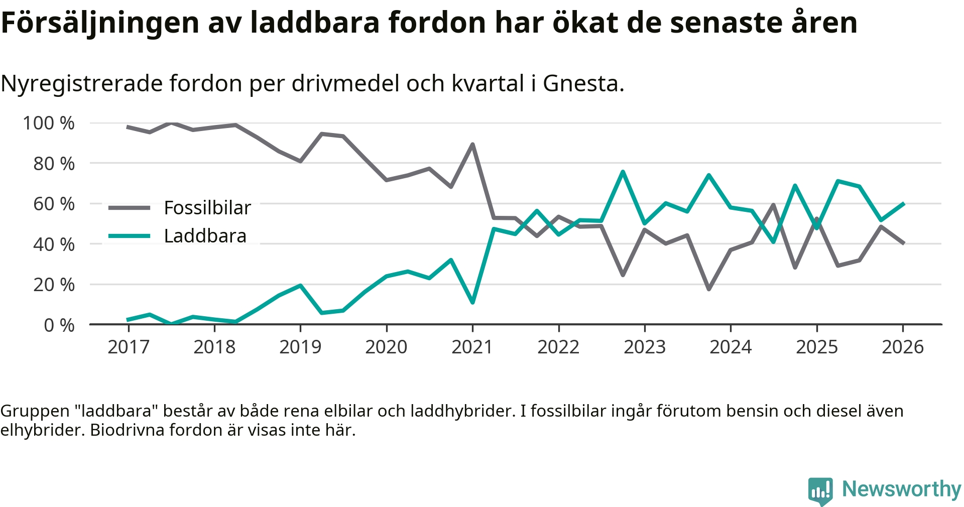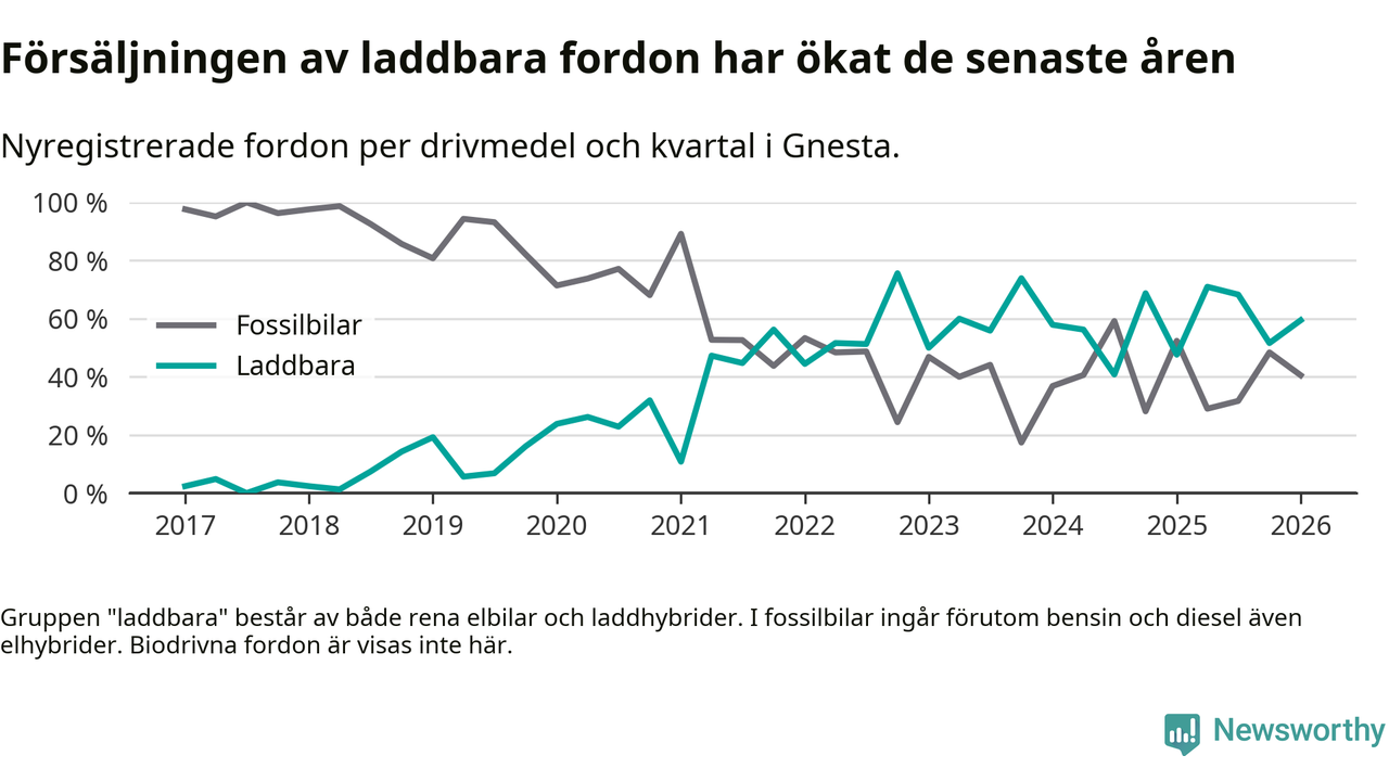 Under första kvartalet 2026 var 59 procent av alla nyregistrerade personbilar i Gnesta laddbara (sammanlagt registrerades 37 nya bilar). Merparten av de laddbara bilarna var rena elbilar (43 procent av alla).