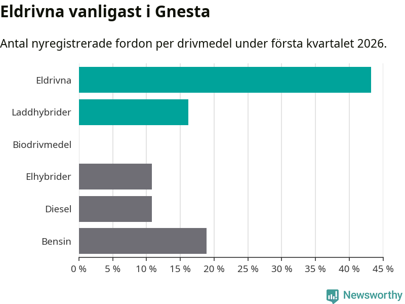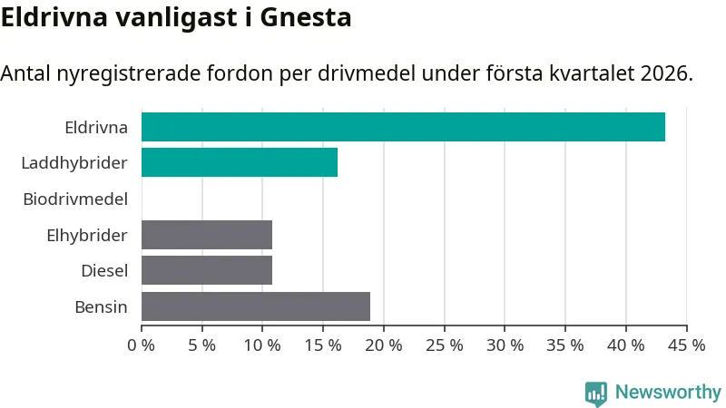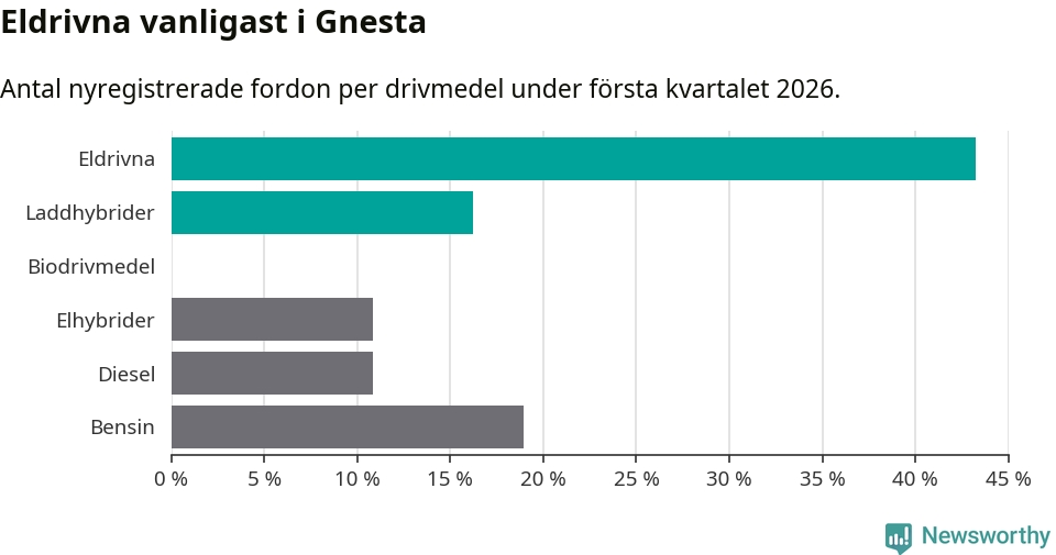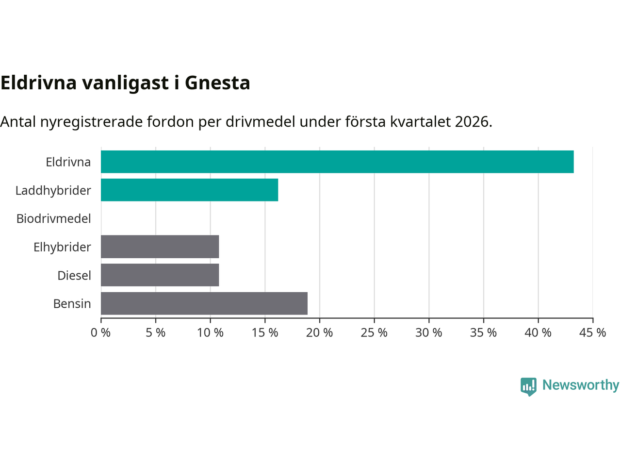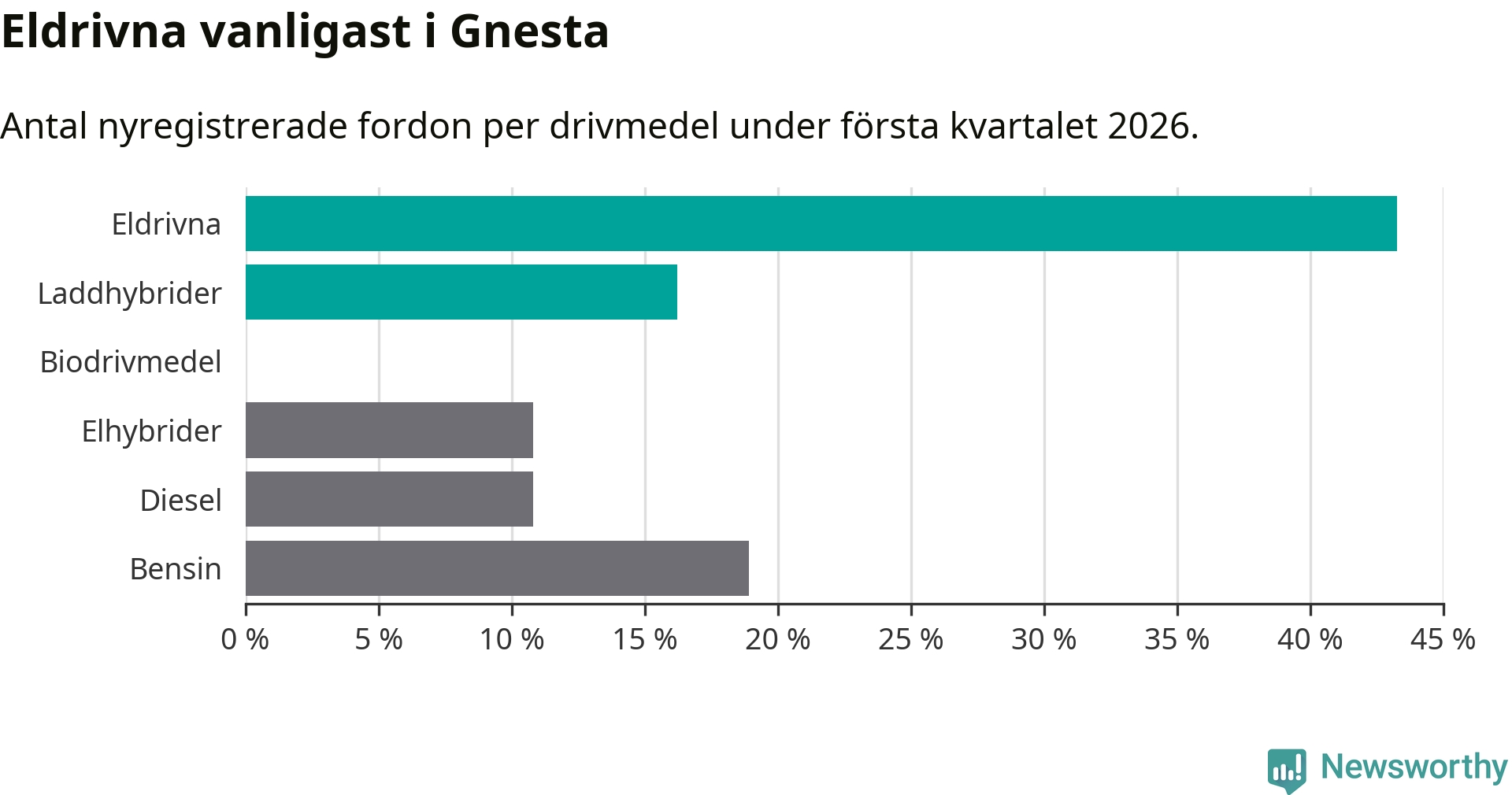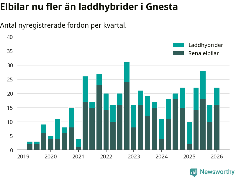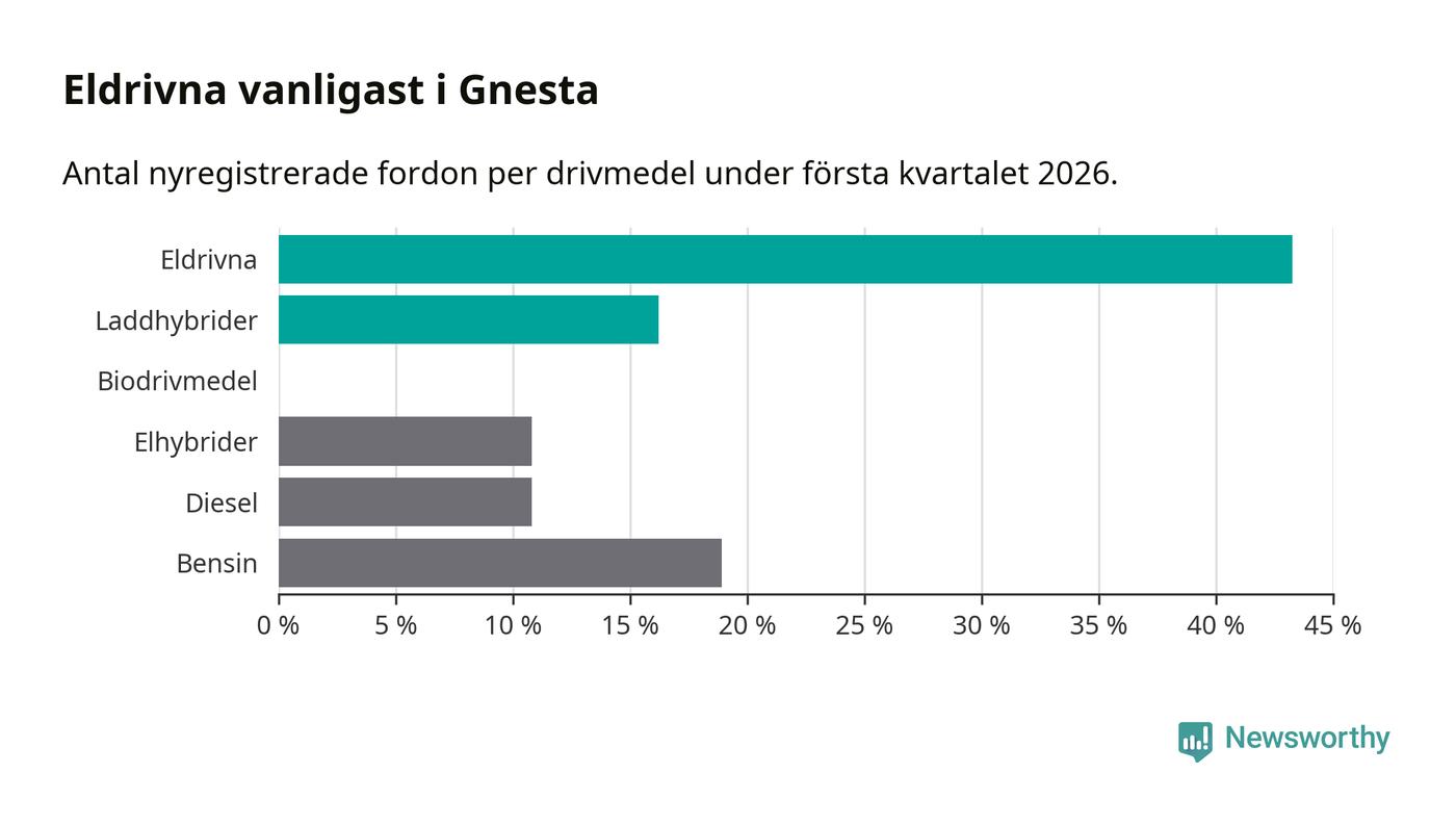 Under första kvartalet 2026 var 59 procent av alla nyregistrerade personbilar i Gnesta laddbara (sammanlagt registrerades 37 nya bilar). Merparten av de laddbara bilarna var rena elbilar (43 procent av alla).