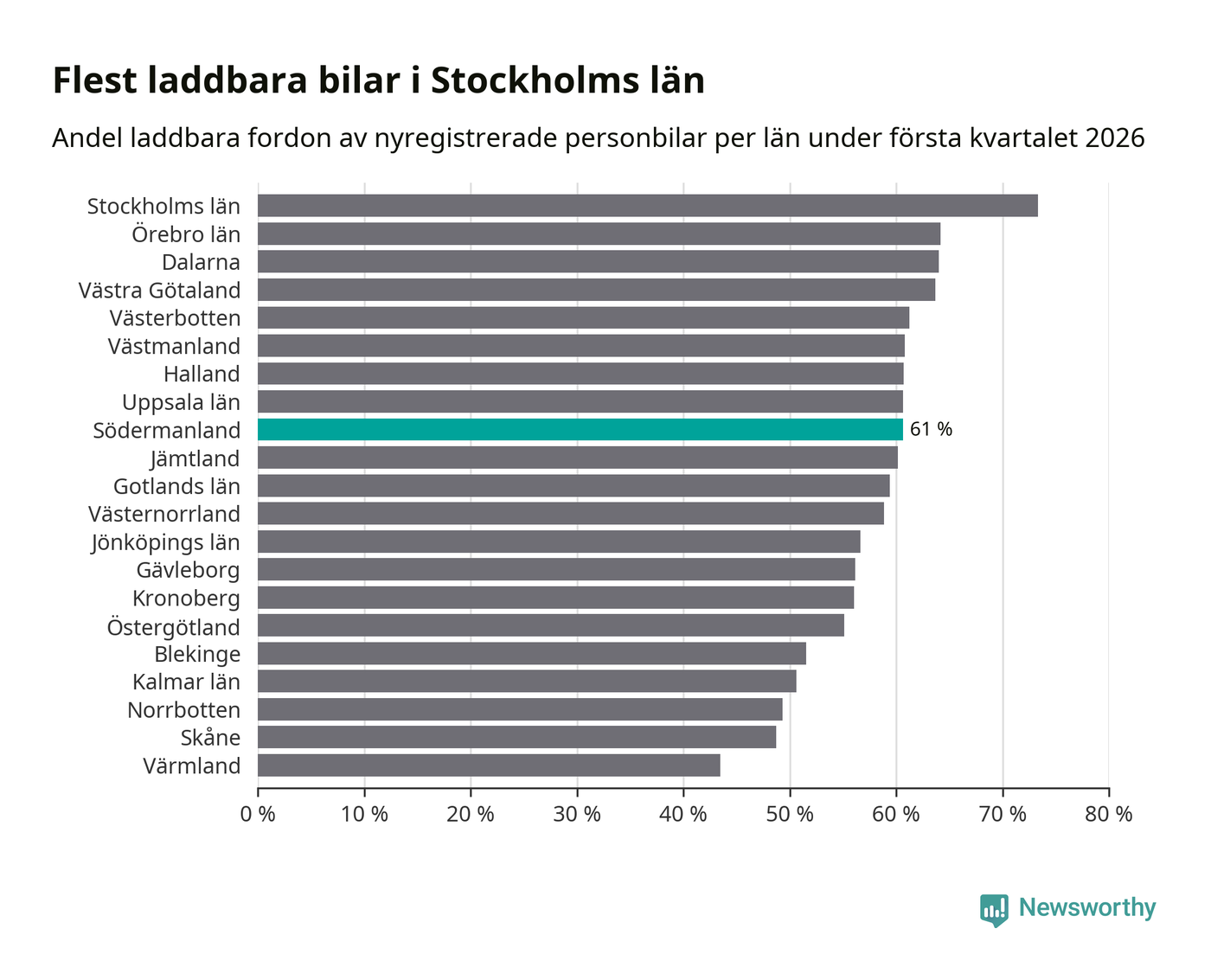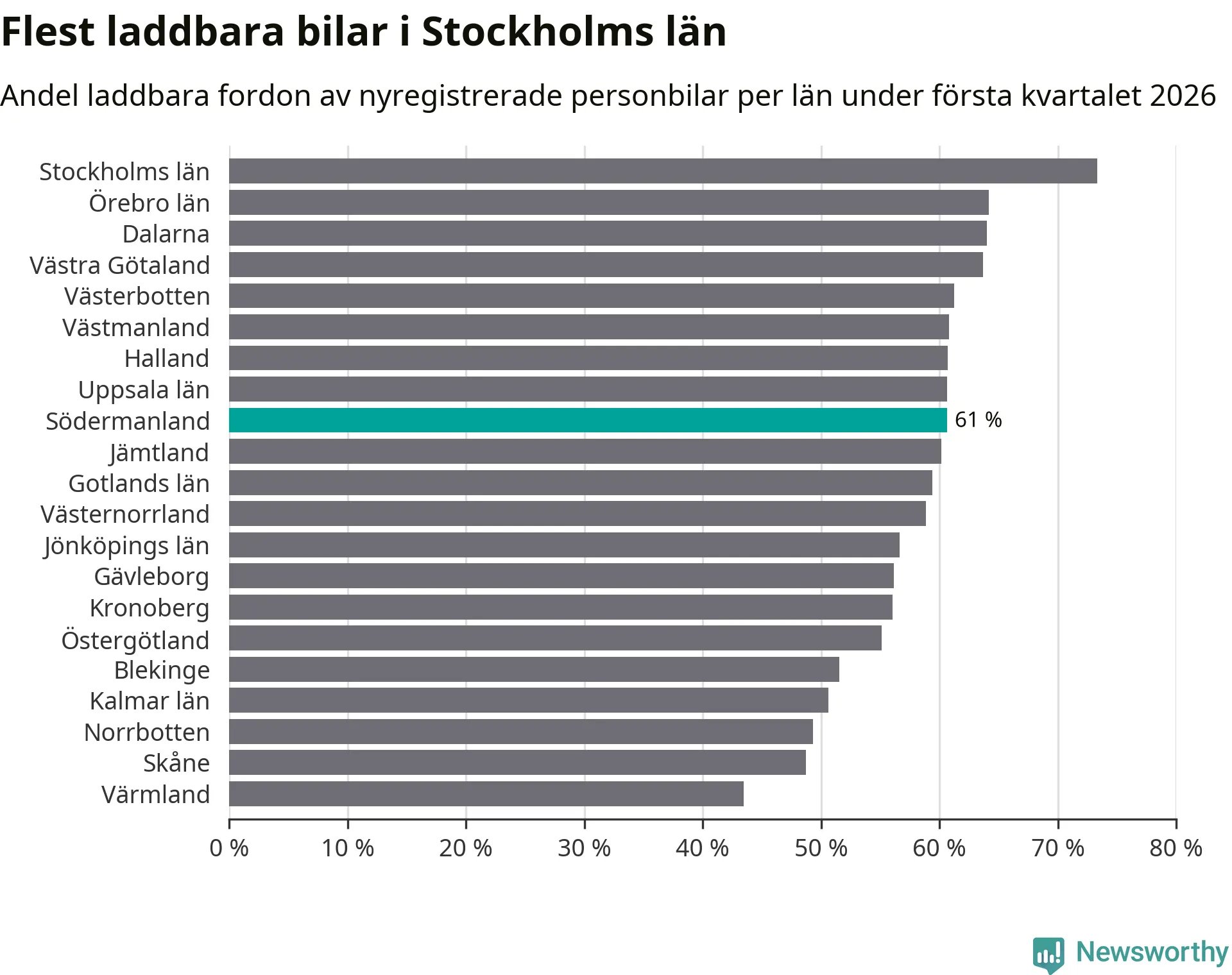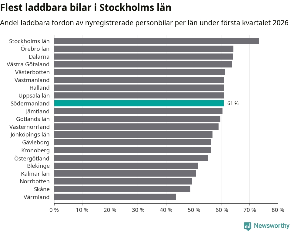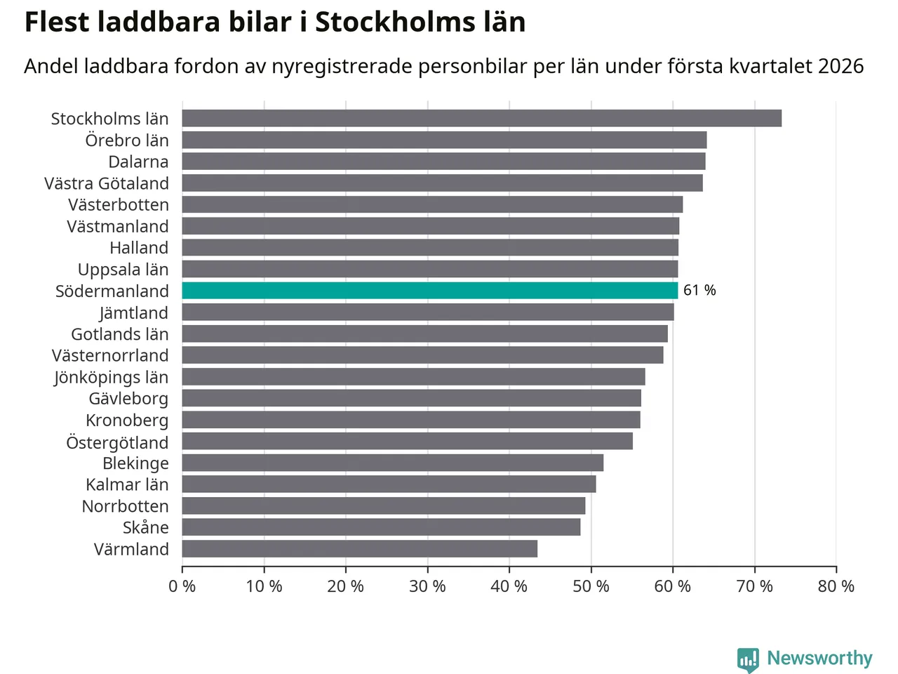 I hela landet var 63 procent av alla nya bilar laddbara under första kvartalet. Det är något färre än föregående kvartal (−1,4 procentenheter). I Södermanlands län var 61 procent av de nya bilarna laddbara, vilket är den högsta andelen hittills.