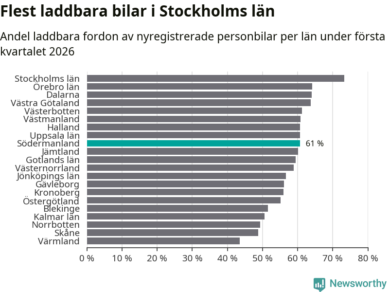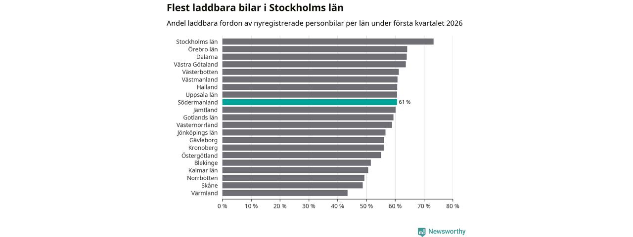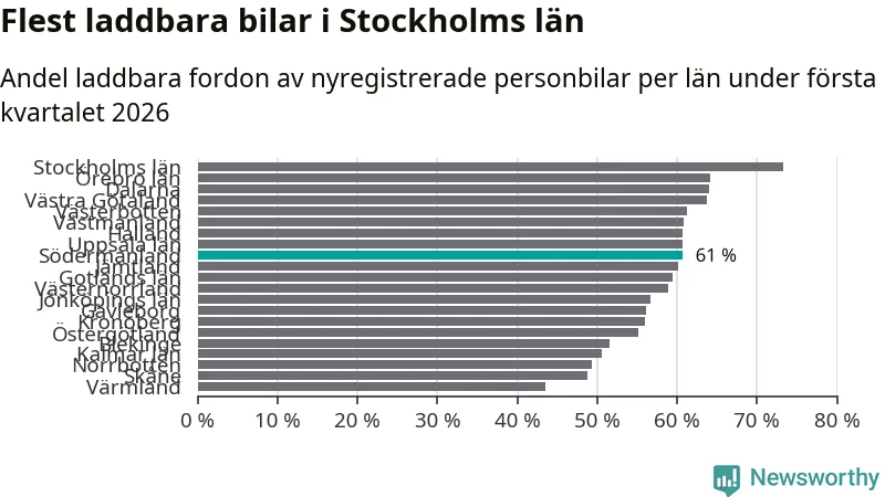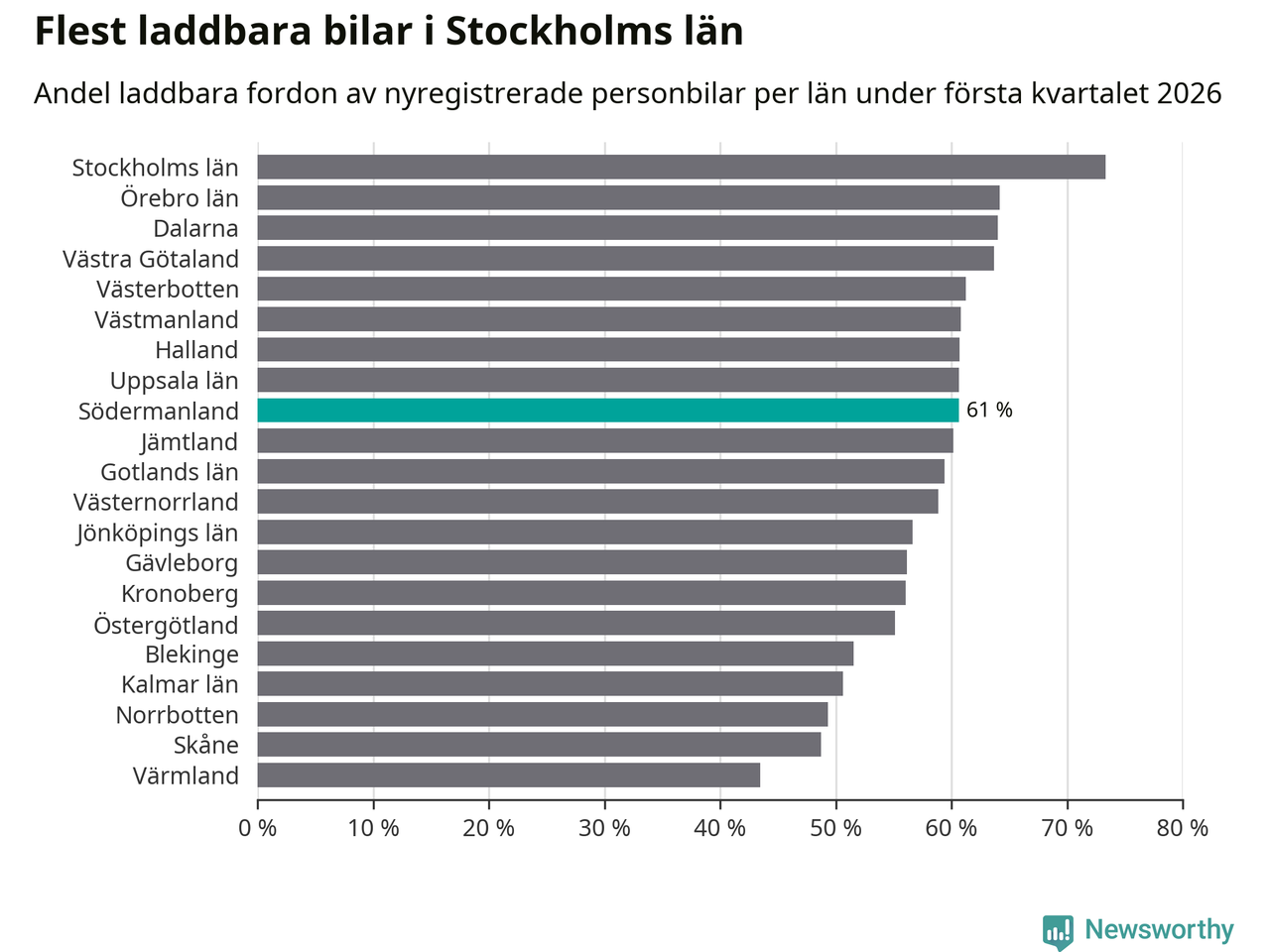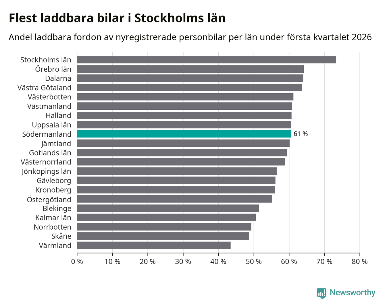 I hela landet var 63 procent av alla nya bilar laddbara under första kvartalet. Det är något färre än föregående kvartal (−1,4 procentenheter). I Södermanlands län var 61 procent av de nya bilarna laddbara, vilket är den högsta andelen hittills.