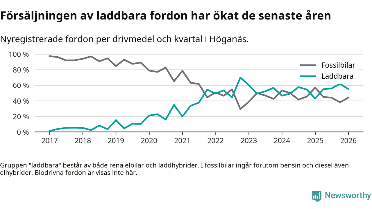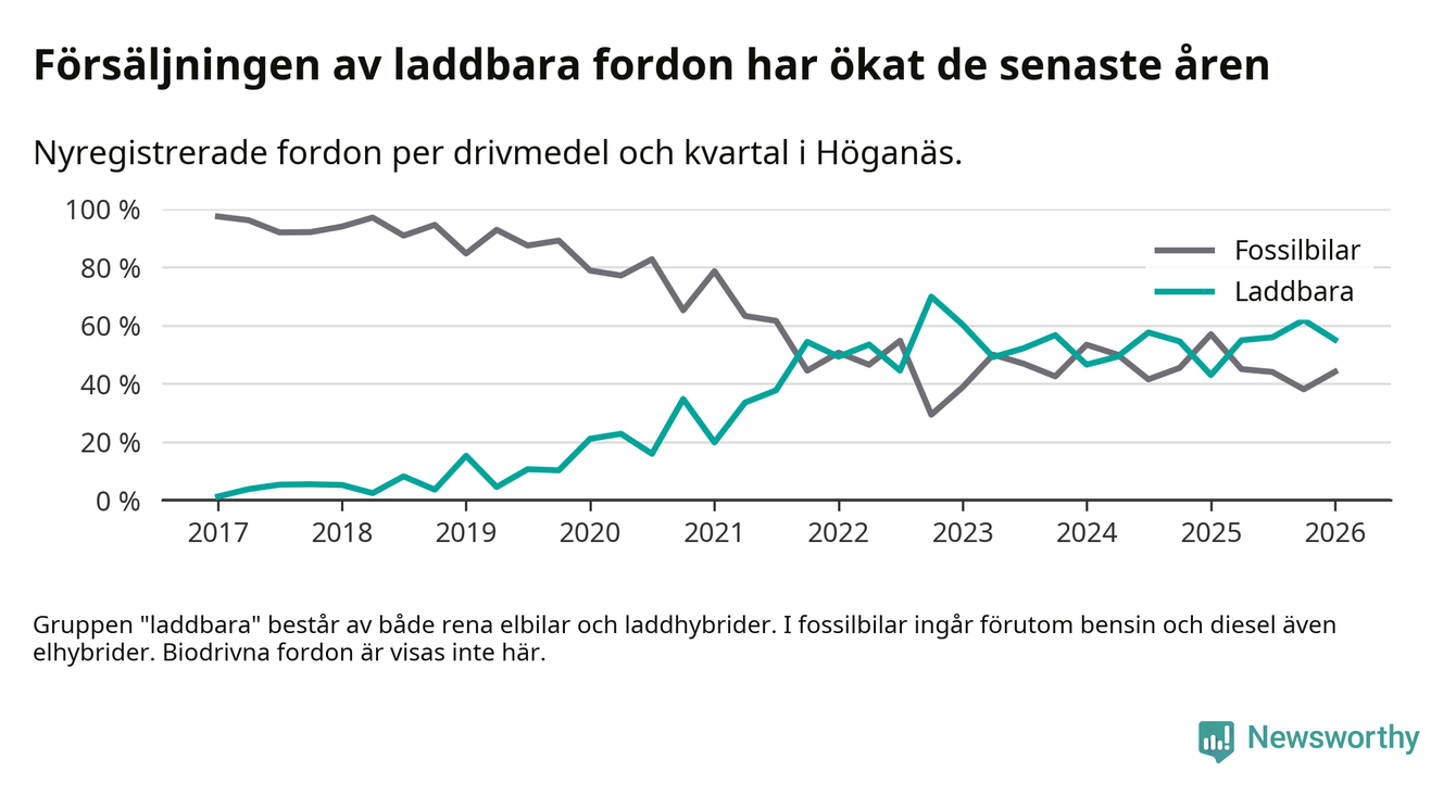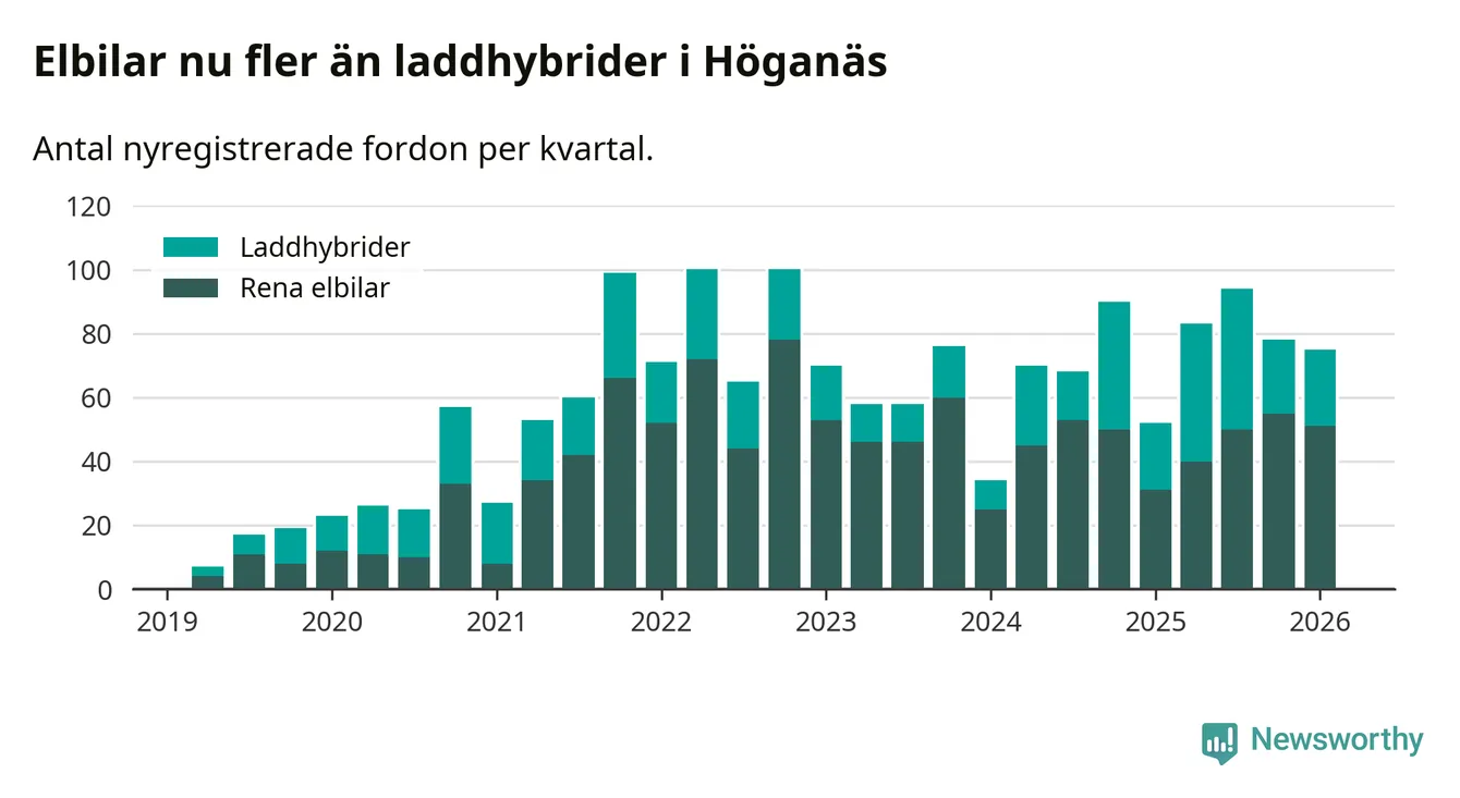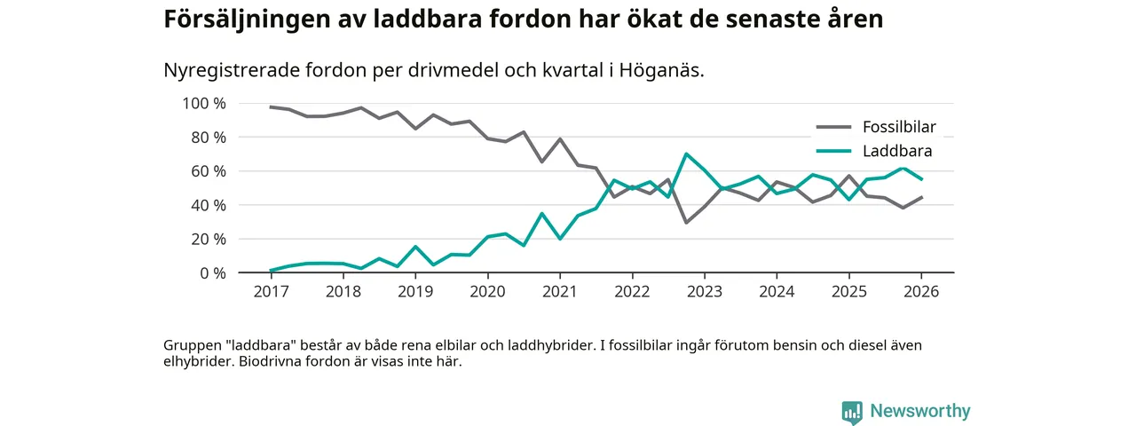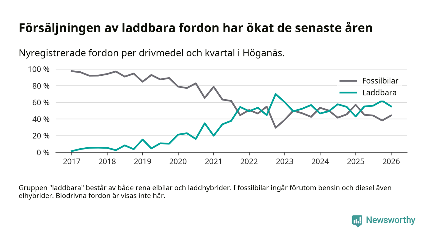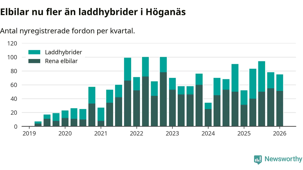 Under första kvartalet 2026 var 55 procent av alla nyregistrerade personbilar i Höganäs laddbara (sammanlagt registrerades 136 nya bilar). Merparten av de laddbara bilarna var rena elbilar (38 procent av alla).