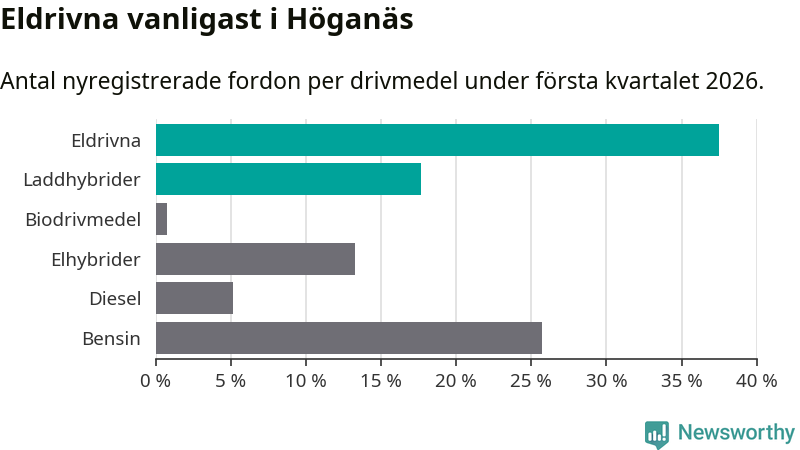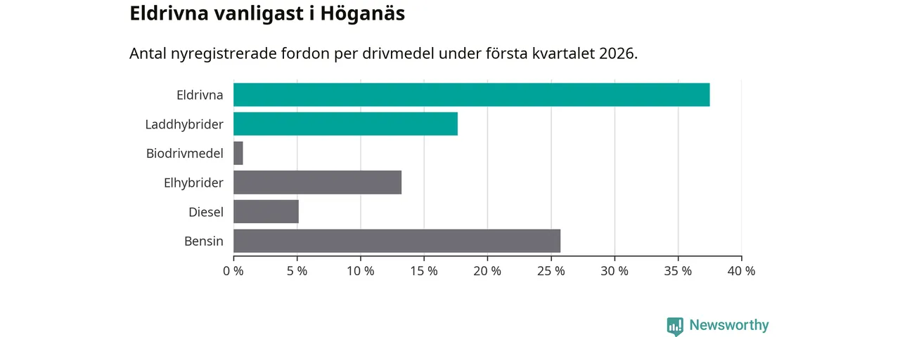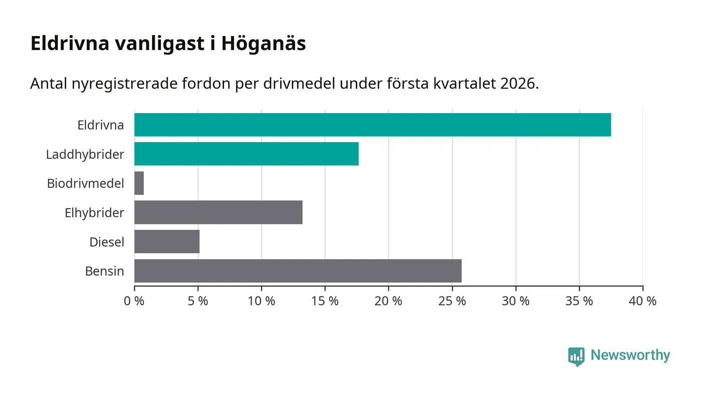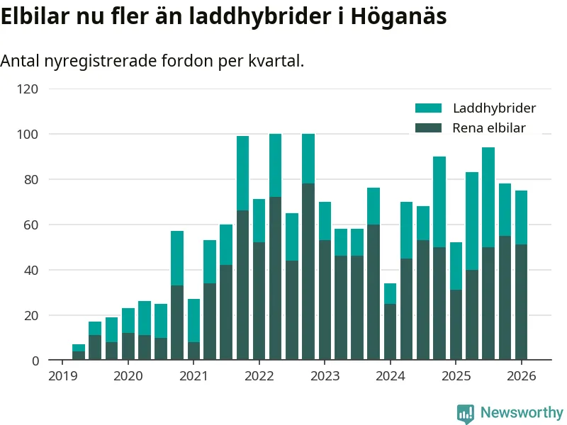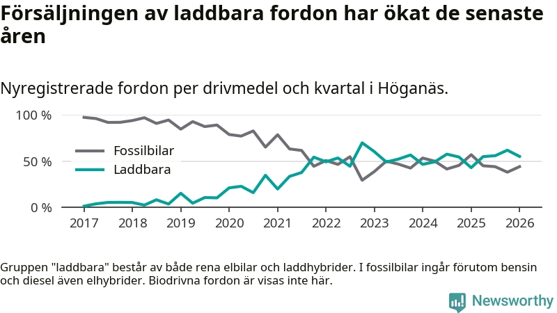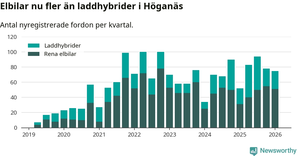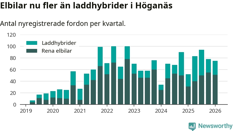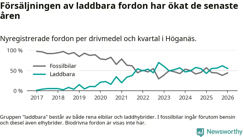 Under första kvartalet 2026 var 55 procent av alla nyregistrerade personbilar i Höganäs laddbara (sammanlagt registrerades 136 nya bilar). Merparten av de laddbara bilarna var rena elbilar (38 procent av alla).