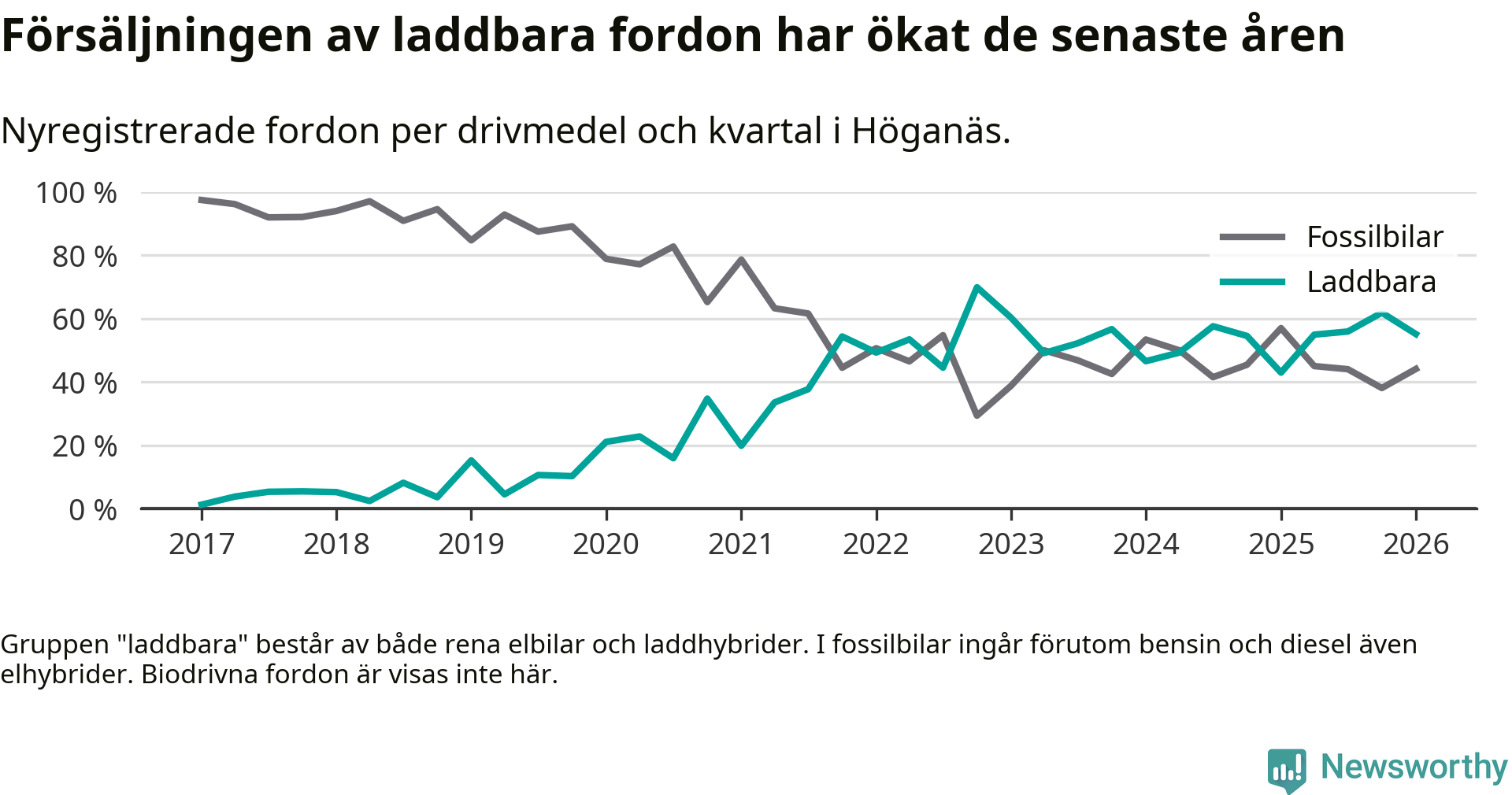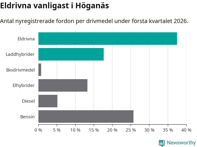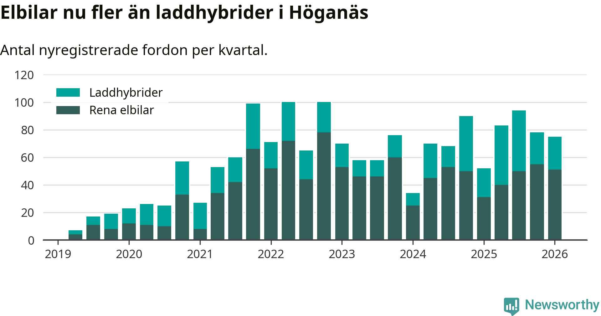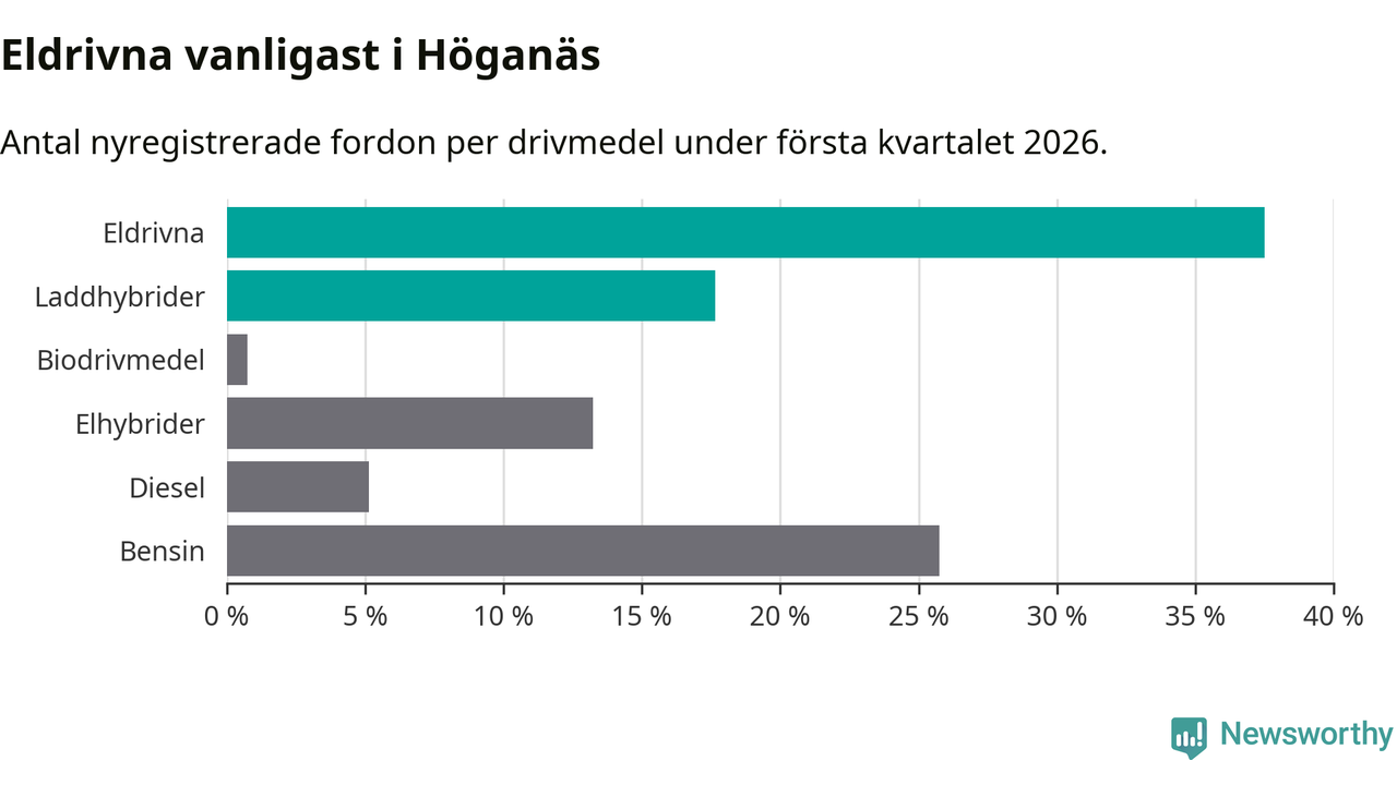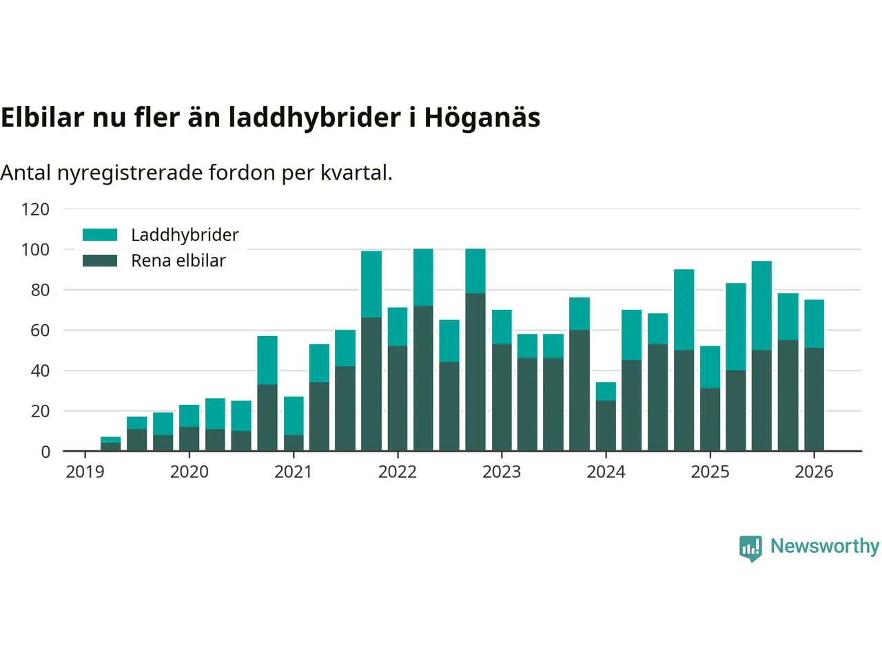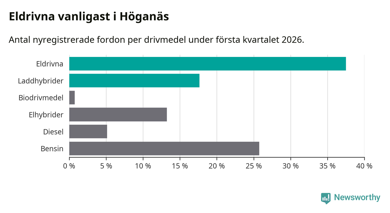 Under första kvartalet 2026 var 55 procent av alla nyregistrerade personbilar i Höganäs laddbara (sammanlagt registrerades 136 nya bilar). Merparten av de laddbara bilarna var rena elbilar (38 procent av alla).