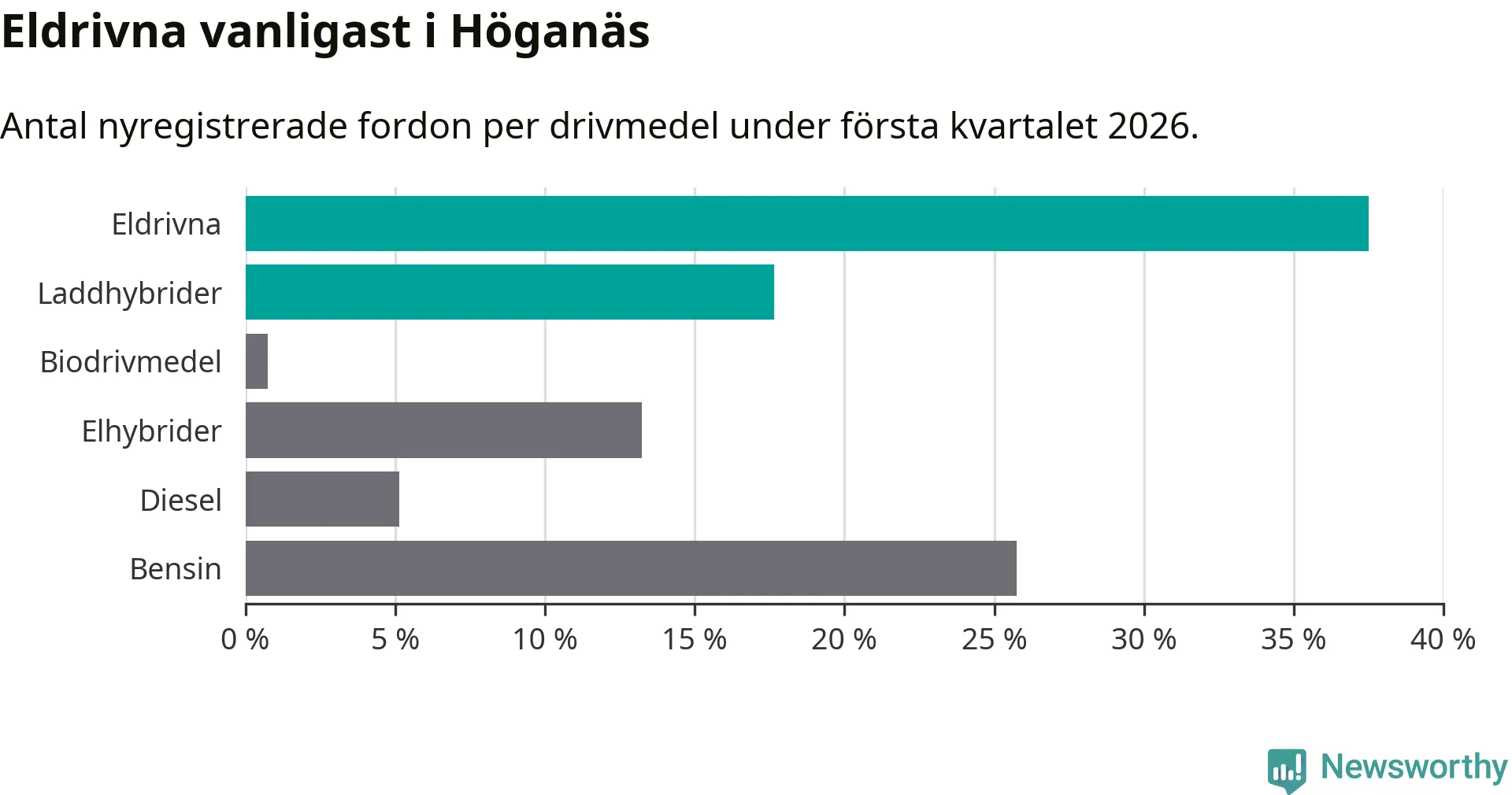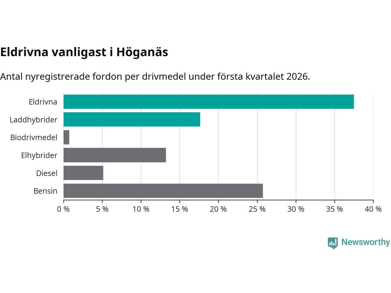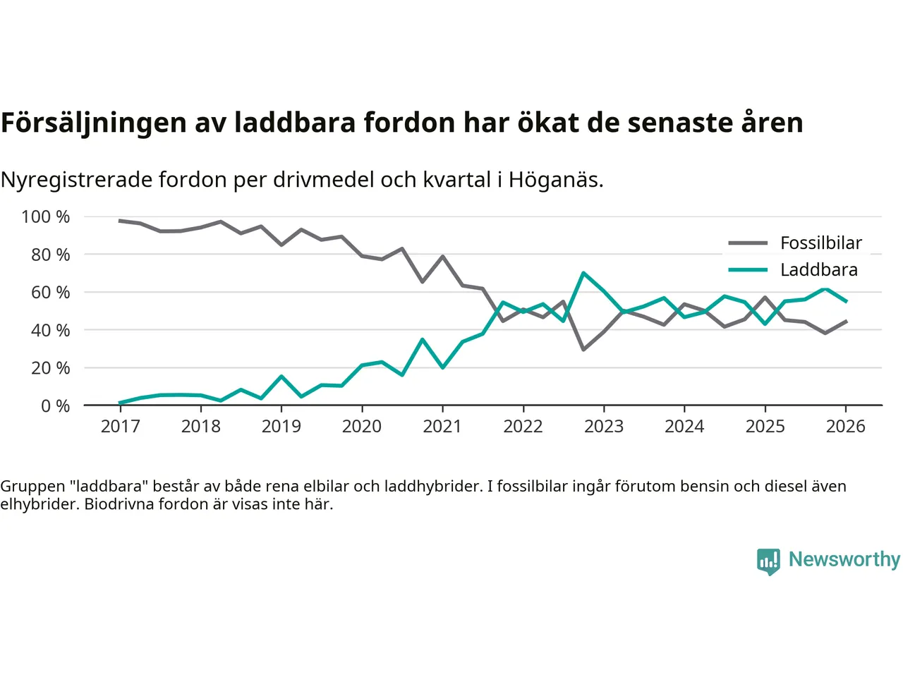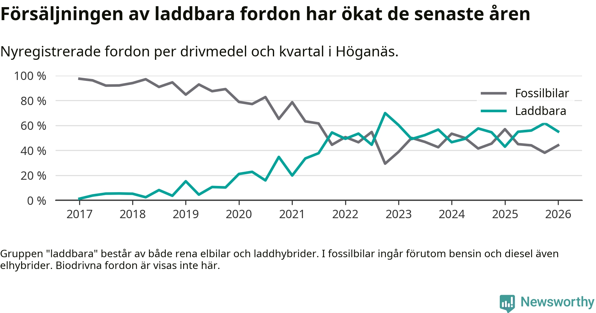 Under första kvartalet 2026 var 55 procent av alla nyregistrerade personbilar i Höganäs laddbara (sammanlagt registrerades 136 nya bilar). Merparten av de laddbara bilarna var rena elbilar (38 procent av alla).