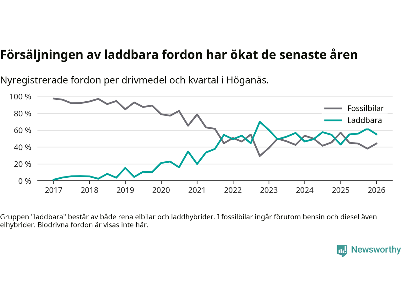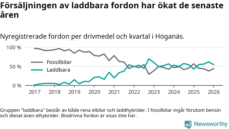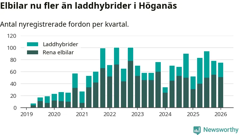I Höganäs minskade andelen laddbara bilar under första kvartalet jämfört med kvartalet innan (−6,8 procentenheter). Nyregistreringen peakade under fjärde kvartalet 2022 då 70 procent av de nya bilarna var laddbara.