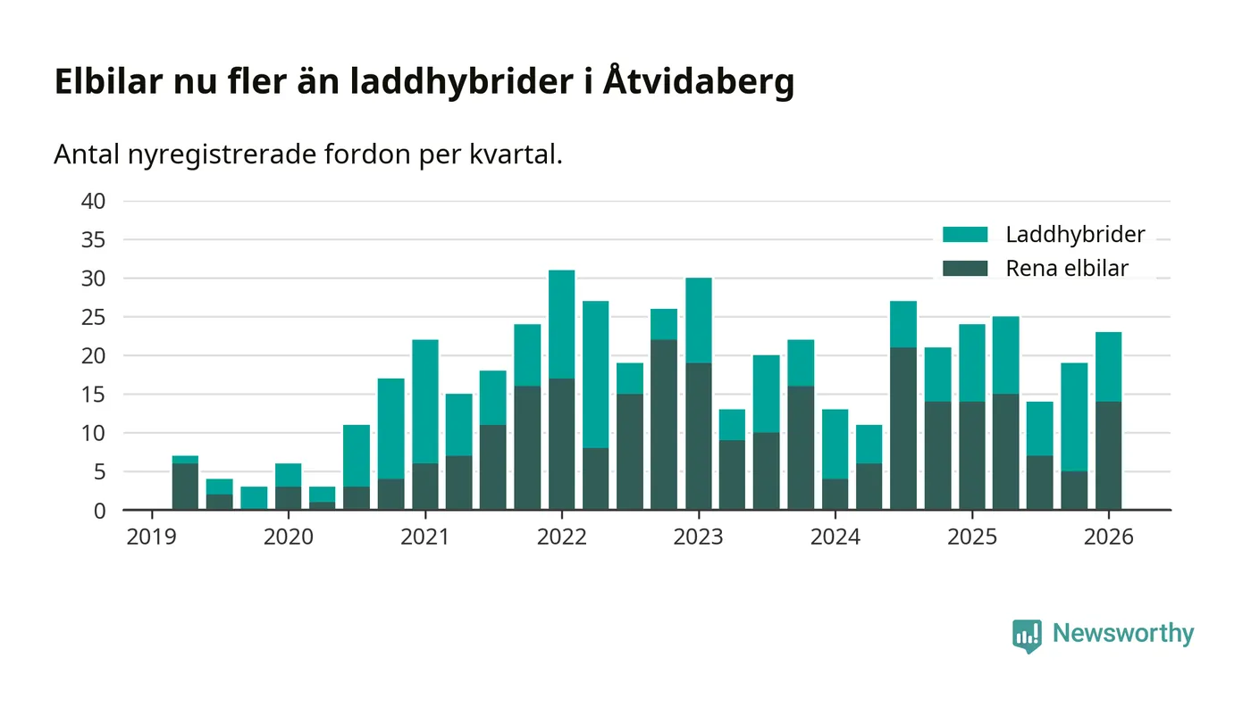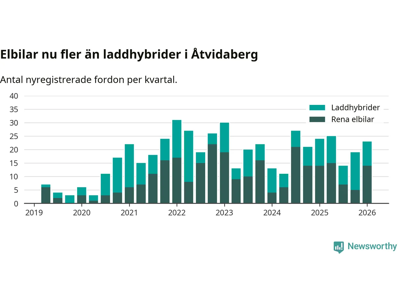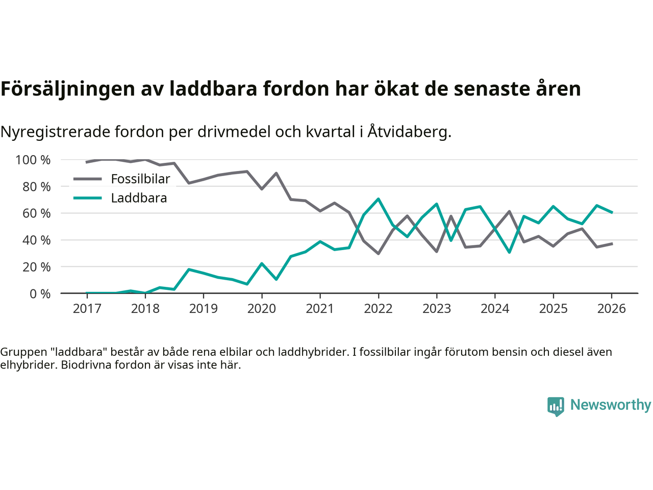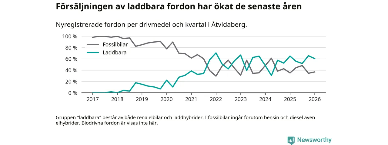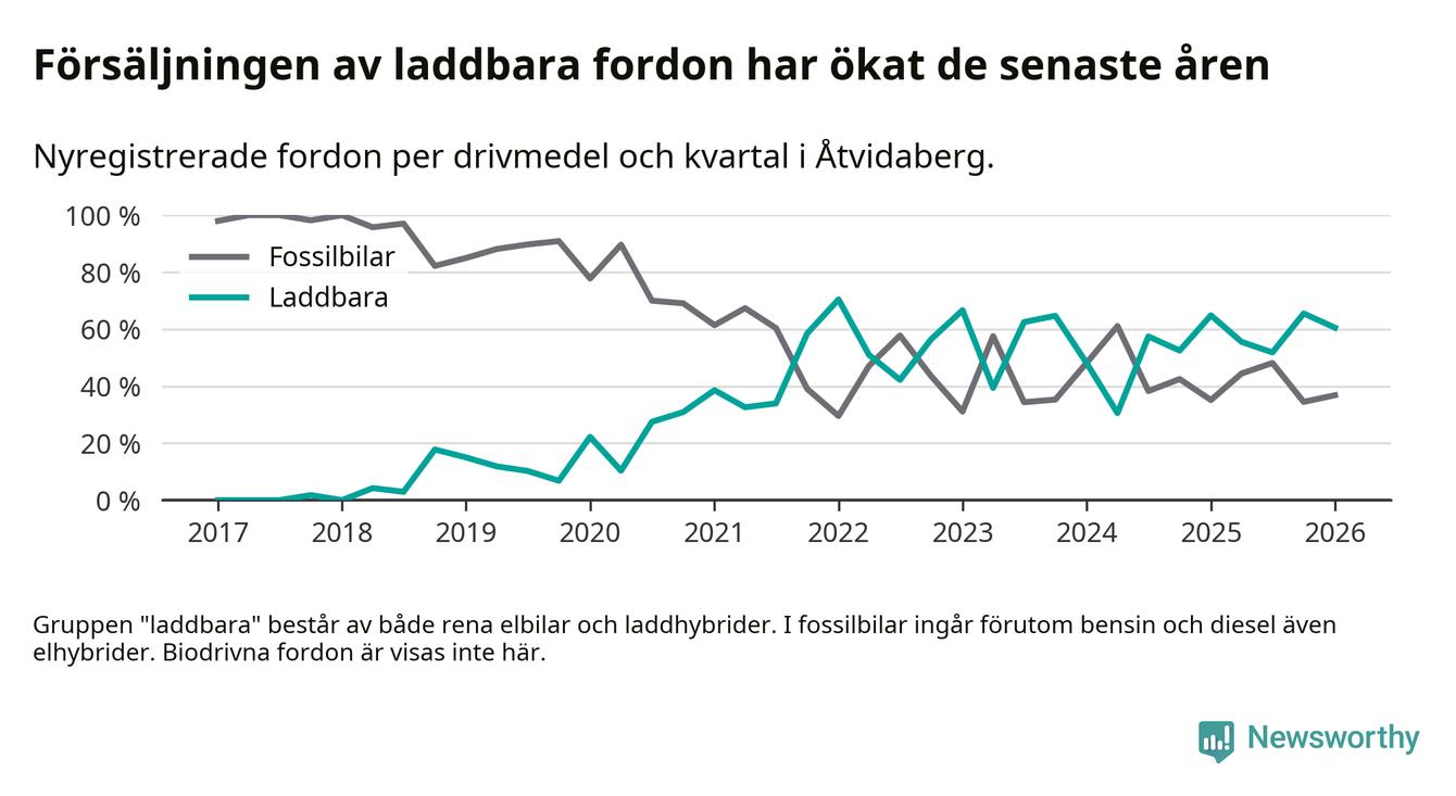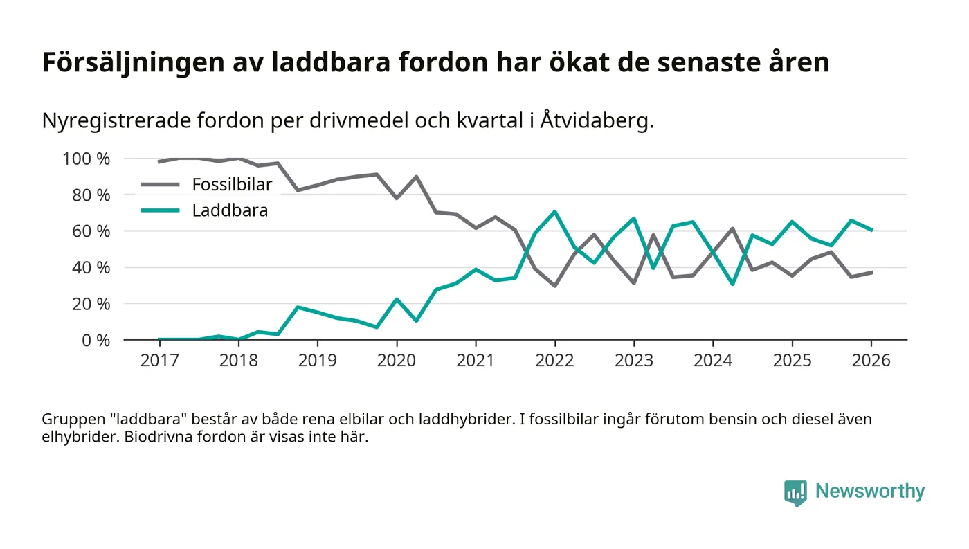 Under första kvartalet 2026 var 61 procent av alla nyregistrerade personbilar i Åtvidaberg laddbara (sammanlagt registrerades 38 nya bilar). Merparten av de laddbara bilarna var rena elbilar (37 procent av alla).