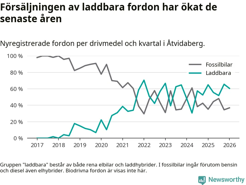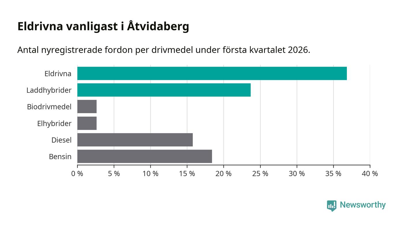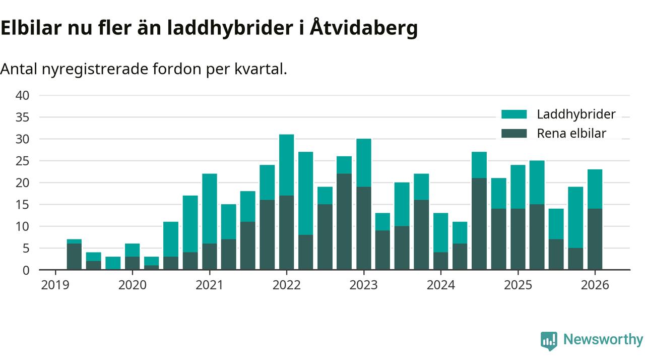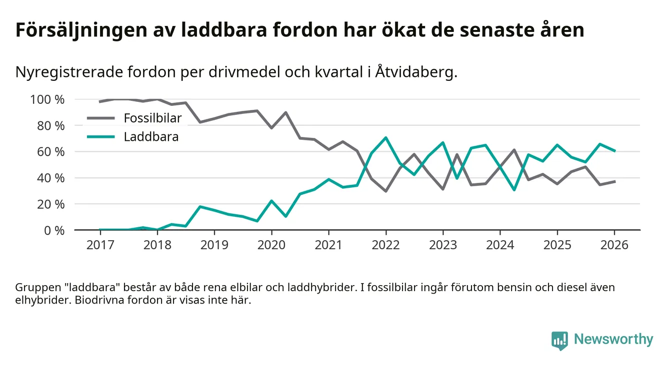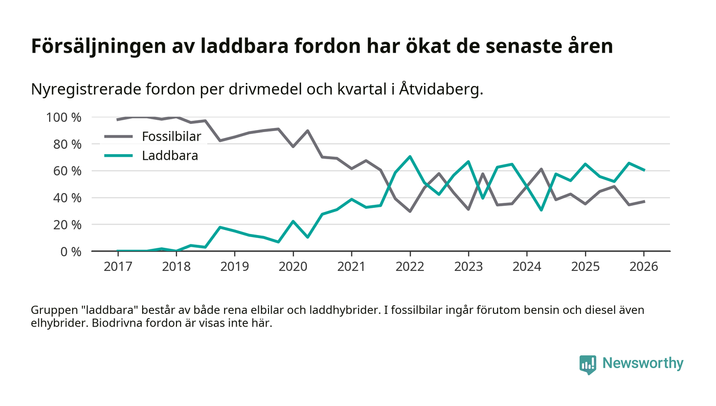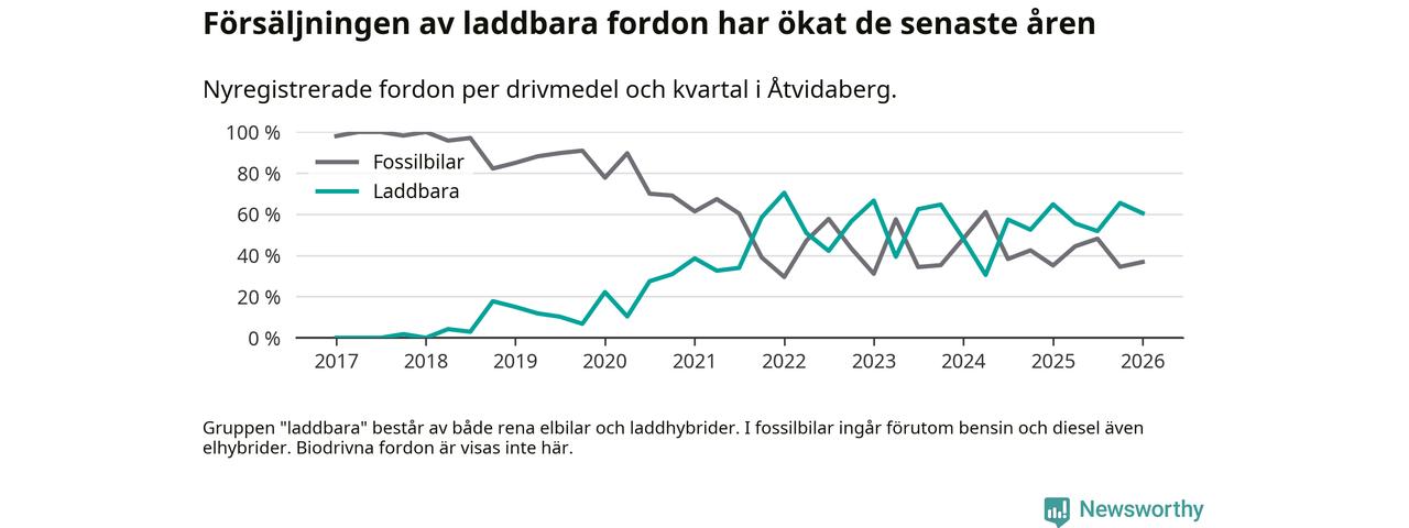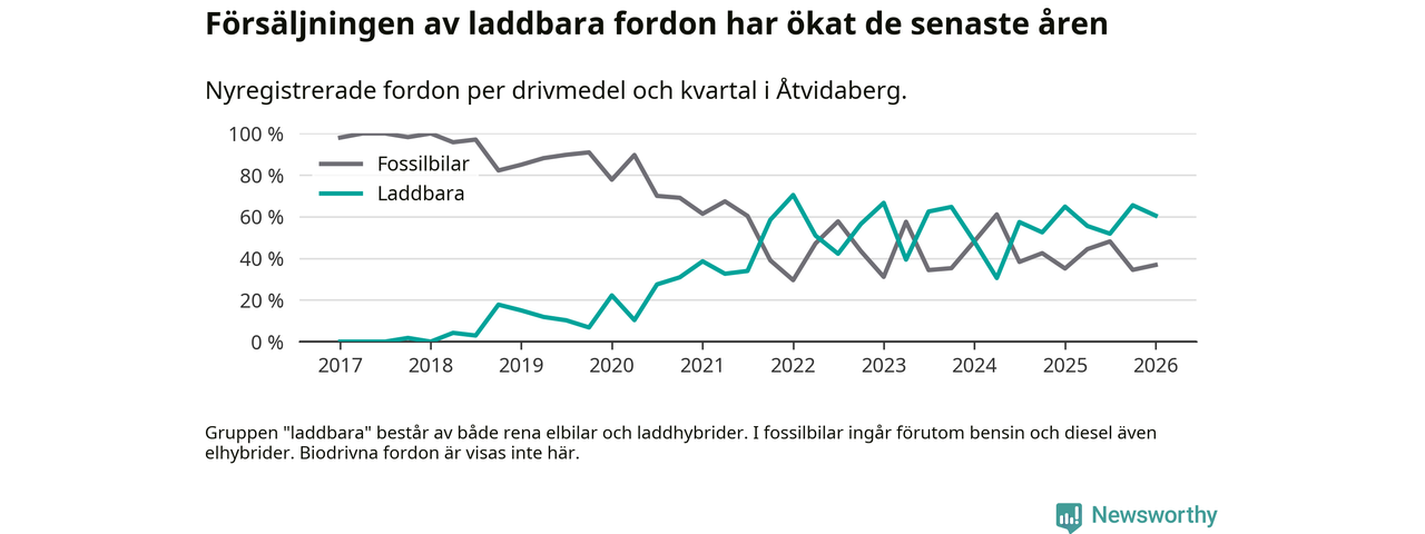 Under första kvartalet 2026 var 61 procent av alla nyregistrerade personbilar i Åtvidaberg laddbara (sammanlagt registrerades 38 nya bilar). Merparten av de laddbara bilarna var rena elbilar (37 procent av alla).