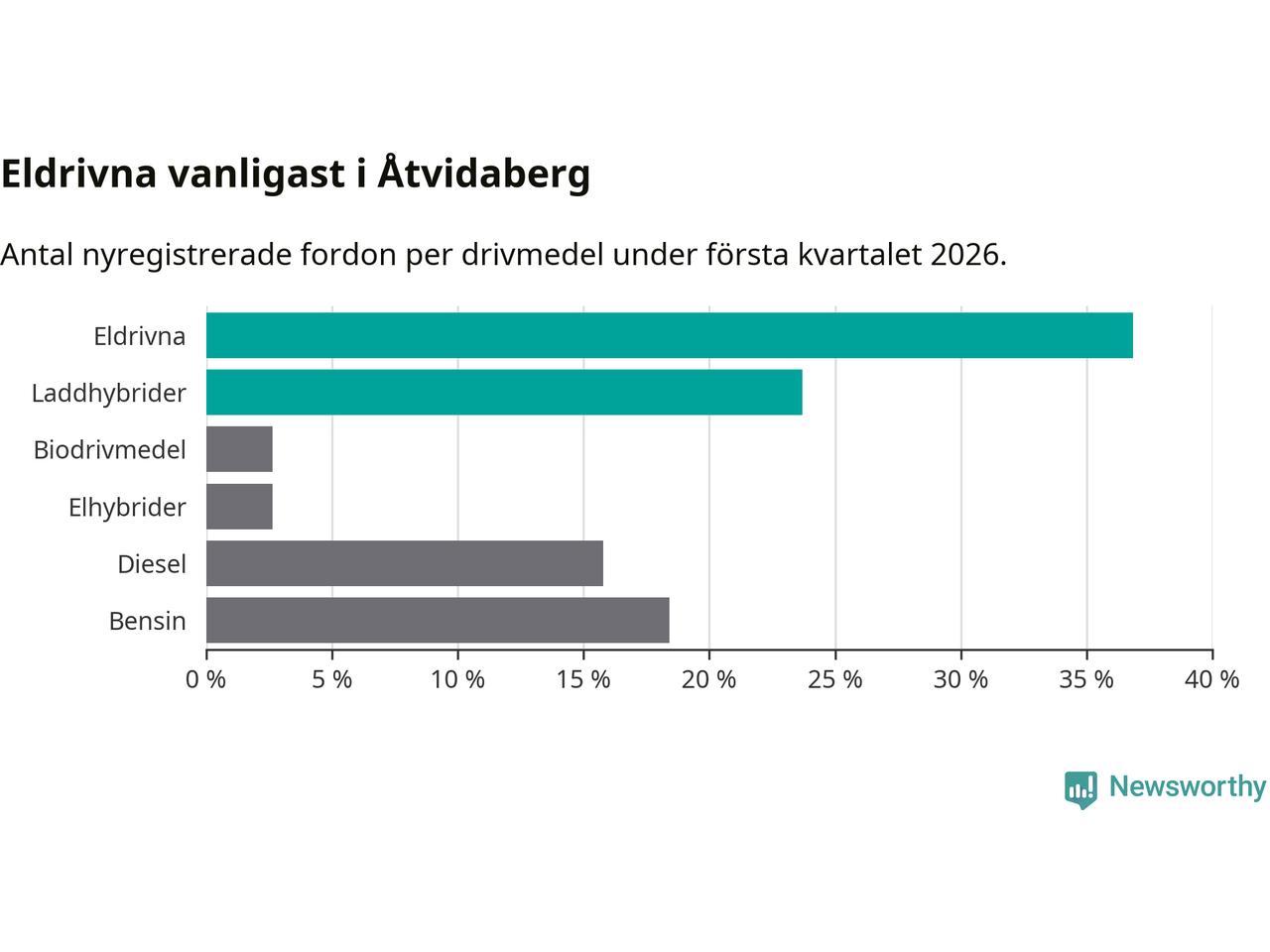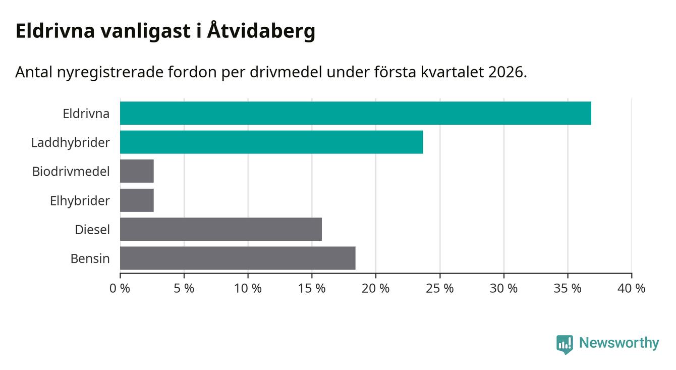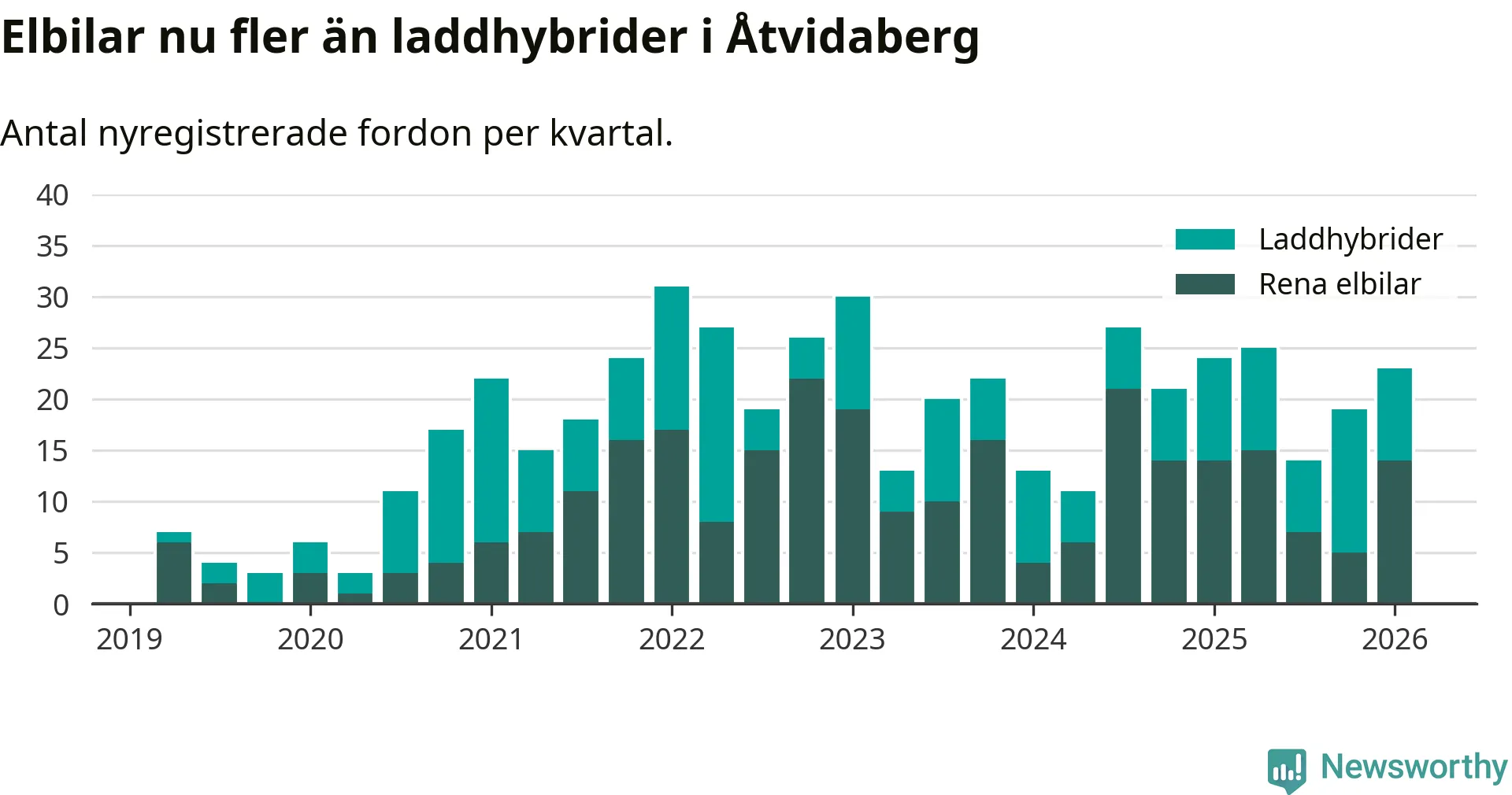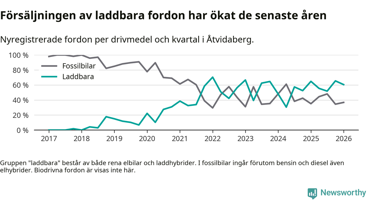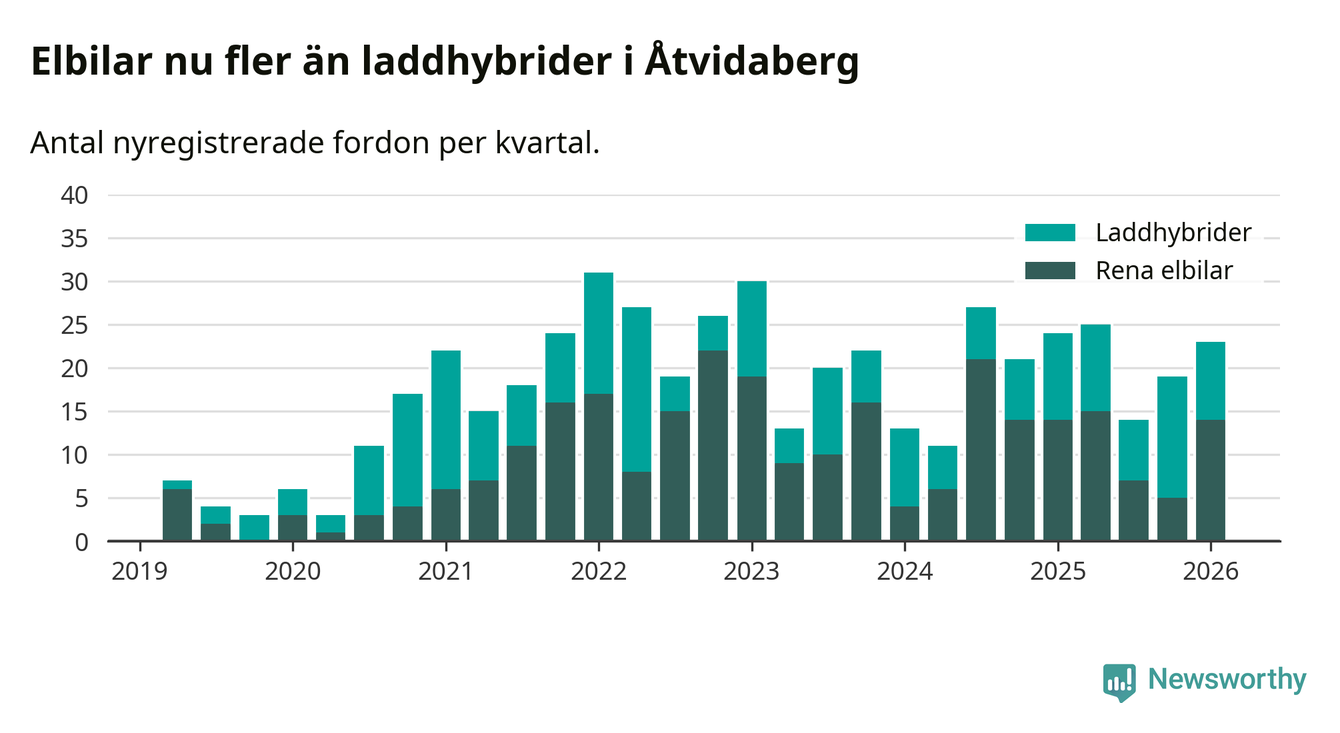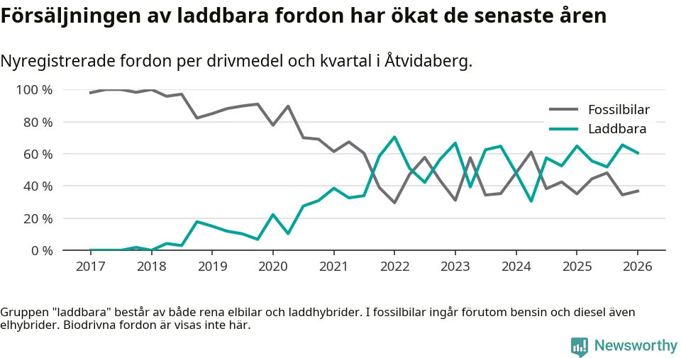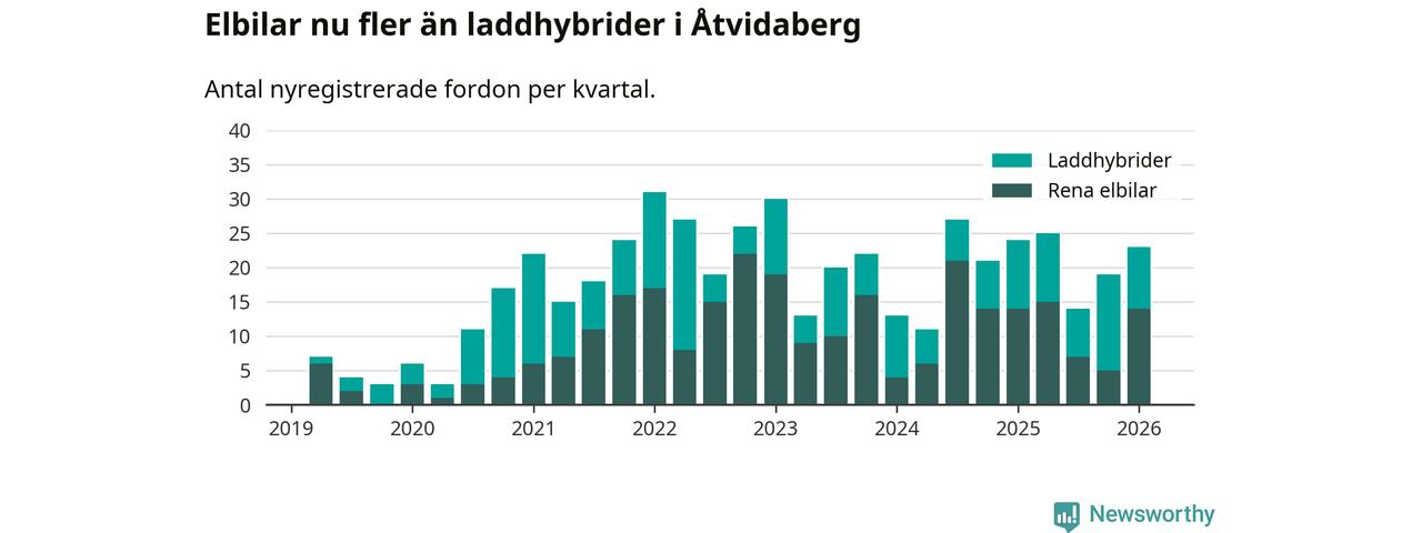 Under första kvartalet 2026 var 61 procent av alla nyregistrerade personbilar i Åtvidaberg laddbara (sammanlagt registrerades 38 nya bilar). Merparten av de laddbara bilarna var rena elbilar (37 procent av alla).