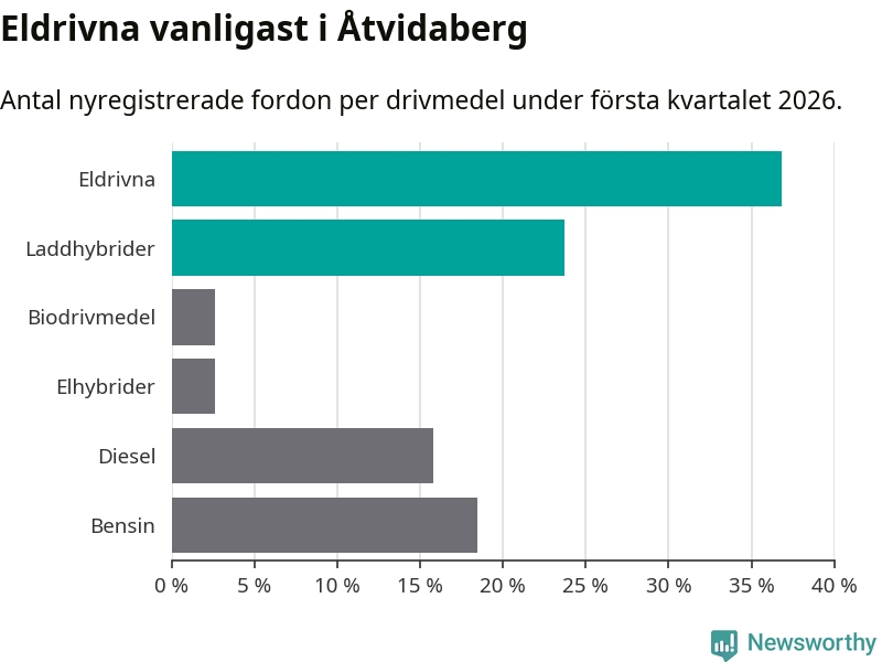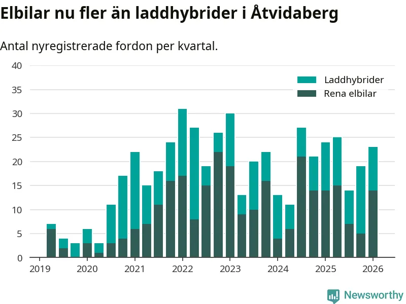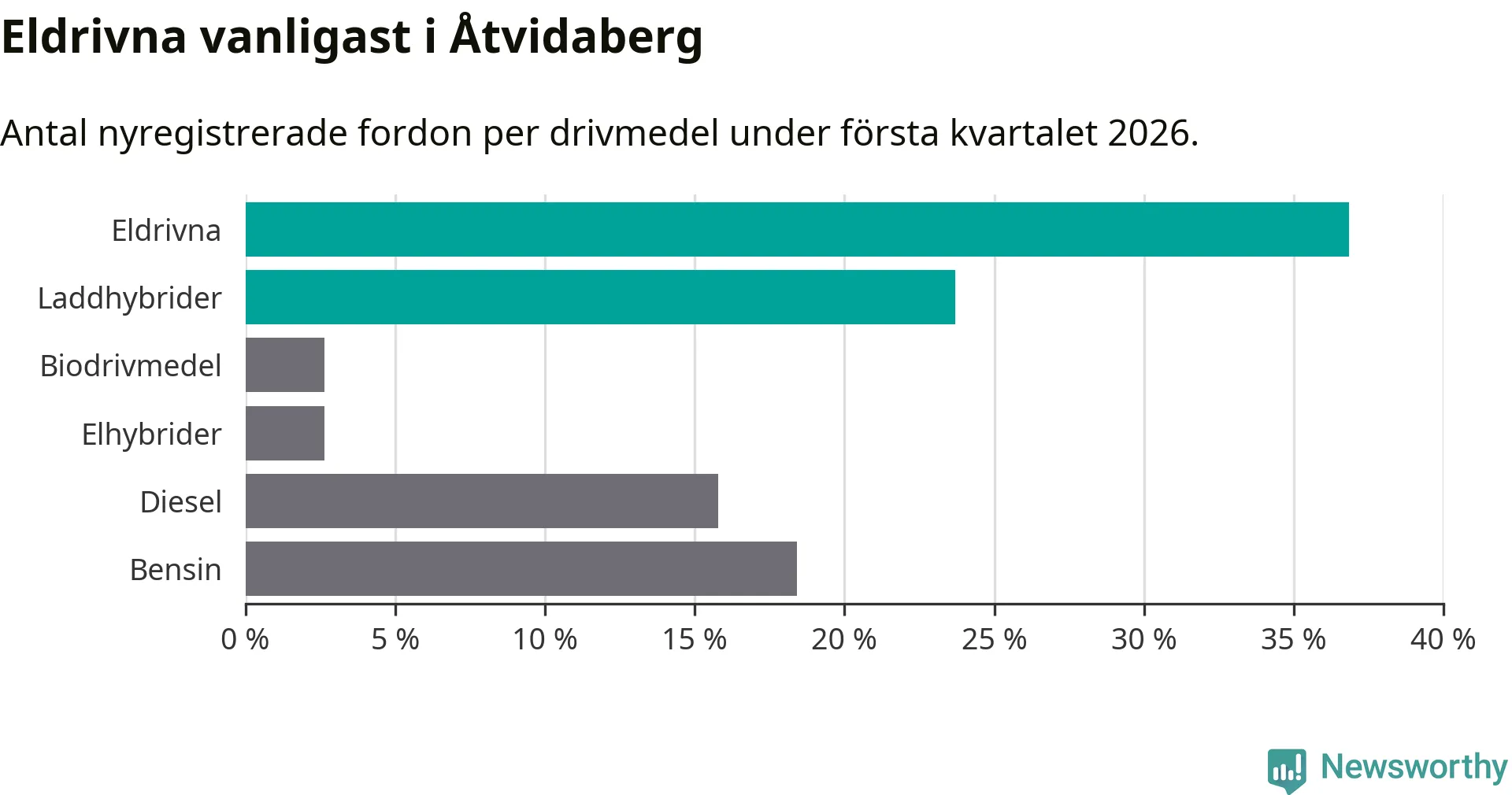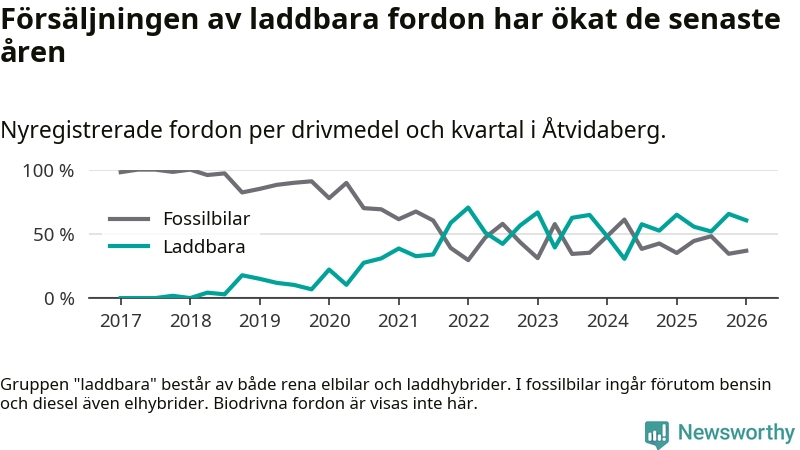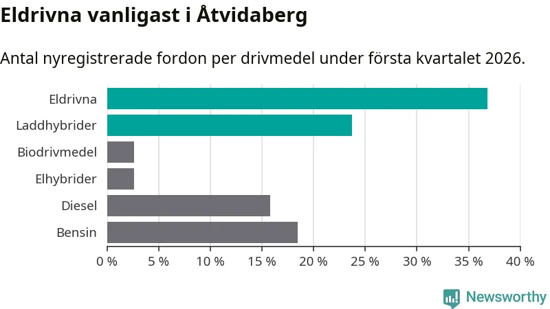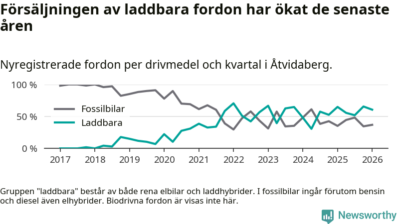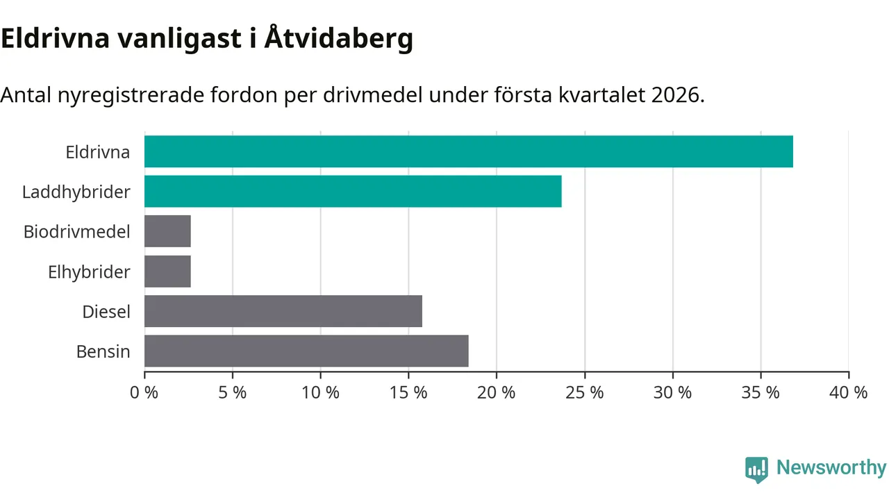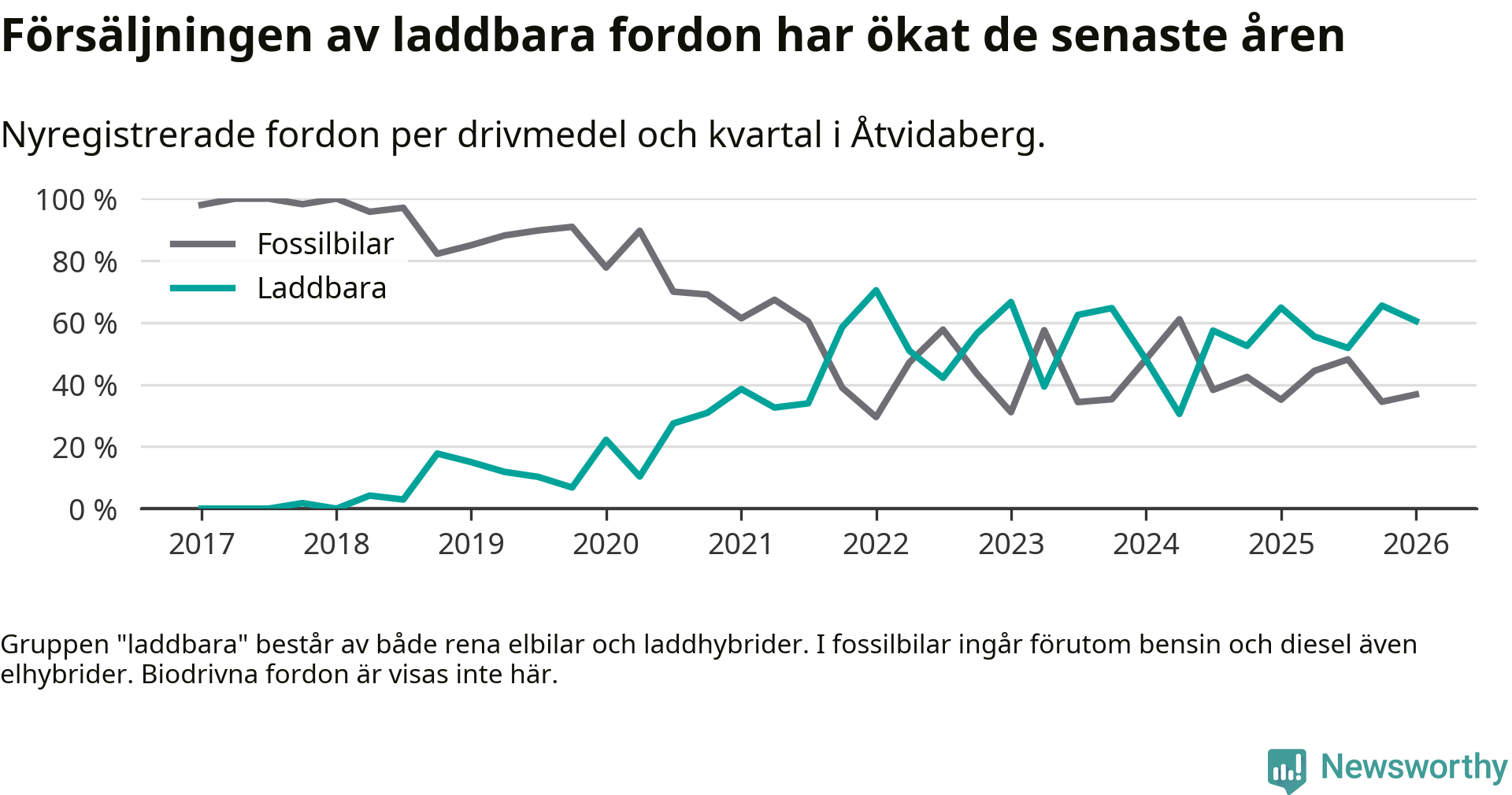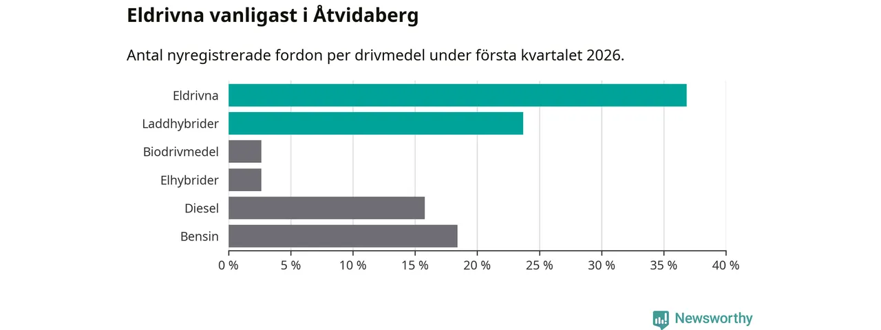 Under första kvartalet 2026 var 61 procent av alla nyregistrerade personbilar i Åtvidaberg laddbara (sammanlagt registrerades 38 nya bilar). Merparten av de laddbara bilarna var rena elbilar (37 procent av alla).