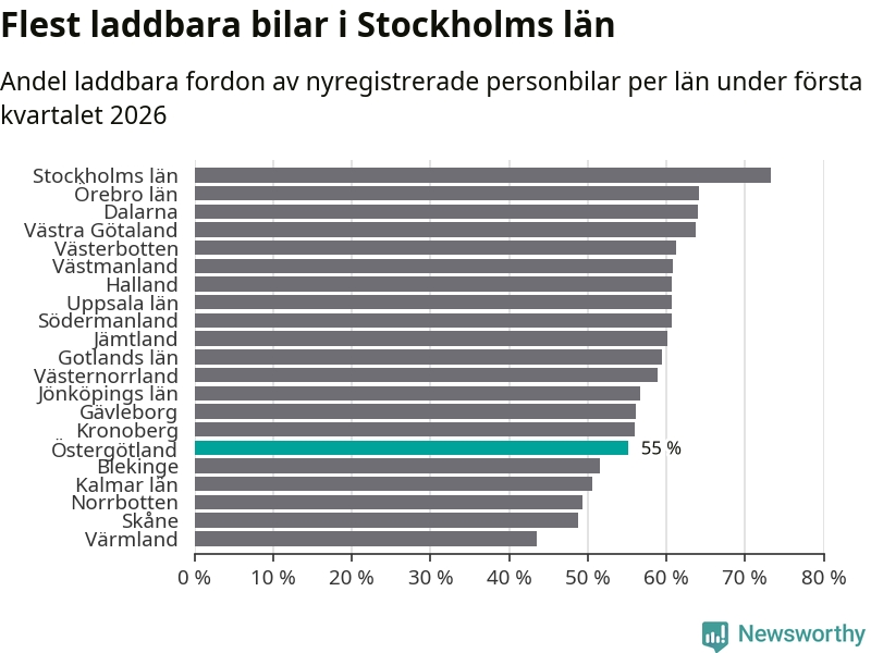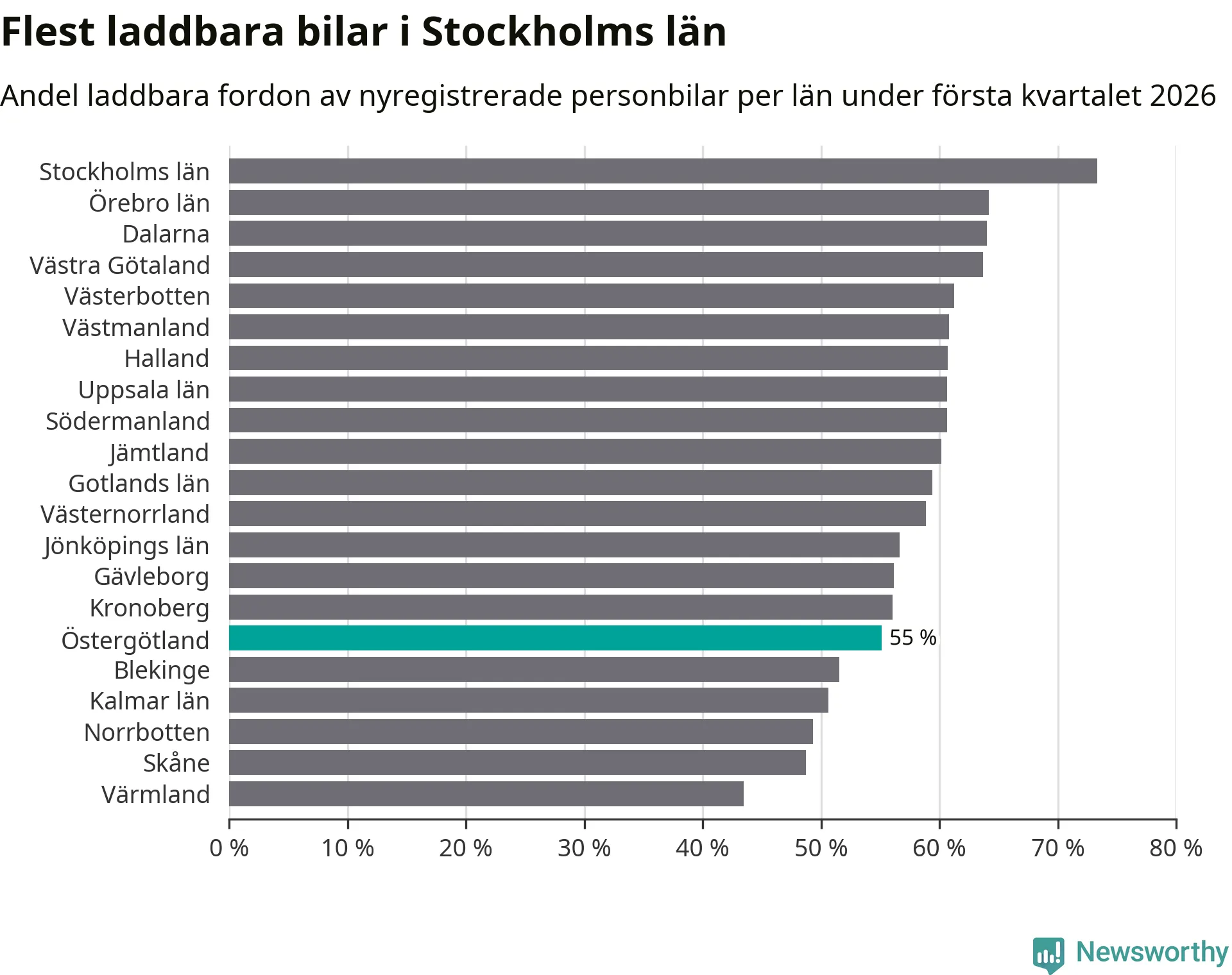 I hela landet var 63 procent av alla nya bilar laddbara under första kvartalet. Det är något färre än föregående kvartal (−1,4 procentenheter). I Östergötlands län var 55 procent av de nya bilarna laddbara, vilket är färre än föregående kvartal (−1,4 procentenheter).