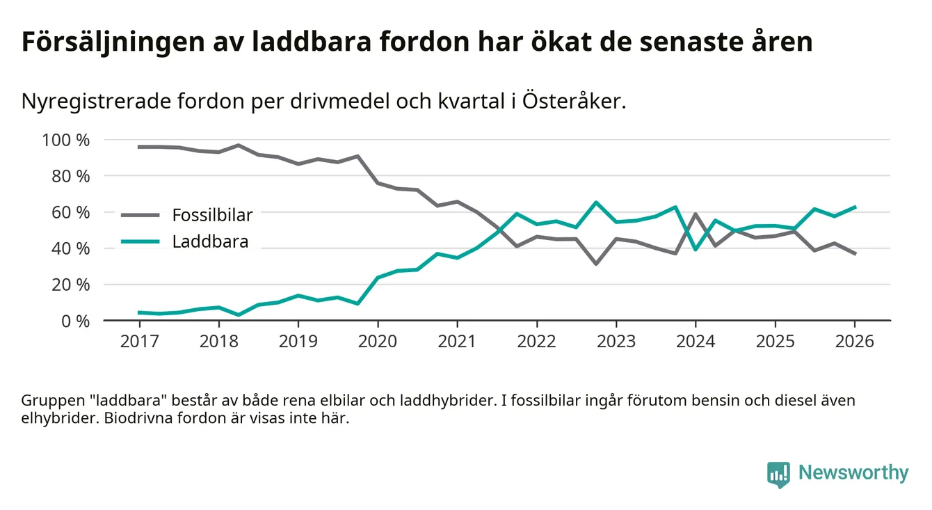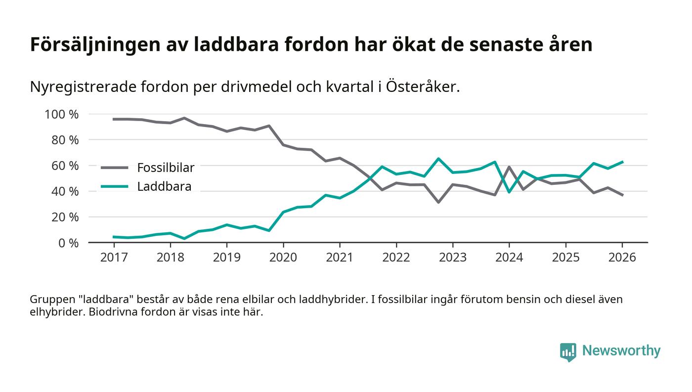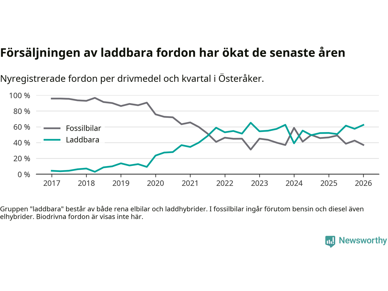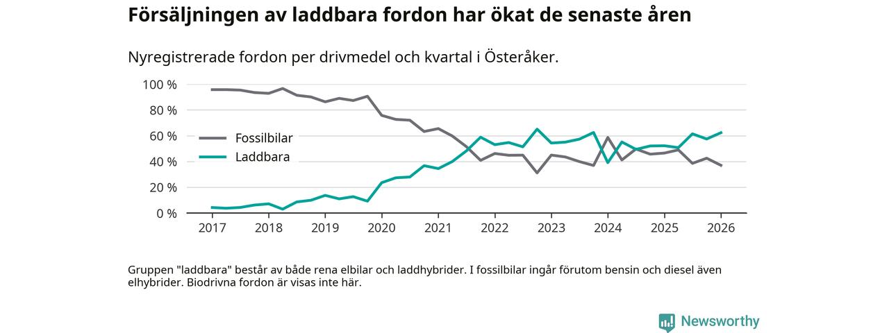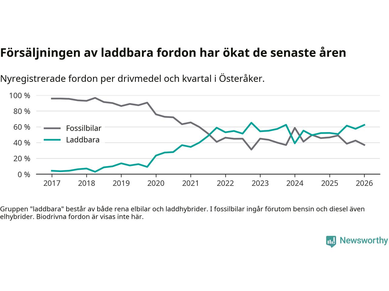 Under första kvartalet 2026 var 62 procent av alla nyregistrerade personbilar i Österåker laddbara (sammanlagt registrerades 324 nya bilar). Merparten av de laddbara bilarna var rena elbilar (37 procent av alla).