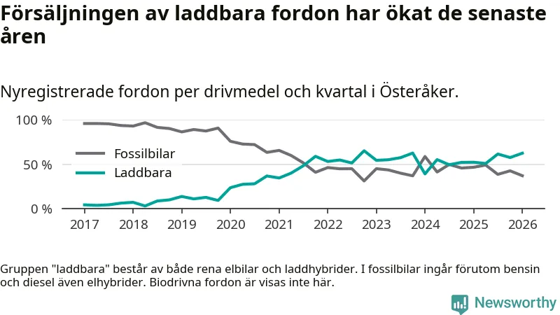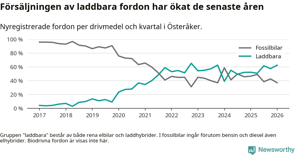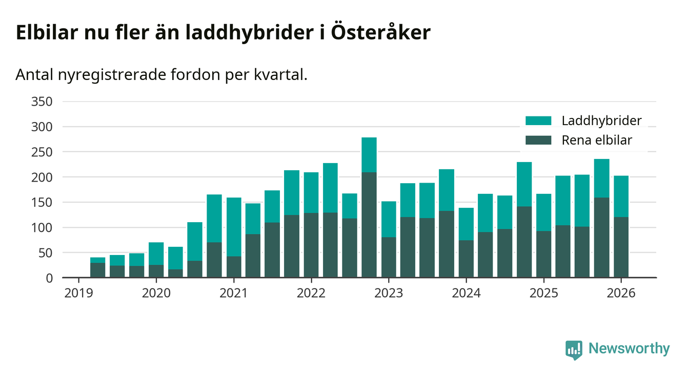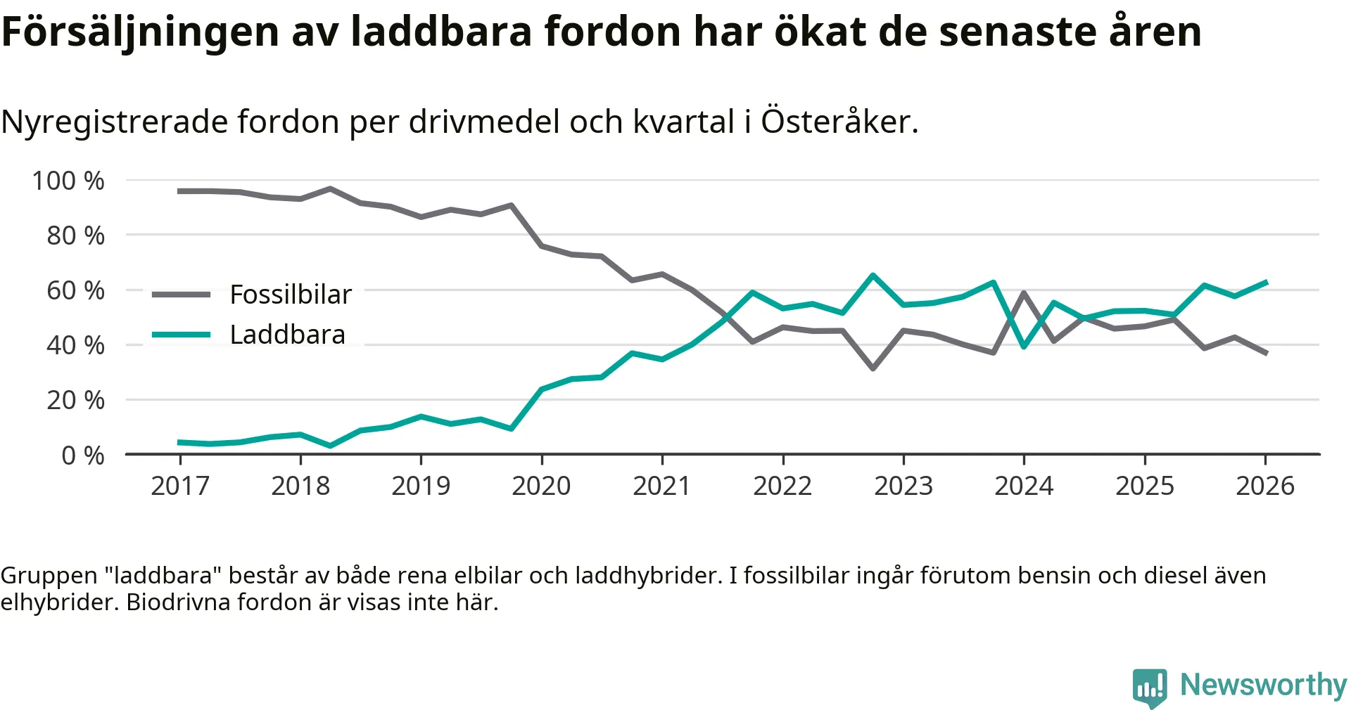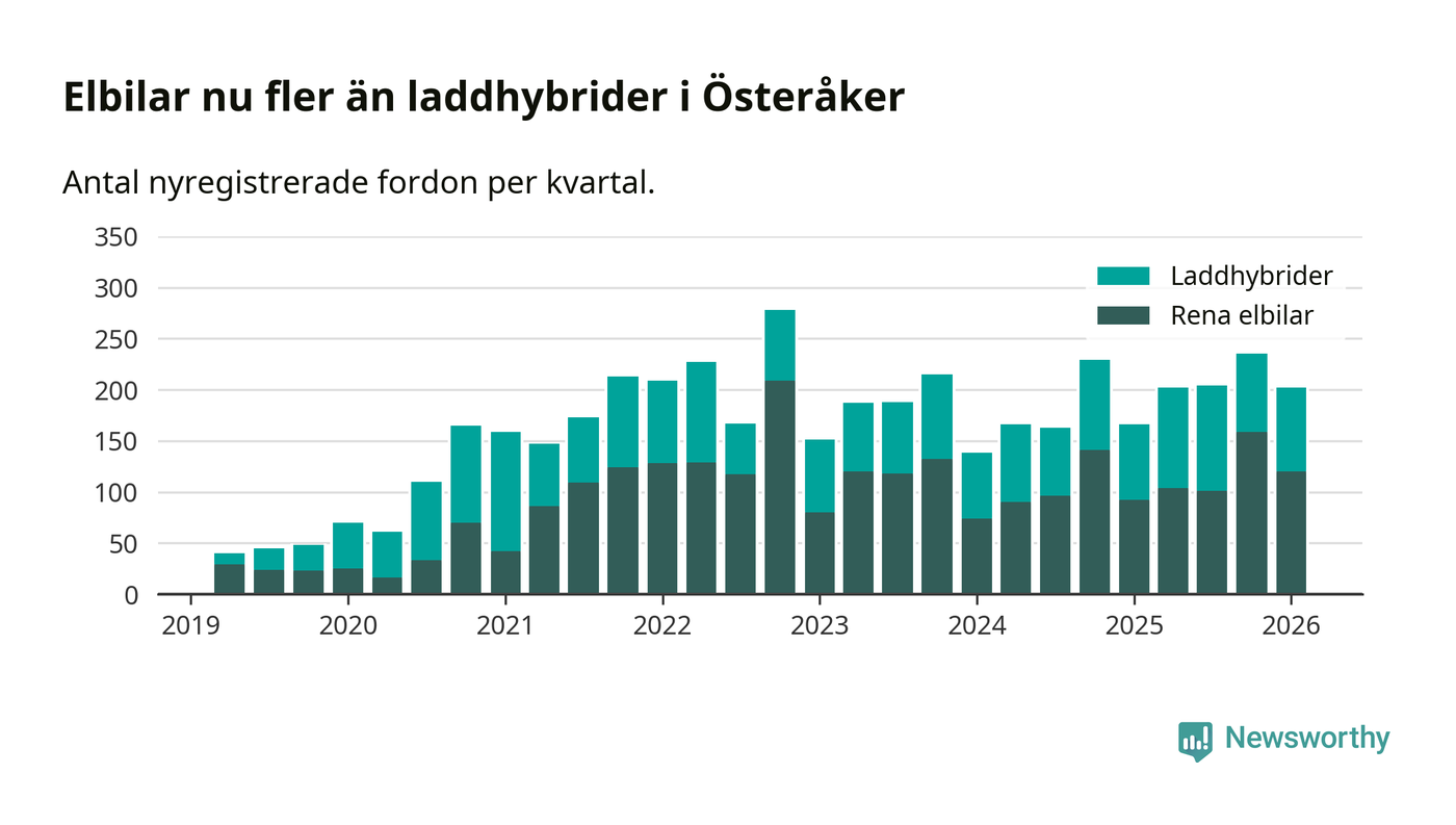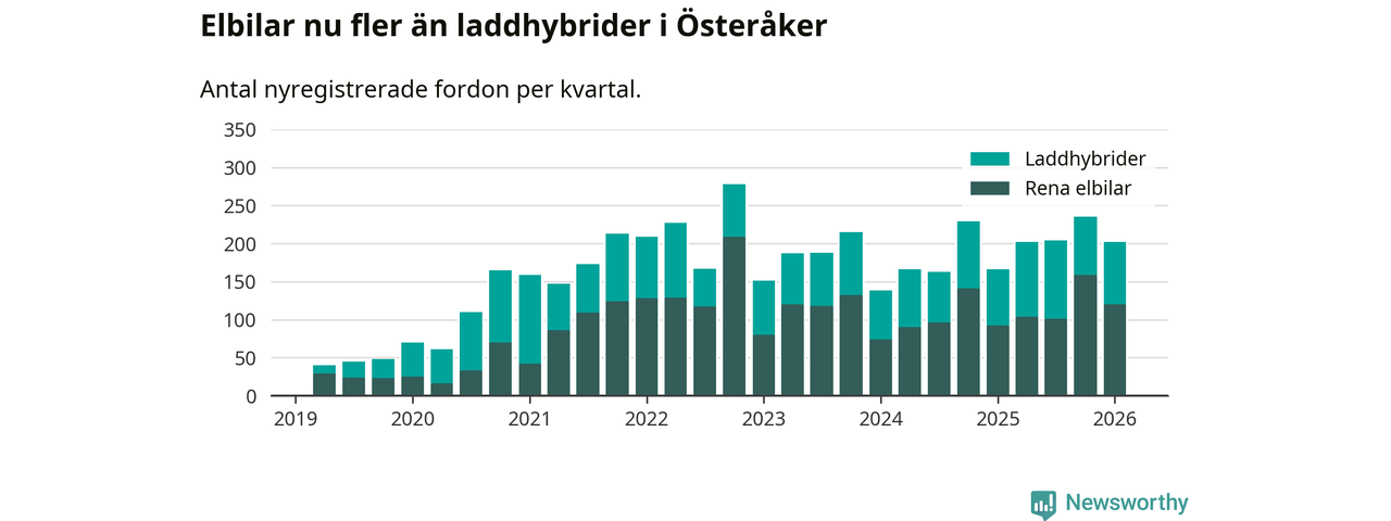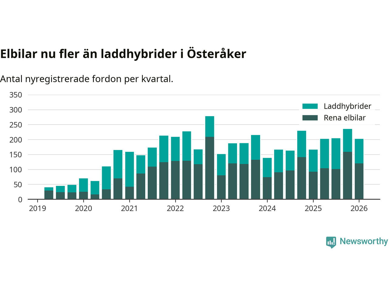 Under första kvartalet 2026 var 62 procent av alla nyregistrerade personbilar i Österåker laddbara (sammanlagt registrerades 324 nya bilar). Merparten av de laddbara bilarna var rena elbilar (37 procent av alla).