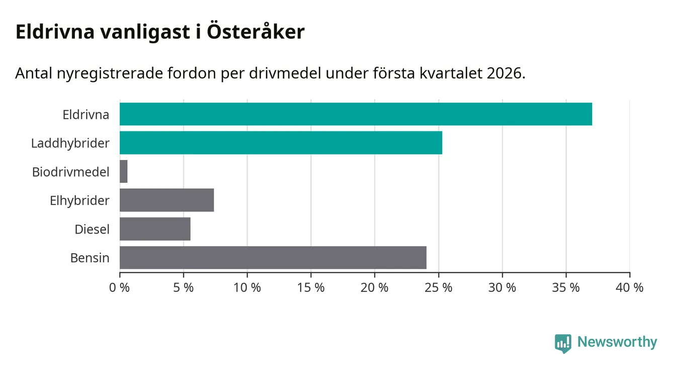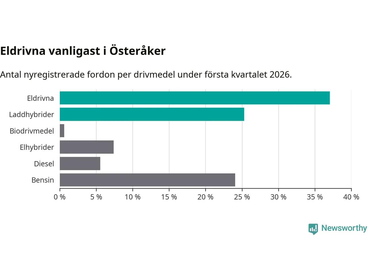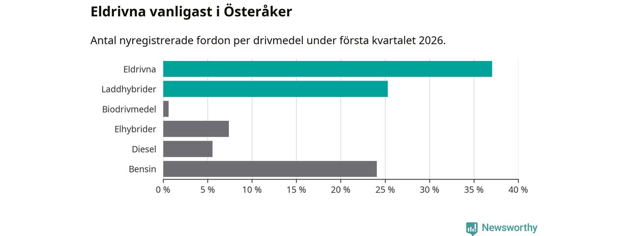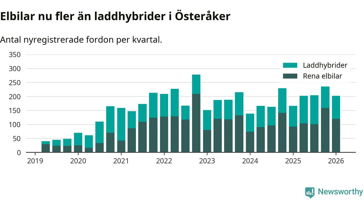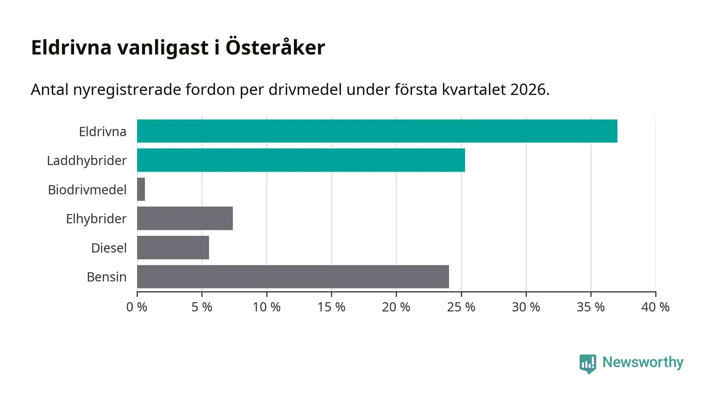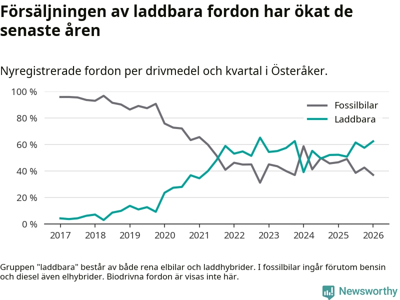 Under första kvartalet 2026 var 62 procent av alla nyregistrerade personbilar i Österåker laddbara (sammanlagt registrerades 324 nya bilar). Merparten av de laddbara bilarna var rena elbilar (37 procent av alla).