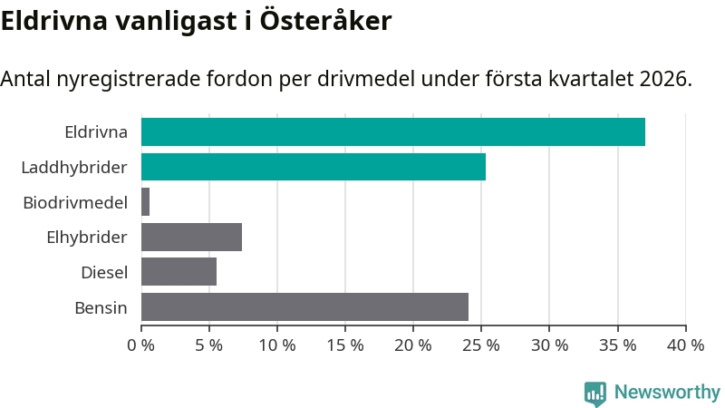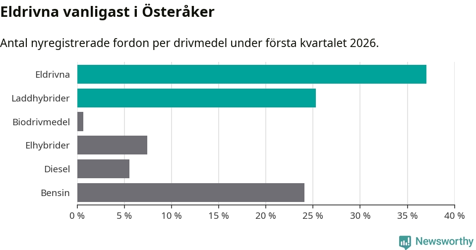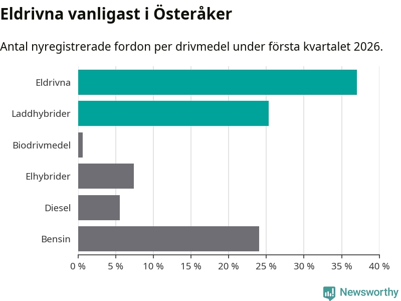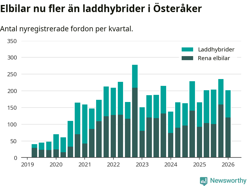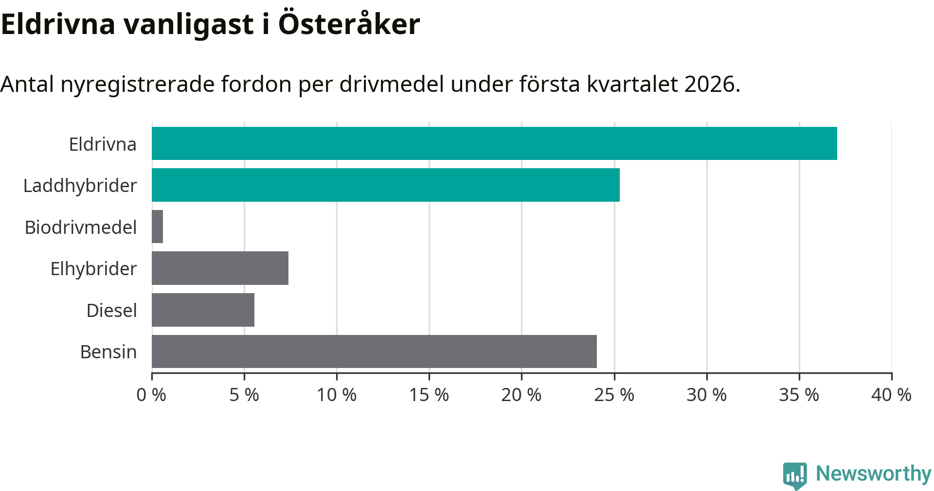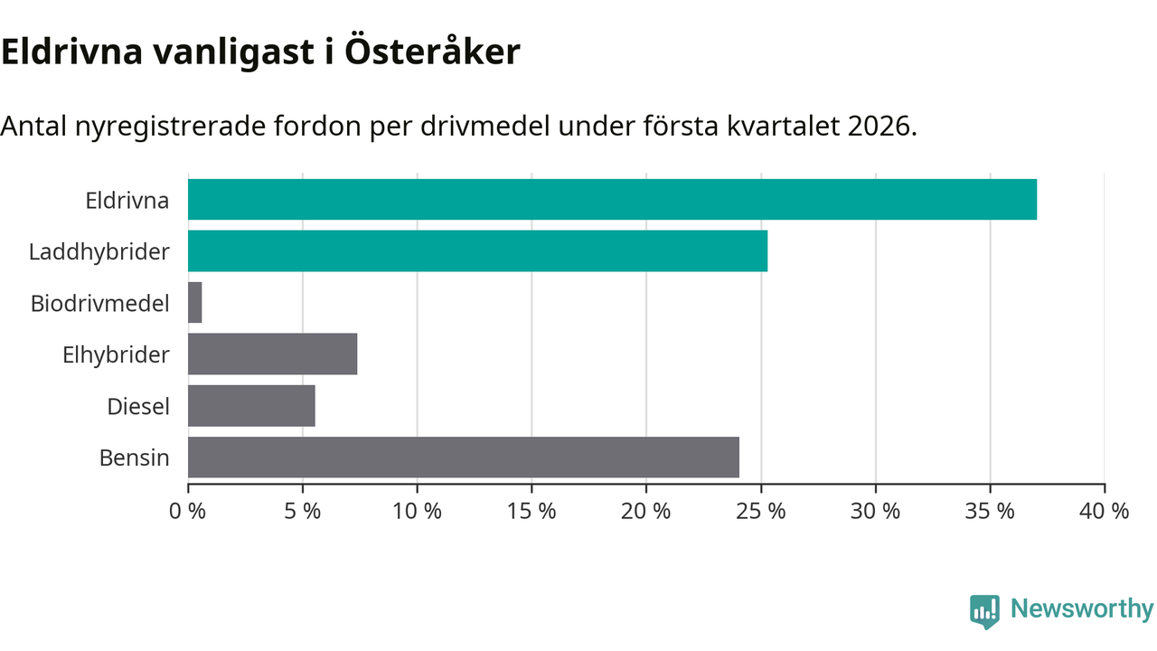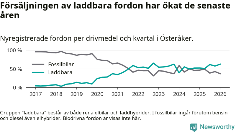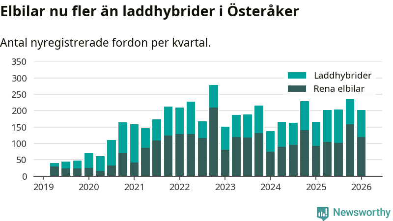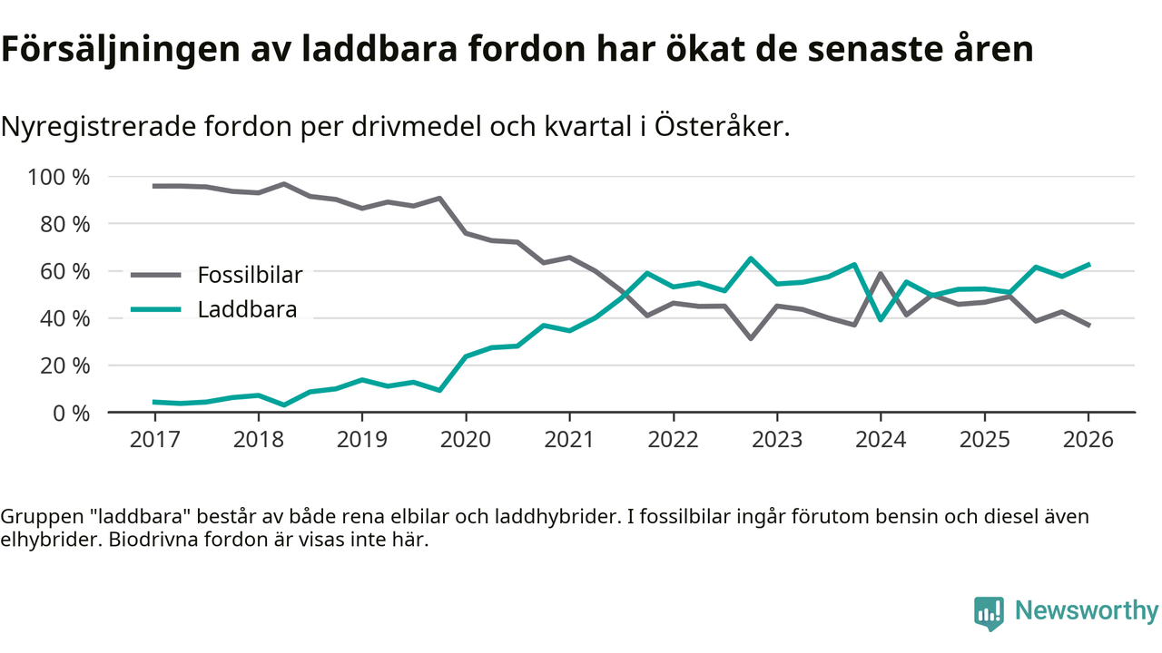Under första kvartalet 2026 var 62 procent av alla nyregistrerade personbilar i Österåker laddbara (sammanlagt registrerades 324 nya bilar). Merparten av de laddbara bilarna var rena elbilar (37 procent av alla).